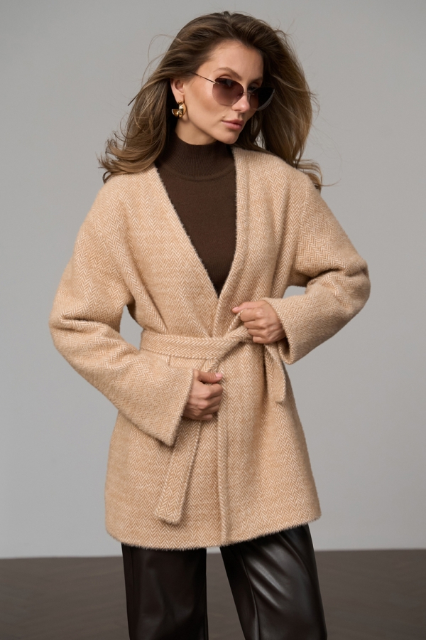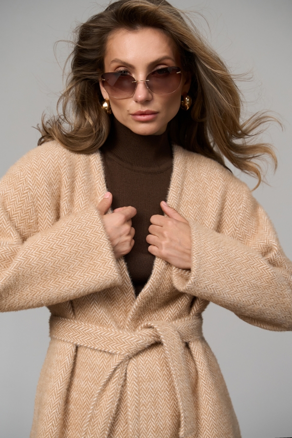 Тепле напівпальто з преміального трикотажу з включенням волокон віскози. Розпашний кардиган середньої щільності, гарно тримає форму. Пояс у комплекті.