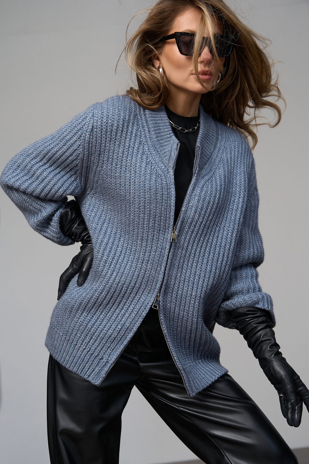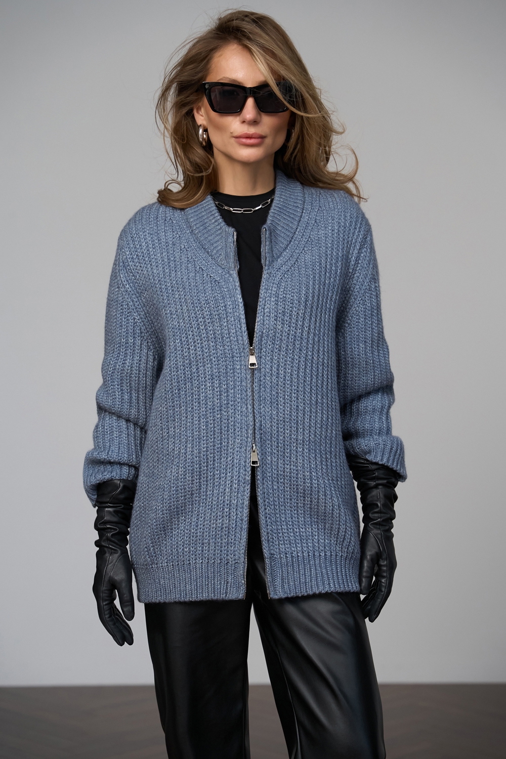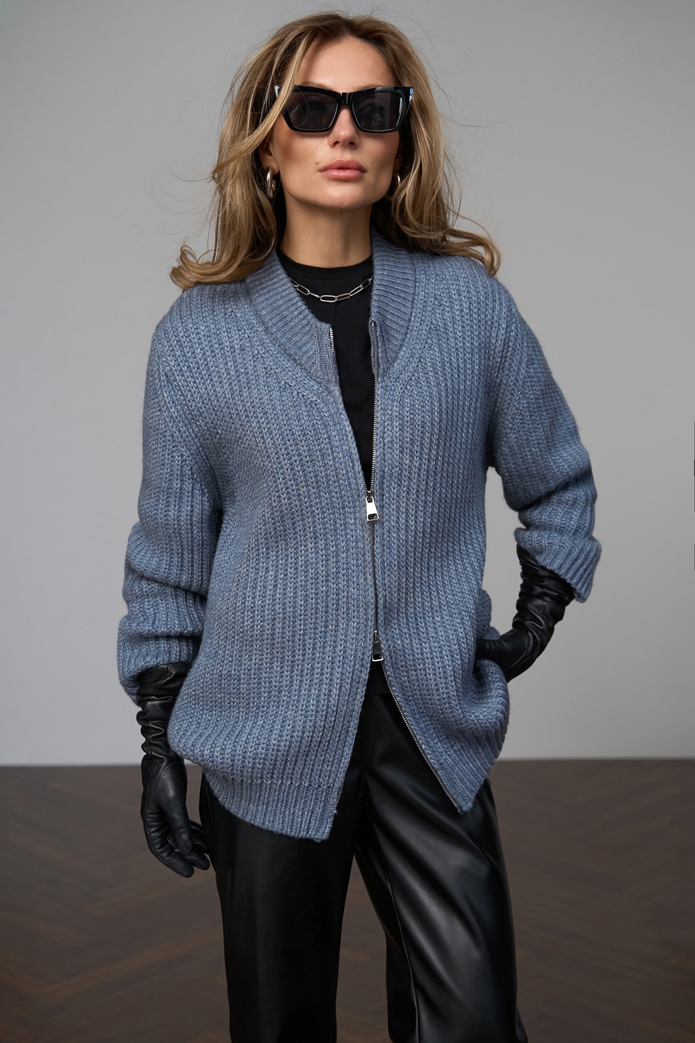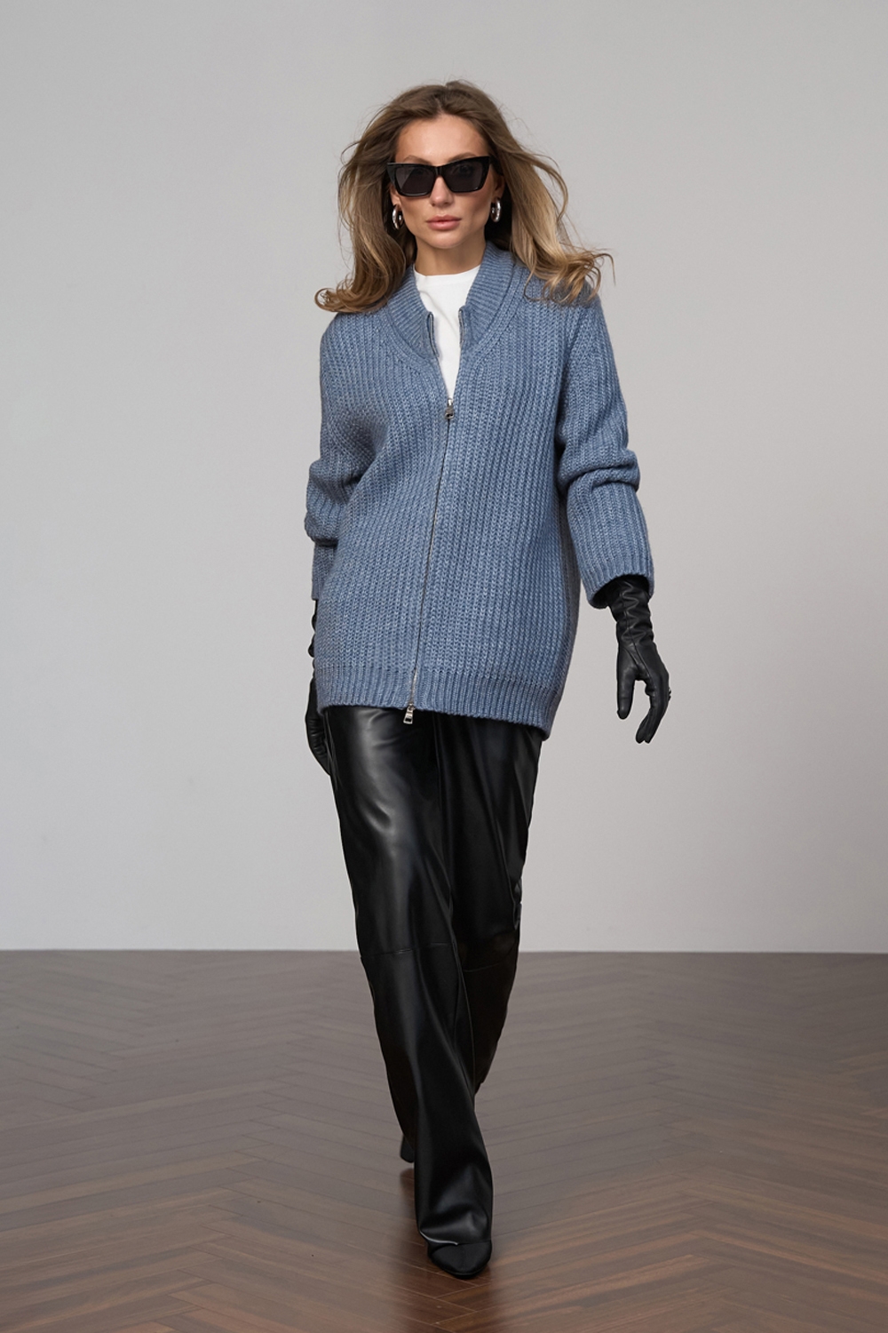Затишне напівпальто виконане з напіввовняної пряжі із включенням віскози. Об'ємна в'язка м'яко огортає фігуру. Виріб гарно тягнеться. Зручна застібка-блискавка додає комфорту.