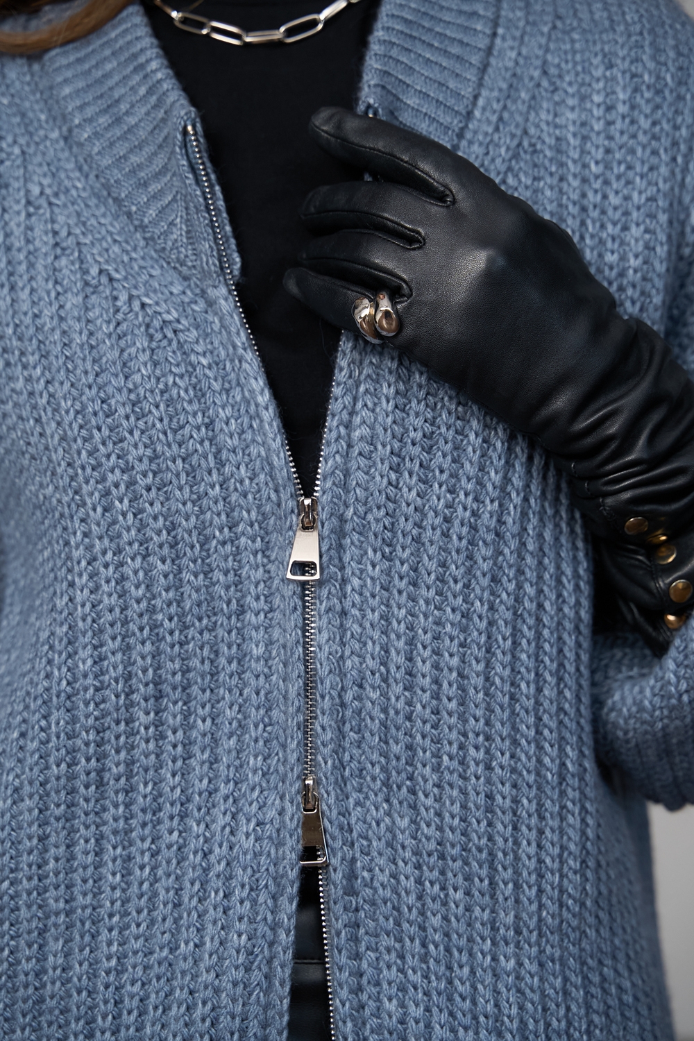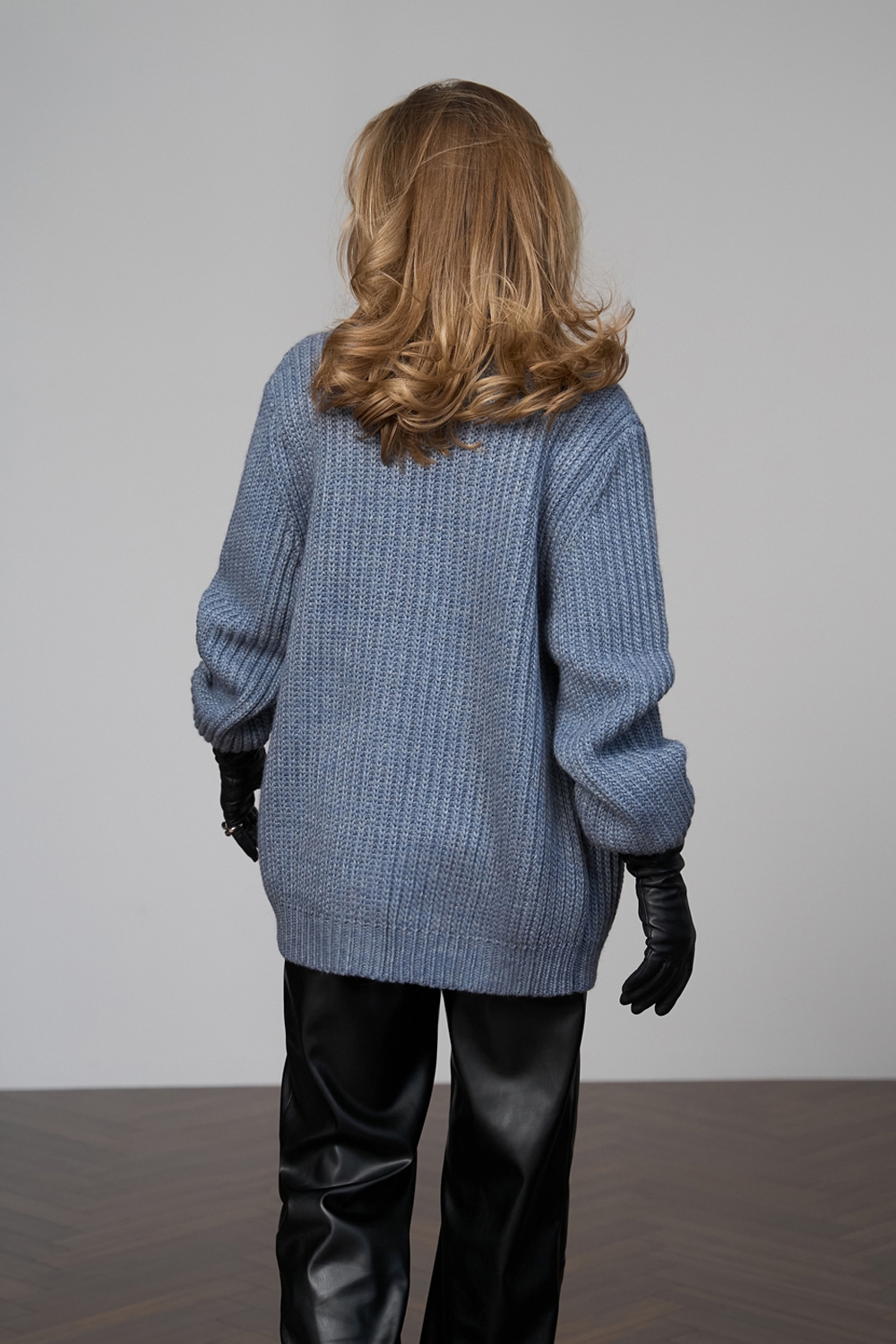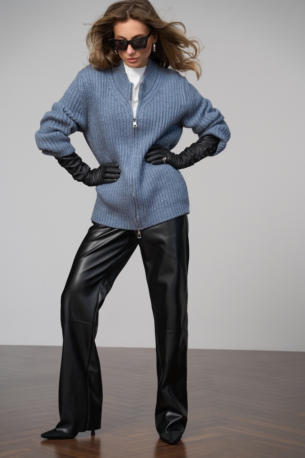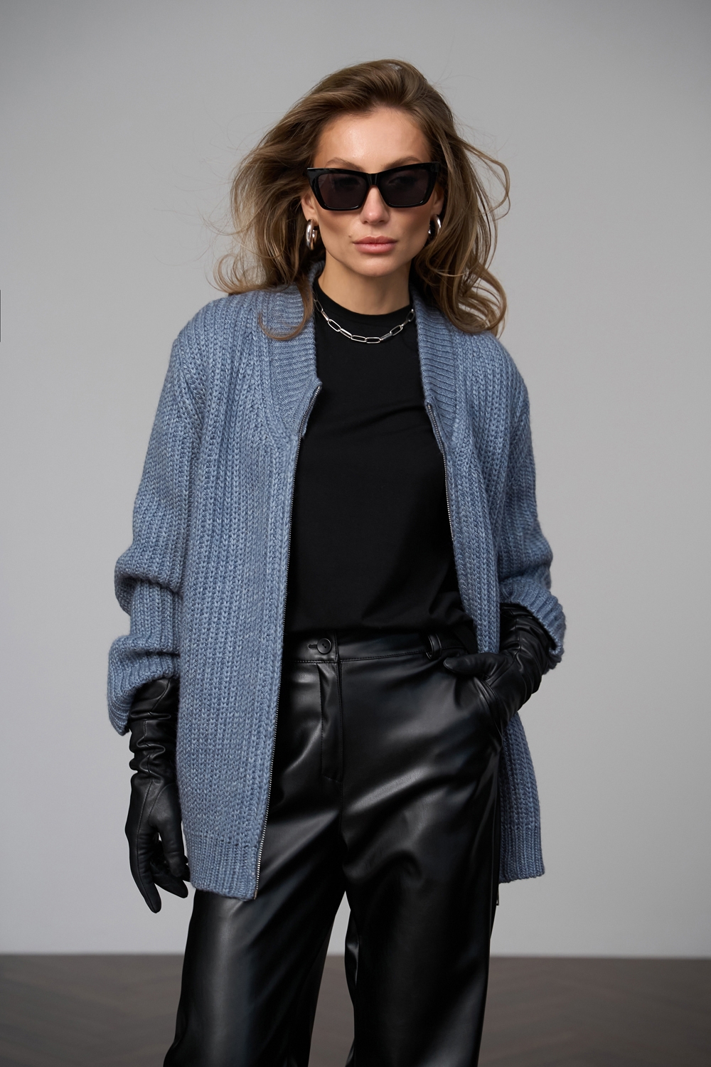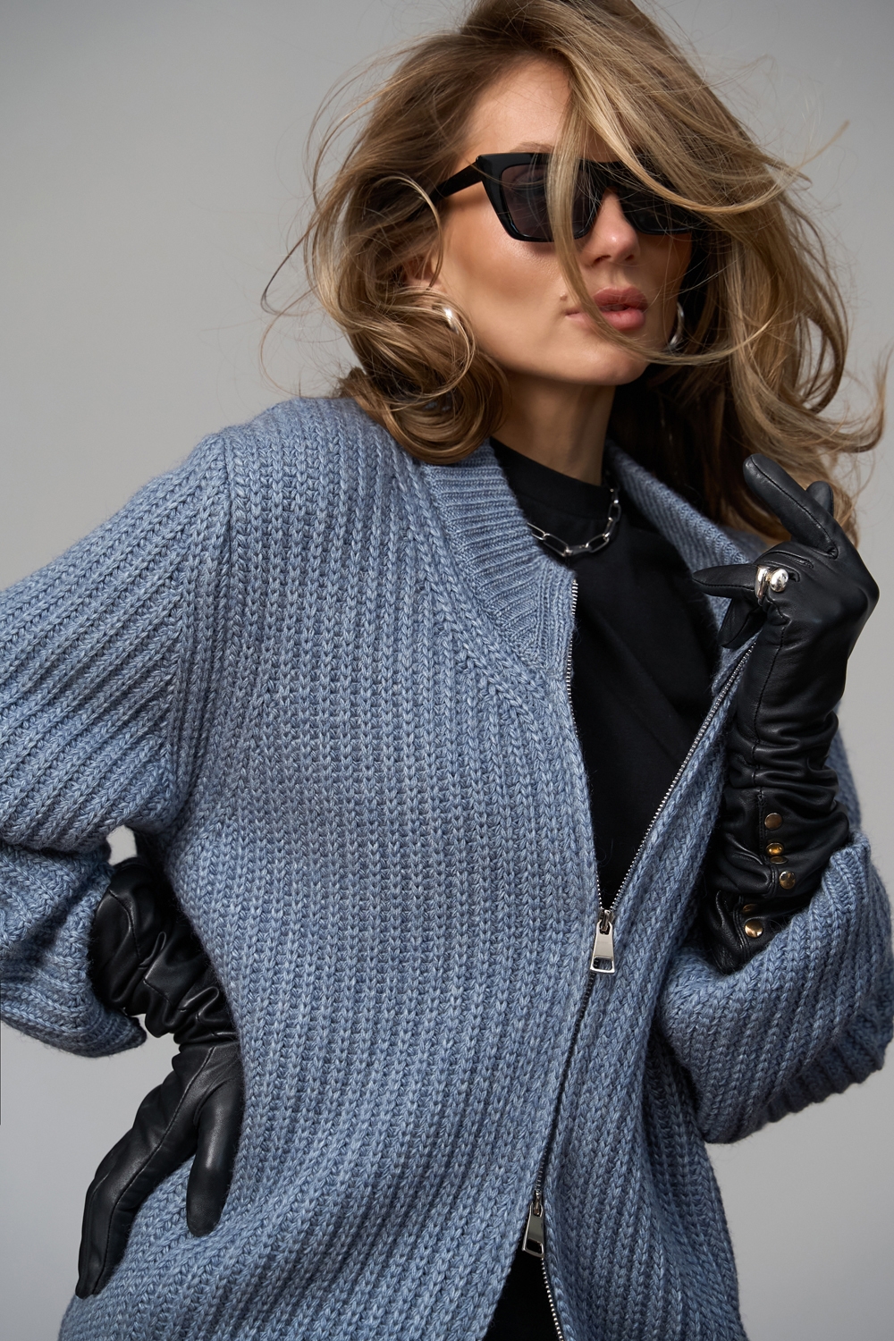 Затишне напівпальто виконане з напіввовняної пряжі із включенням віскози. Об'ємна в'язка м'яко огортає фігуру. Виріб гарно тягнеться. Зручна застібка-блискавка додає комфорту.