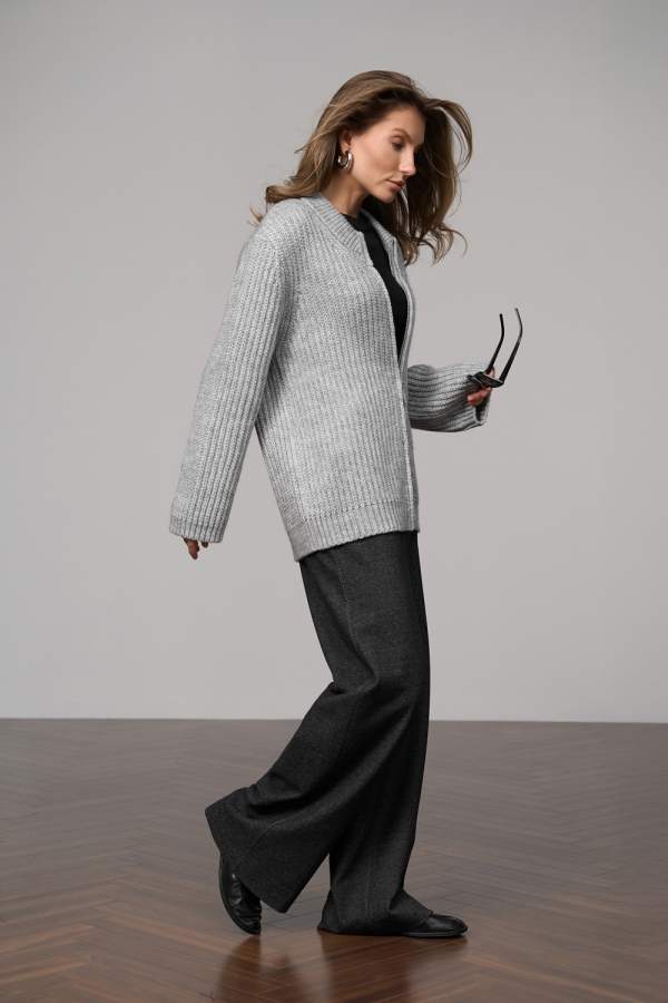 Затишне напівпальто виконане з напіввовняної пряжі із включенням віскози. Об'ємна в'язка м'яко огортає фігуру. Виріб гарно тягнеться. Зручна застібка-блискавка додає комфорту.
