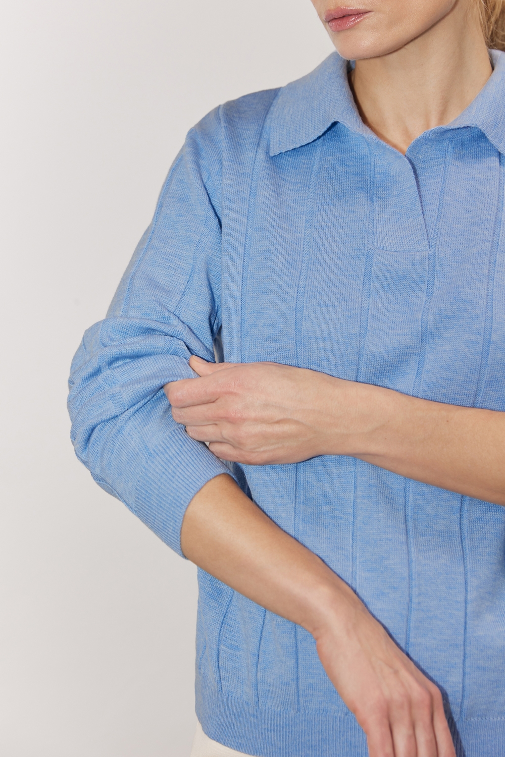 Базове поло виготовлене з вовни мериноса з додаванням кашеміру. Модель виконана стабільною в’язкою середньої щільності та оздоблена візерунком у вертикальну смужку. На рукавах і по низу виробу - еластичні манжети.