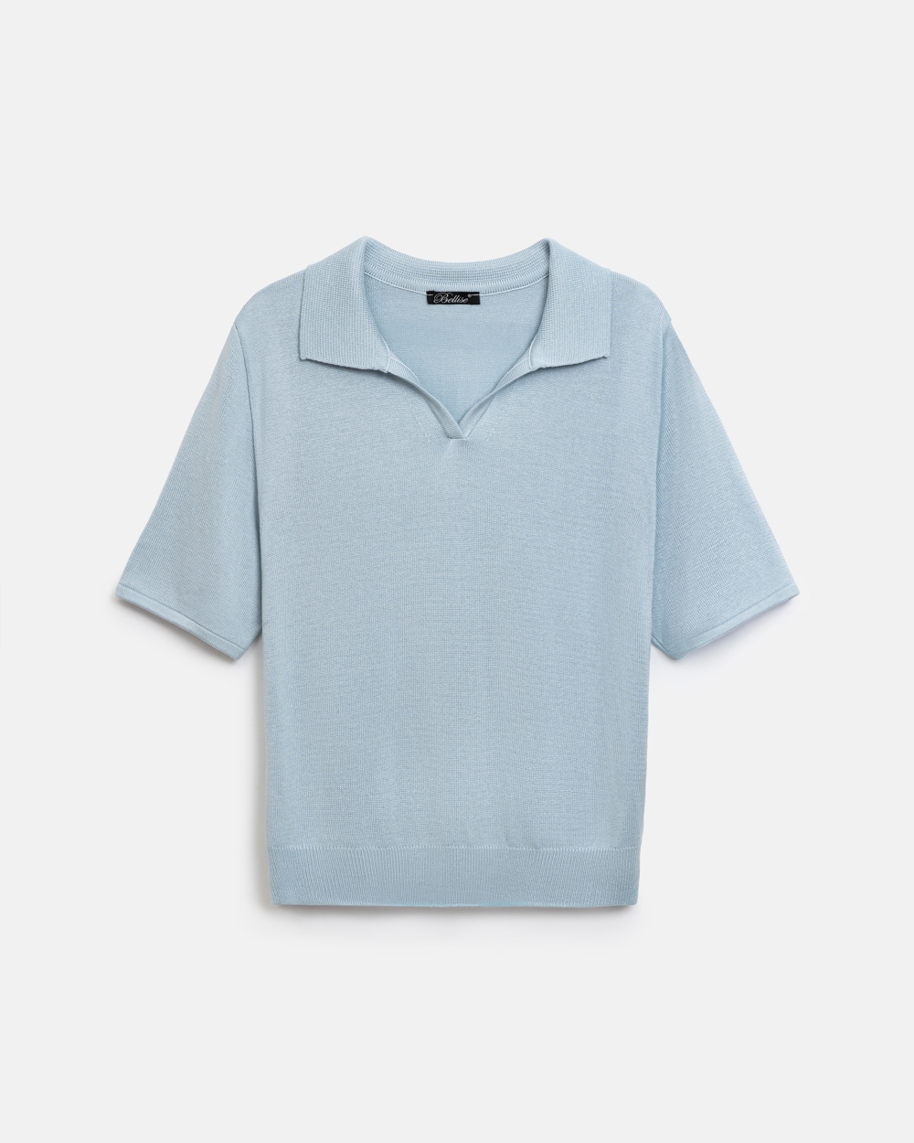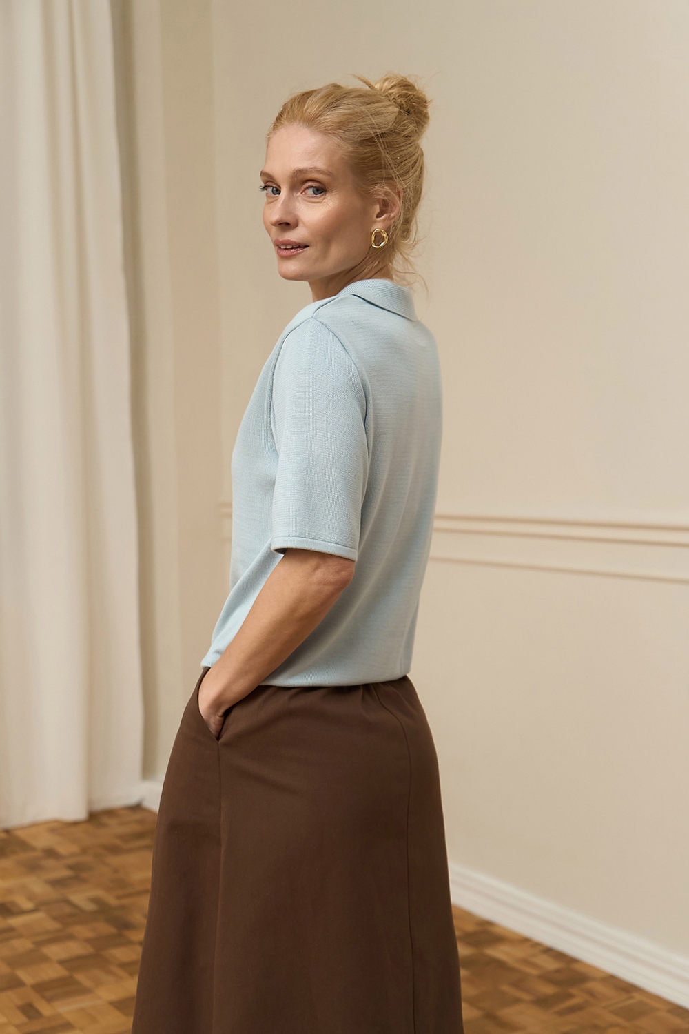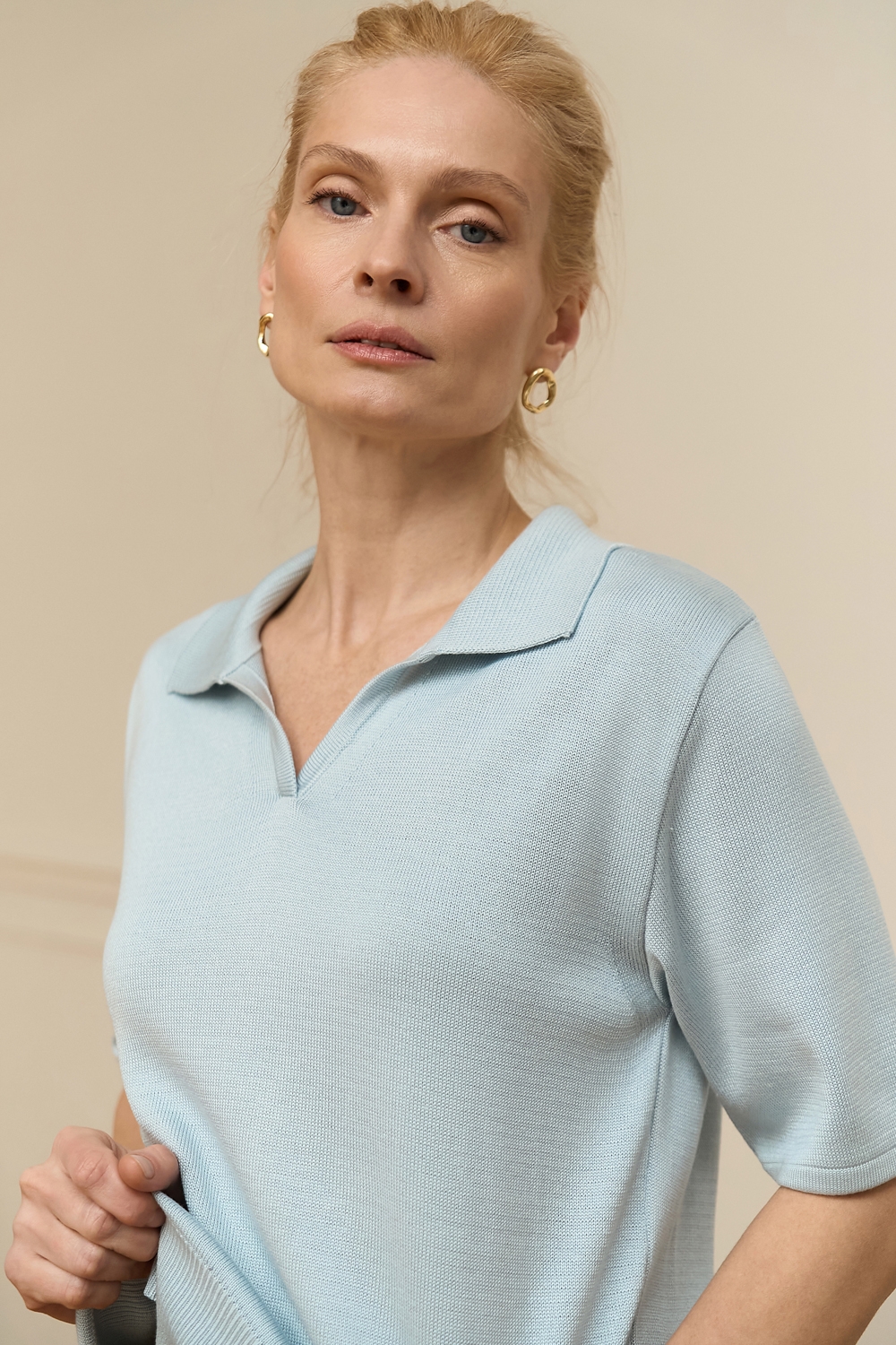 Актуальне поло вільного силуету виконане з гладкої, приємної до тіла віскозної пряжі з додаванням бавовни. Низ виробу доповнений фіксуючою резинкою.