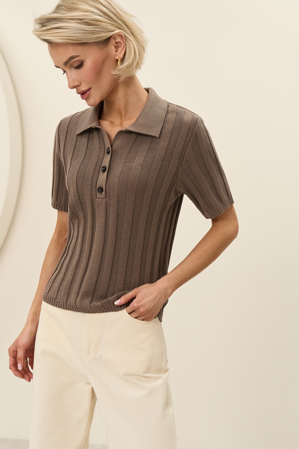 Актуальне поло виготовлене із бавовняної пряжі з додаванням віскози, м'яке приємне до тіла, еластичне. Модель доповнена фактурної в'язкою у вертикальну смужку.