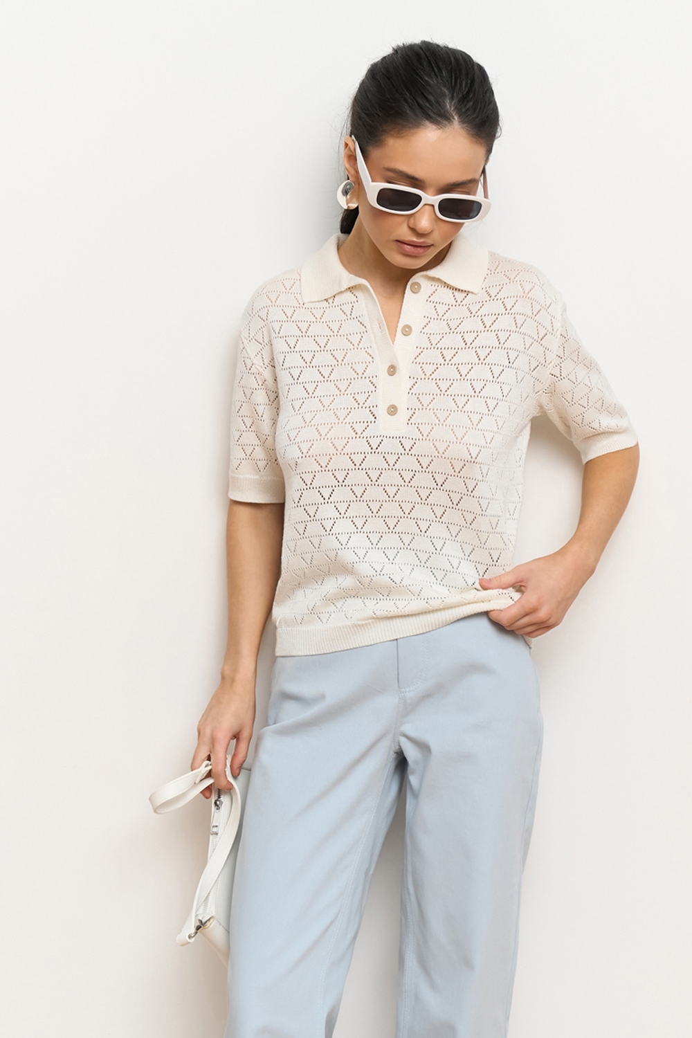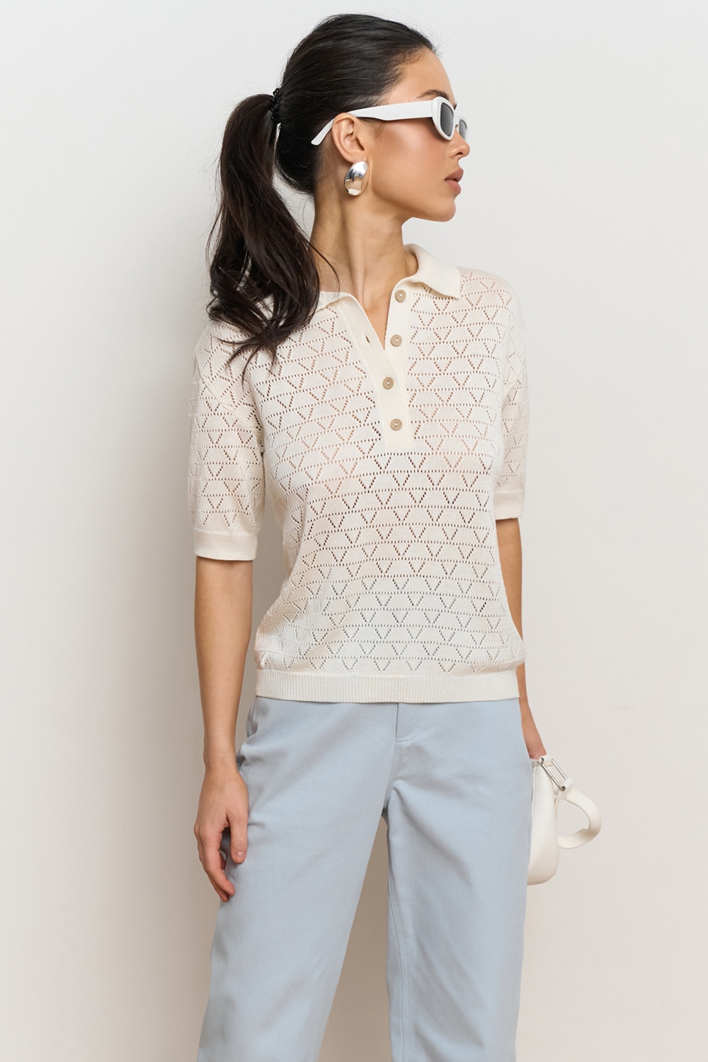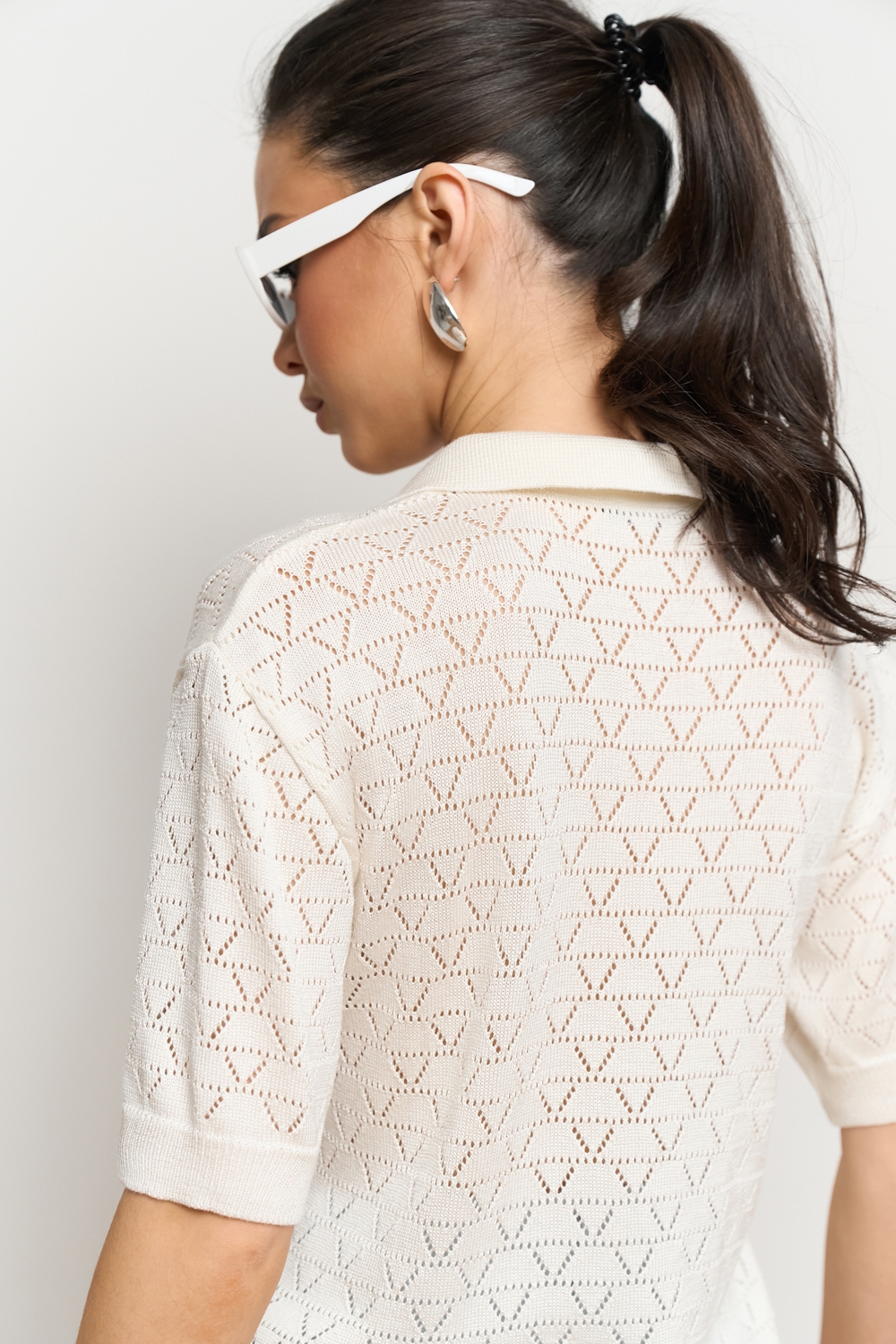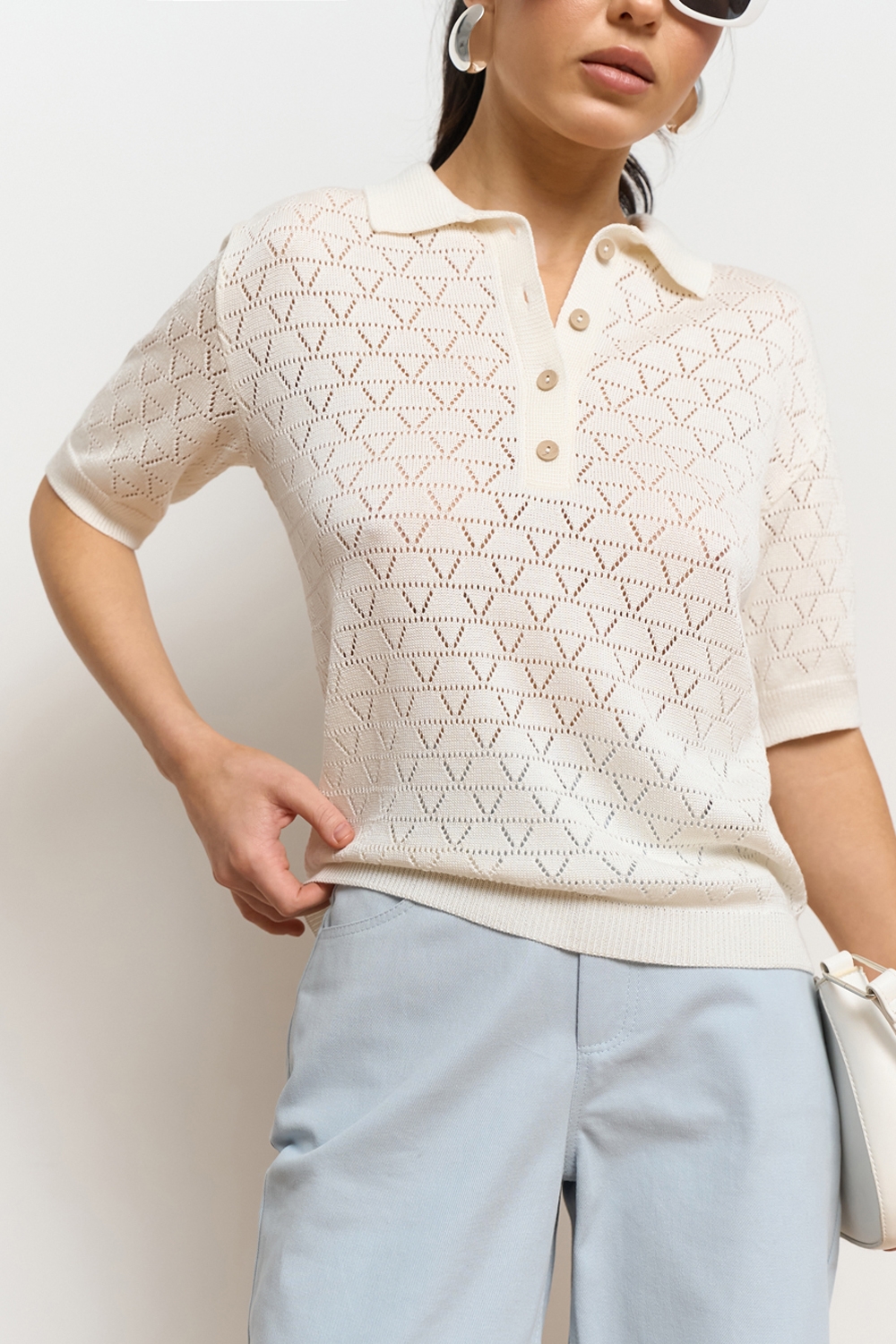 Ажурне поло з віскозної пряжі з додаванням бавовни. Модель виконана еластичною в’язкою, приємна до тіла.