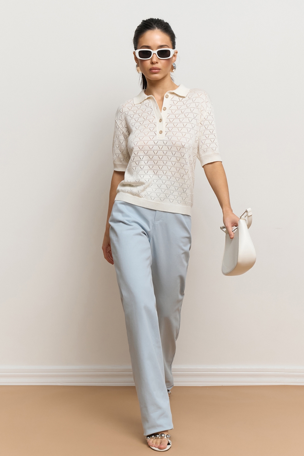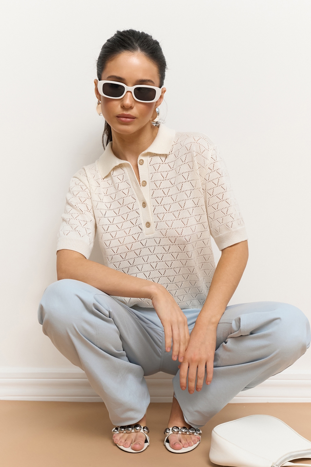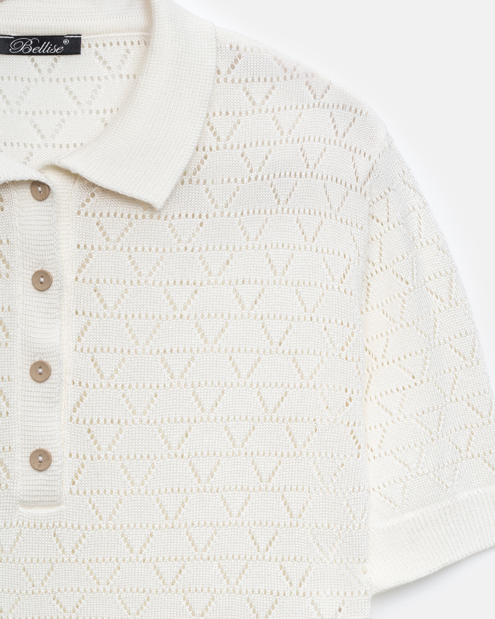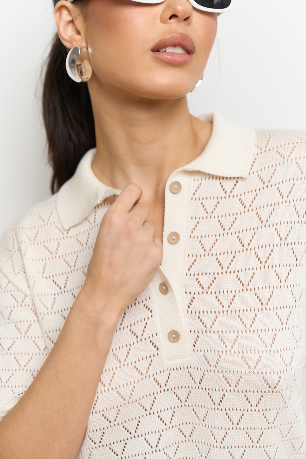Ажурне поло з віскозної пряжі з додаванням бавовни. Модель виконана еластичною в’язкою, приємна до тіла.
