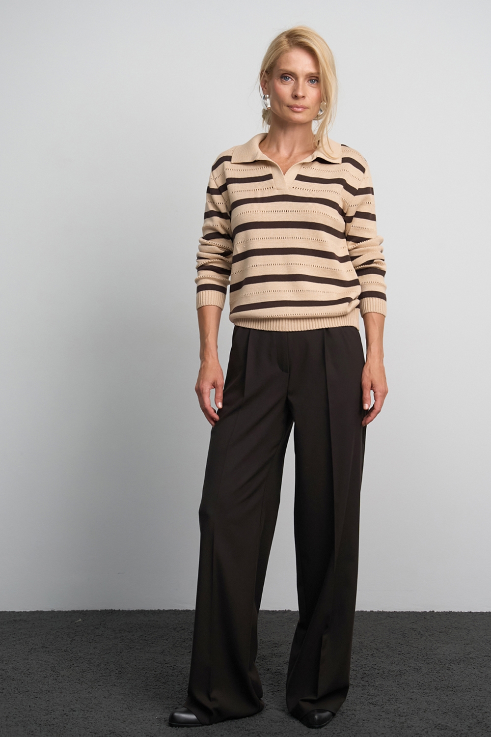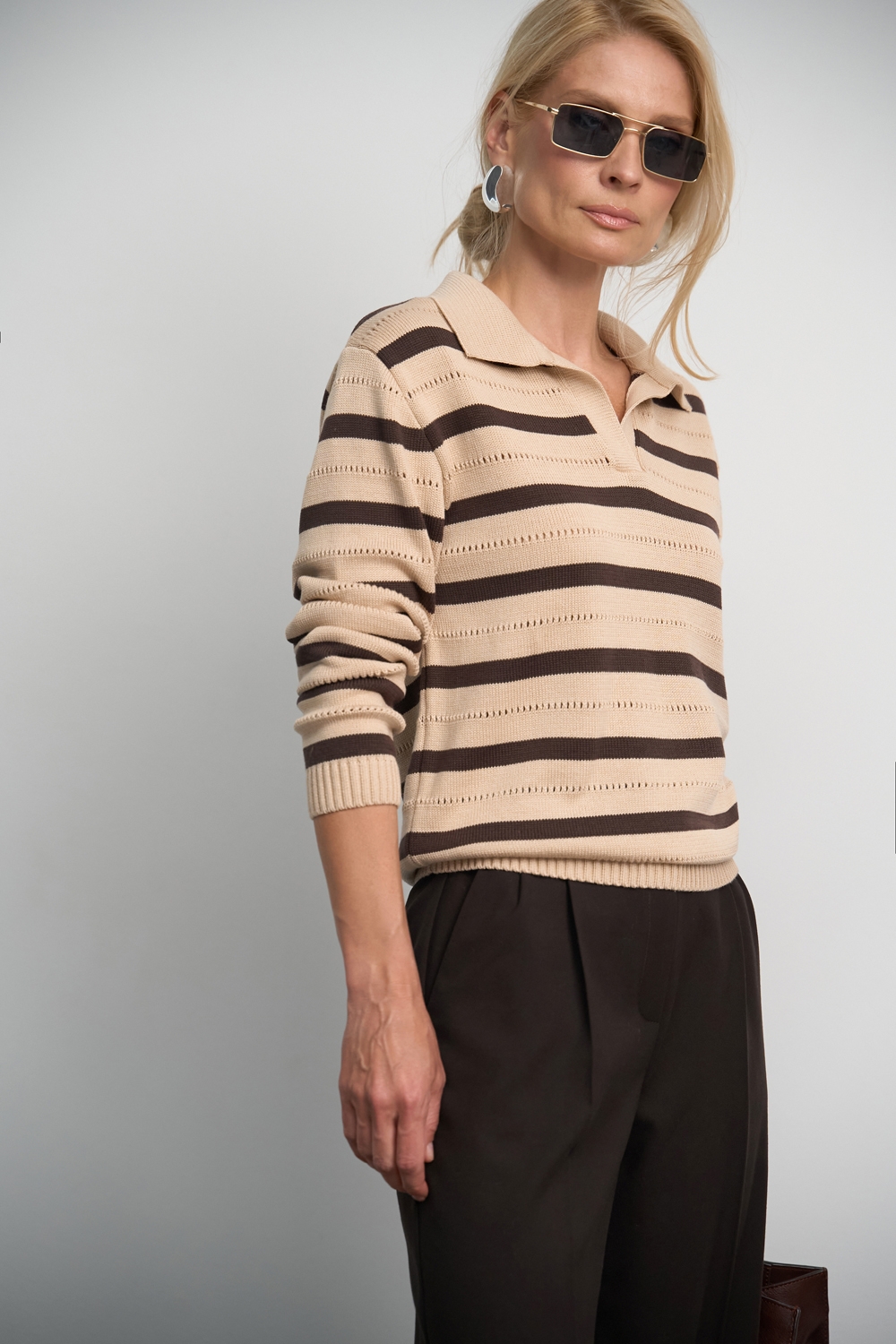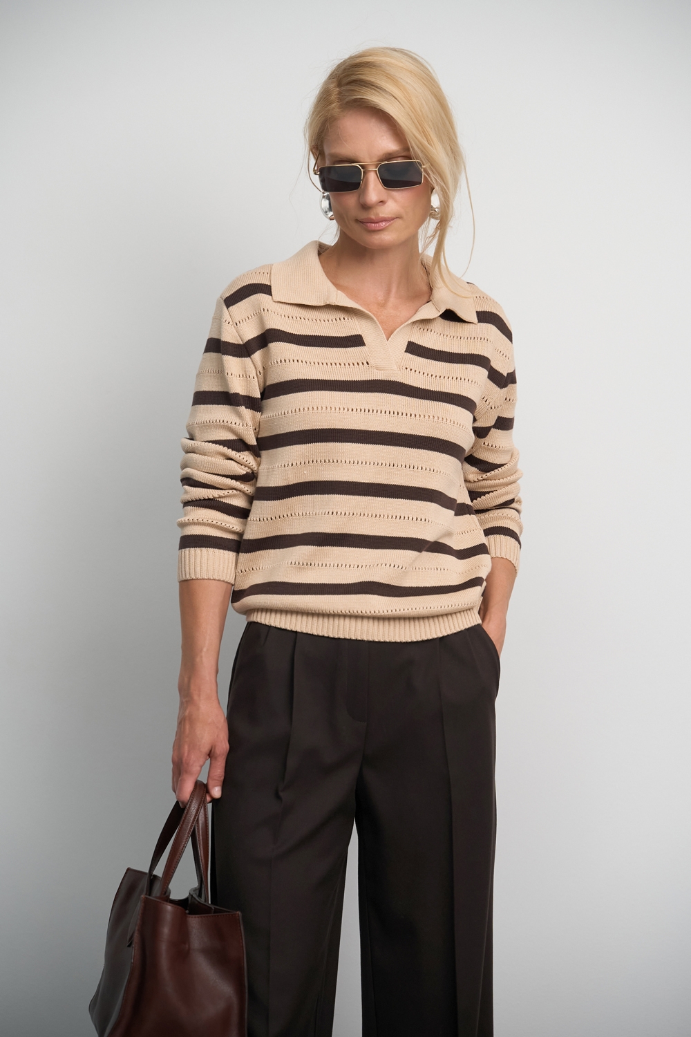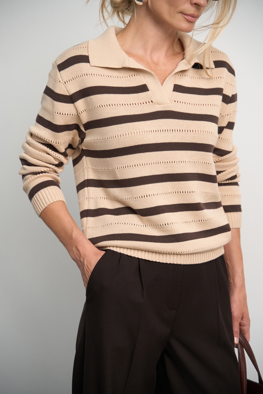 Актуальний джемпер поло виконаний з приємної до тіла пряжі з високим вмістом бавовни та віскози. Спущена лінія плеча створює розслаблений силует.