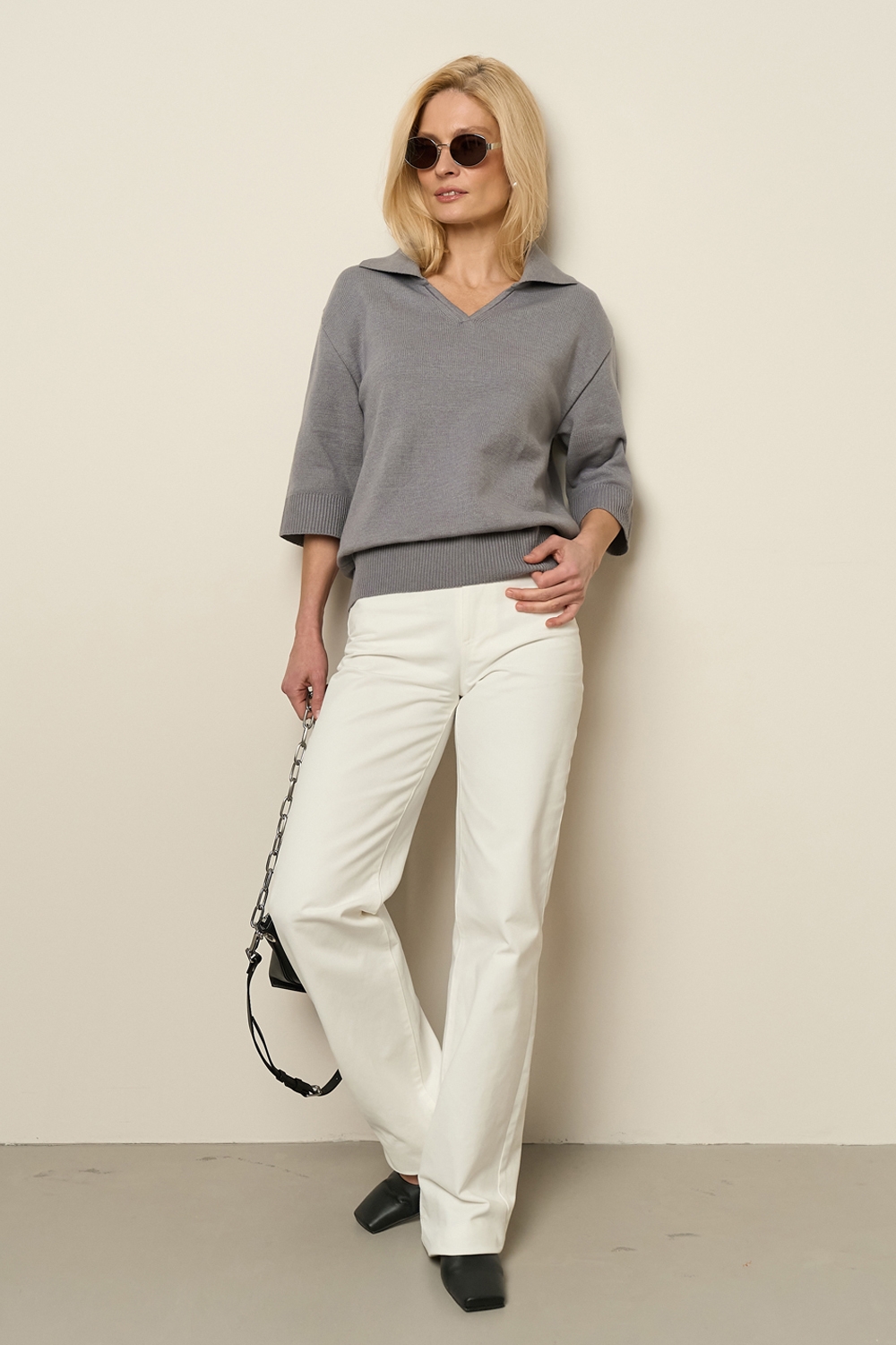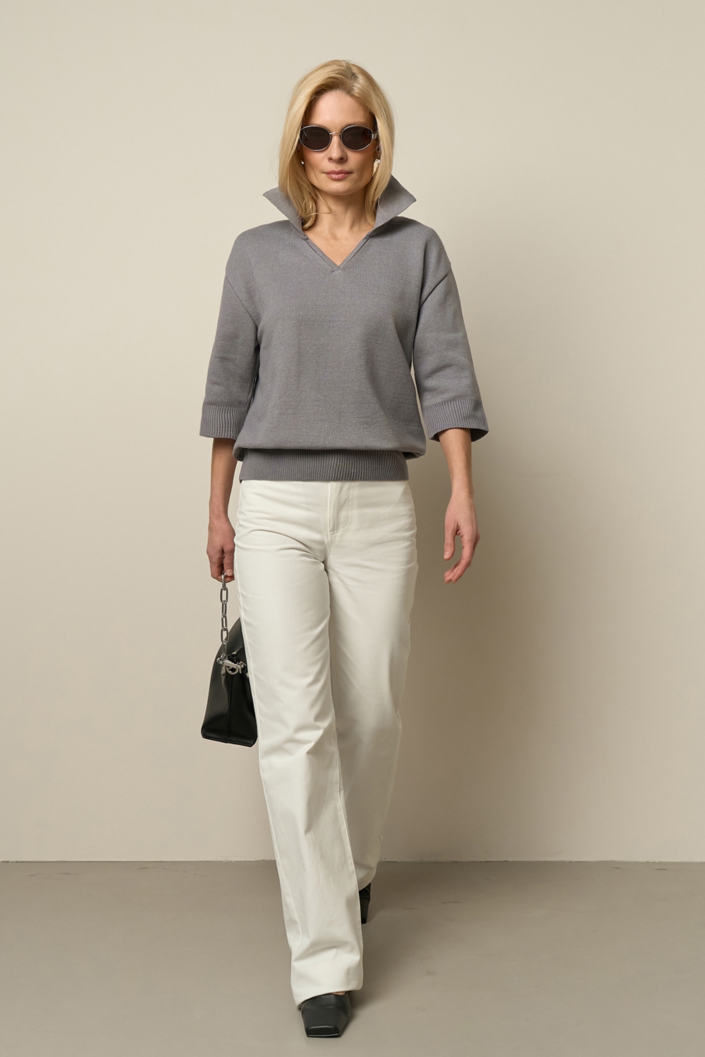 Поло вільного крою з м'якої та приємної до тіла бавовняної пряжі з включенням лайкри. Виконане в стабільному тонкому переплетінні, гарно тримає форму. Рукави та низ виробу оздоблені манжетами.