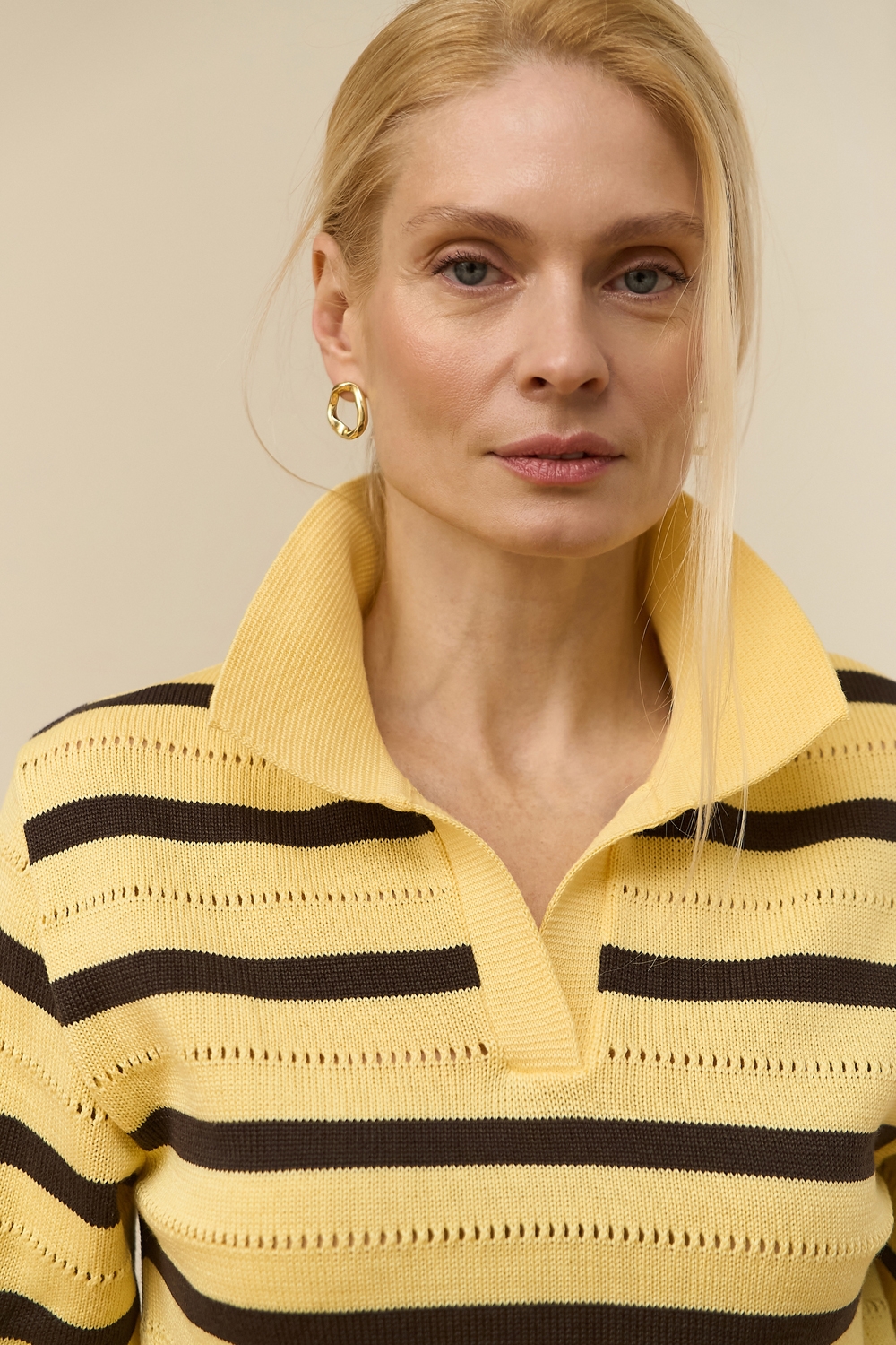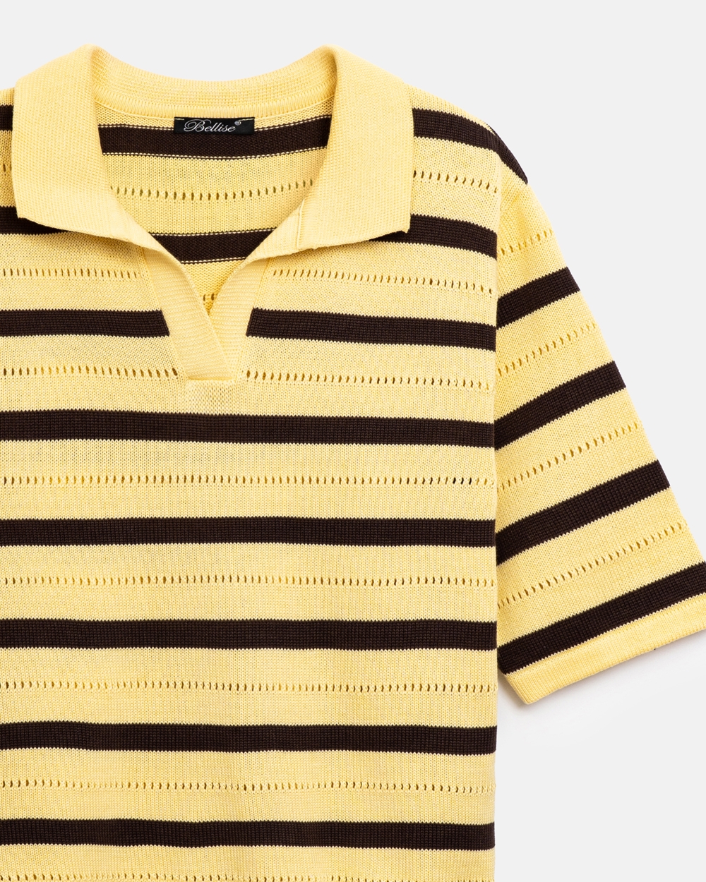 Актуальне поло виготовлене з бавовняно-віскозної пряжі. Зручний вільний силует, комфортний короткий рукав. Модель доповнена мінімалістичним горизонтальним візерунком.