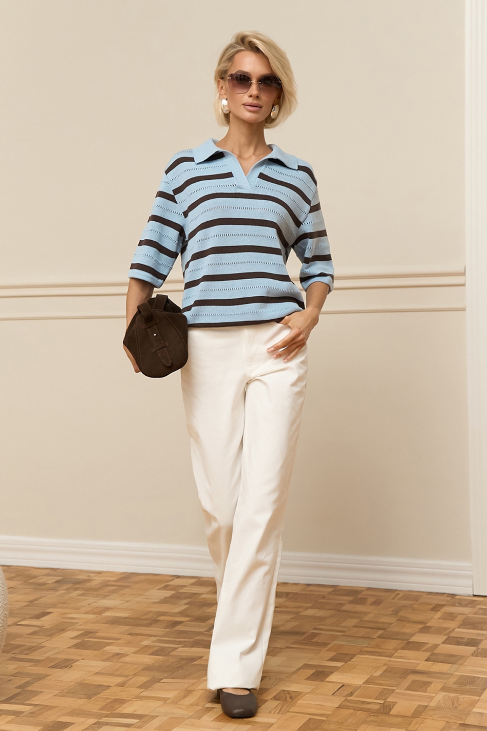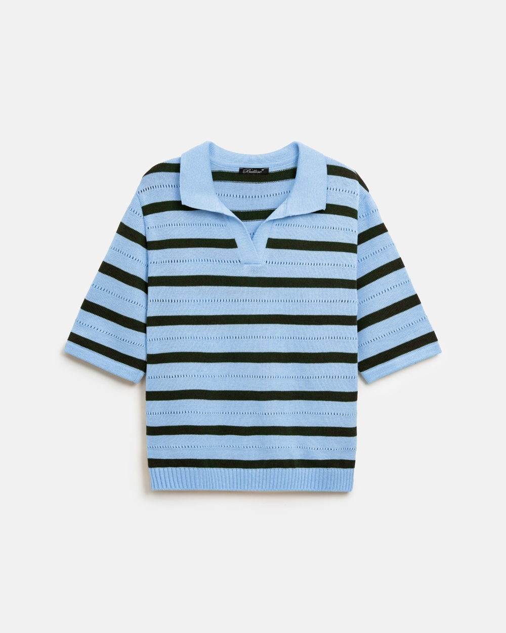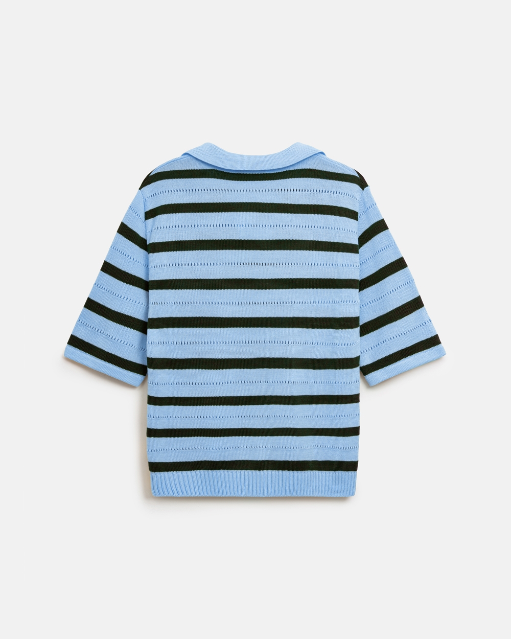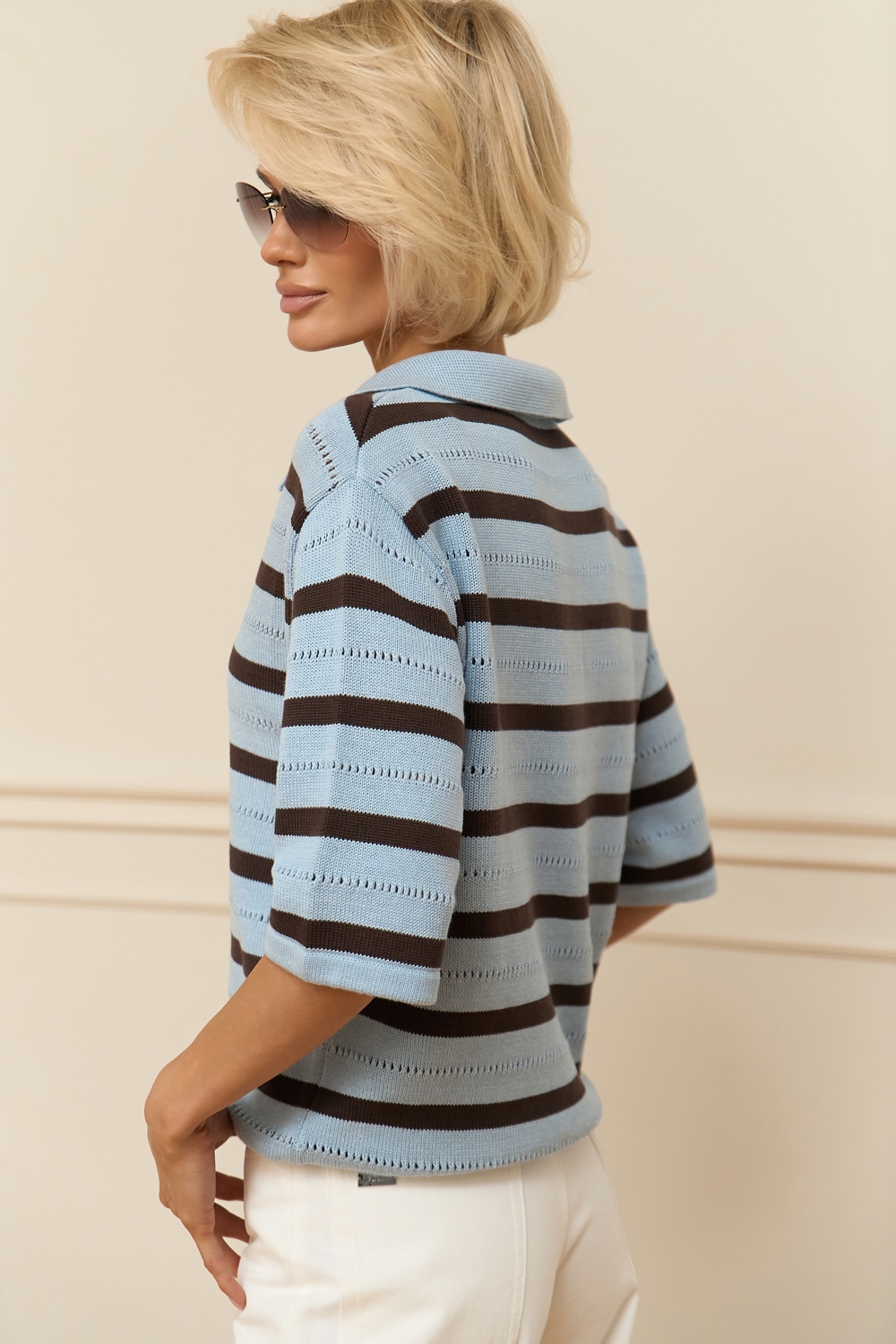 Актуальне поло виготовлене з бавовняно-віскозної пряжі. Зручний вільний силует, комфортний короткий рукав. Модель доповнена мінімалістичним горизонтальним візерунком.