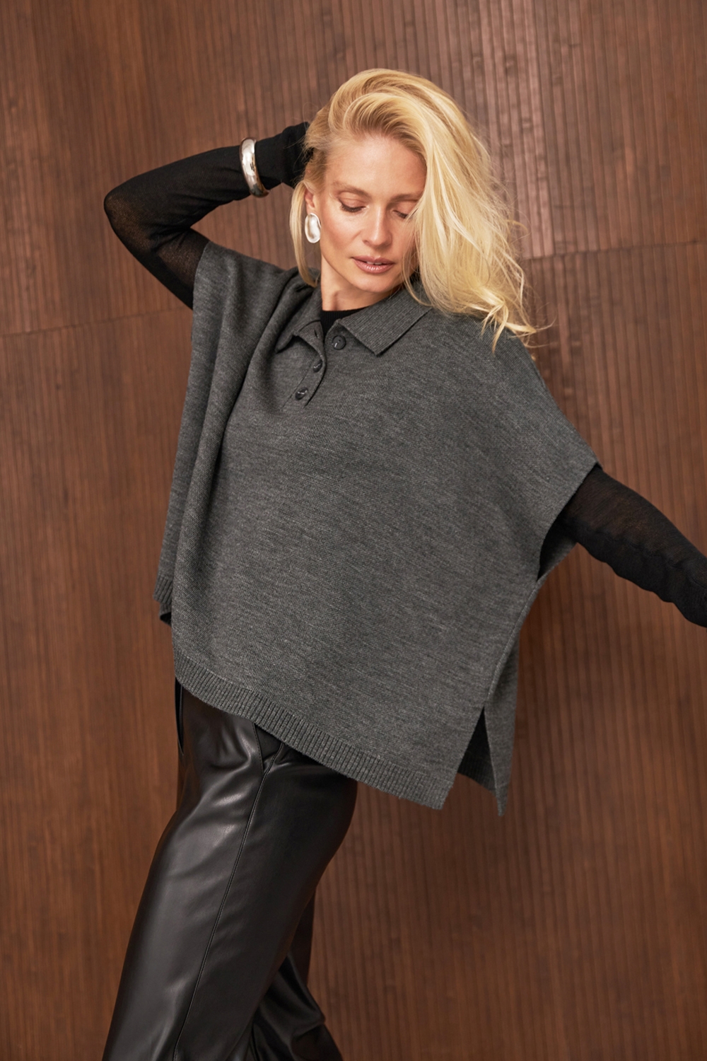 Затишне напіввовняне пончо вільного силуету виконане щільною в’язкою, приємне до тіла. Комірець поло та бокові розрізи додають елегантності.