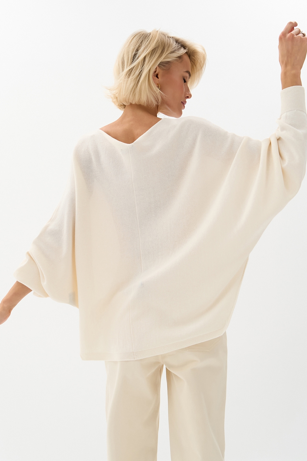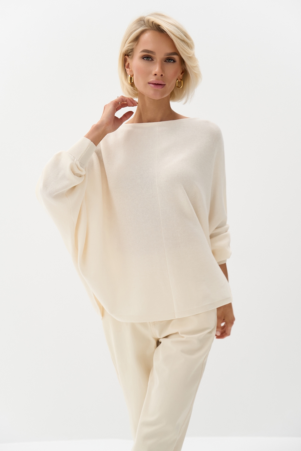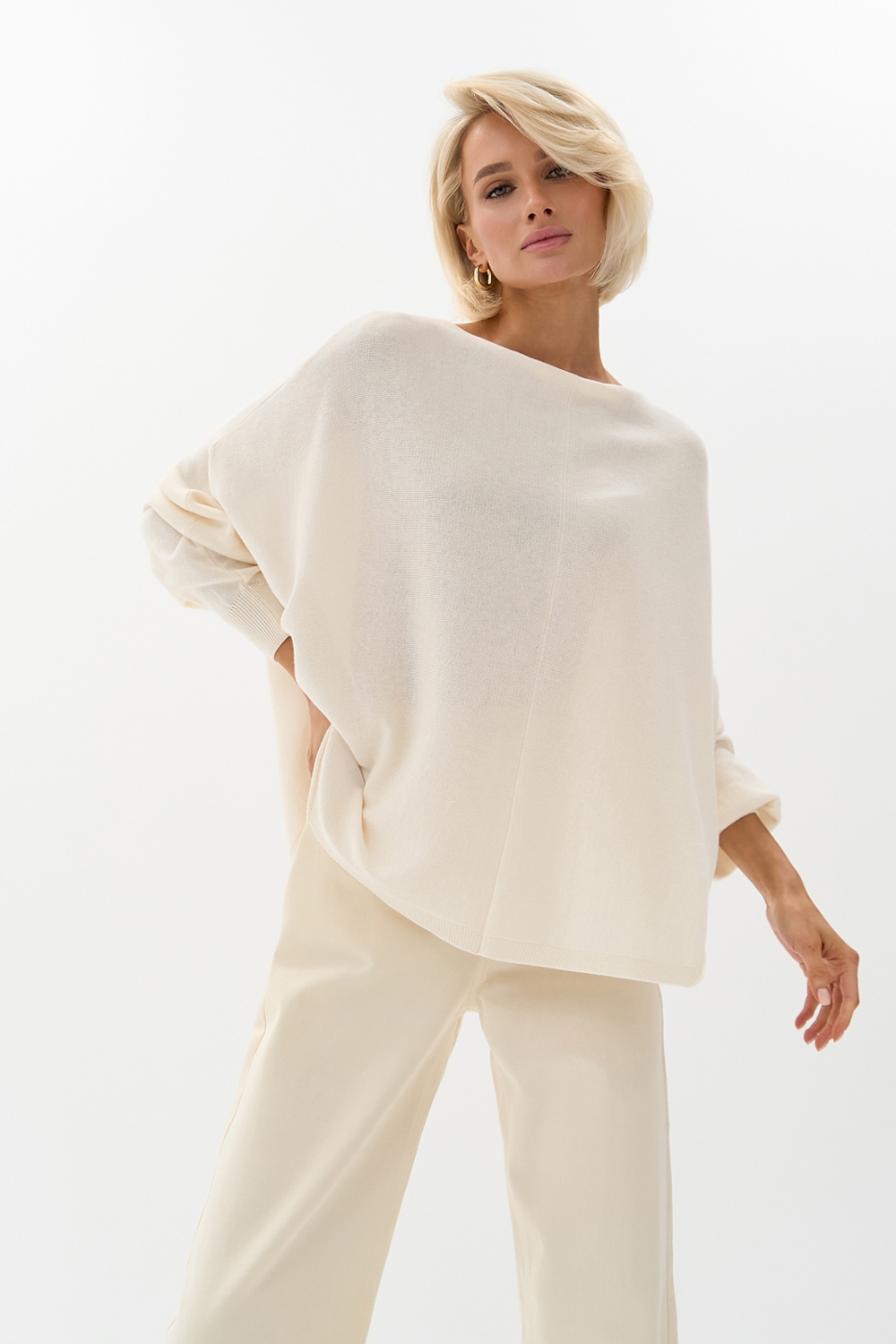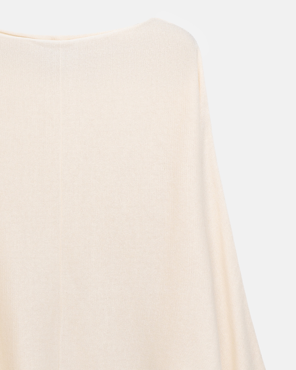 Елегантне пончо фасону «летюча миша» з горловиною-човником, виконане гладкою, напівпрозорою в’язкою з преміальної пряжі із включенням віскози, бавовни та бамбука.
