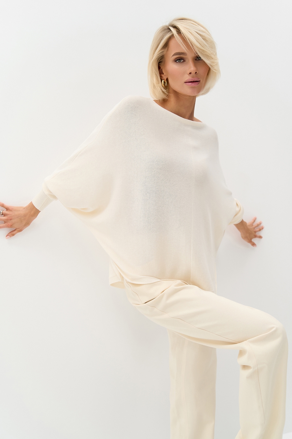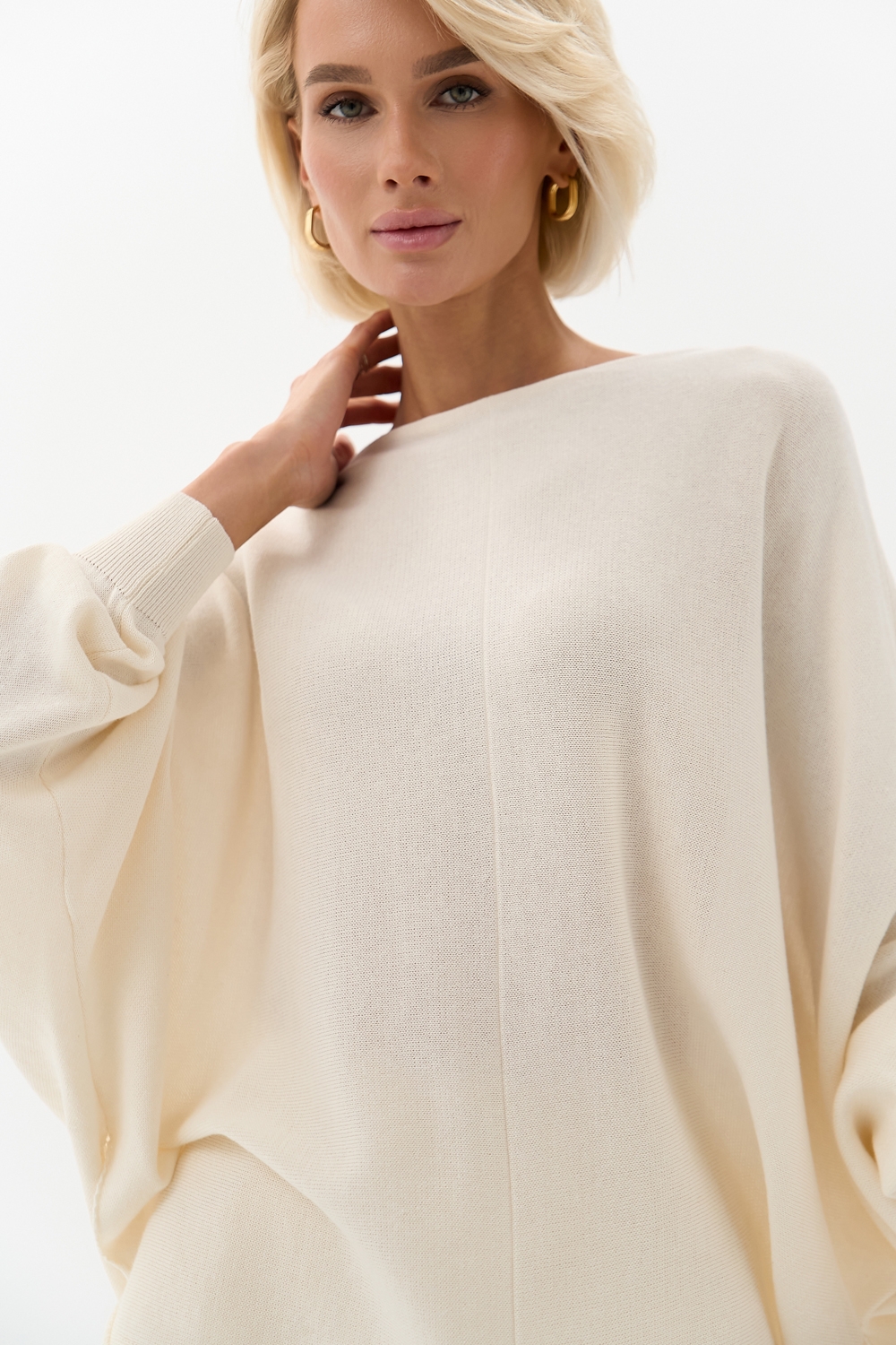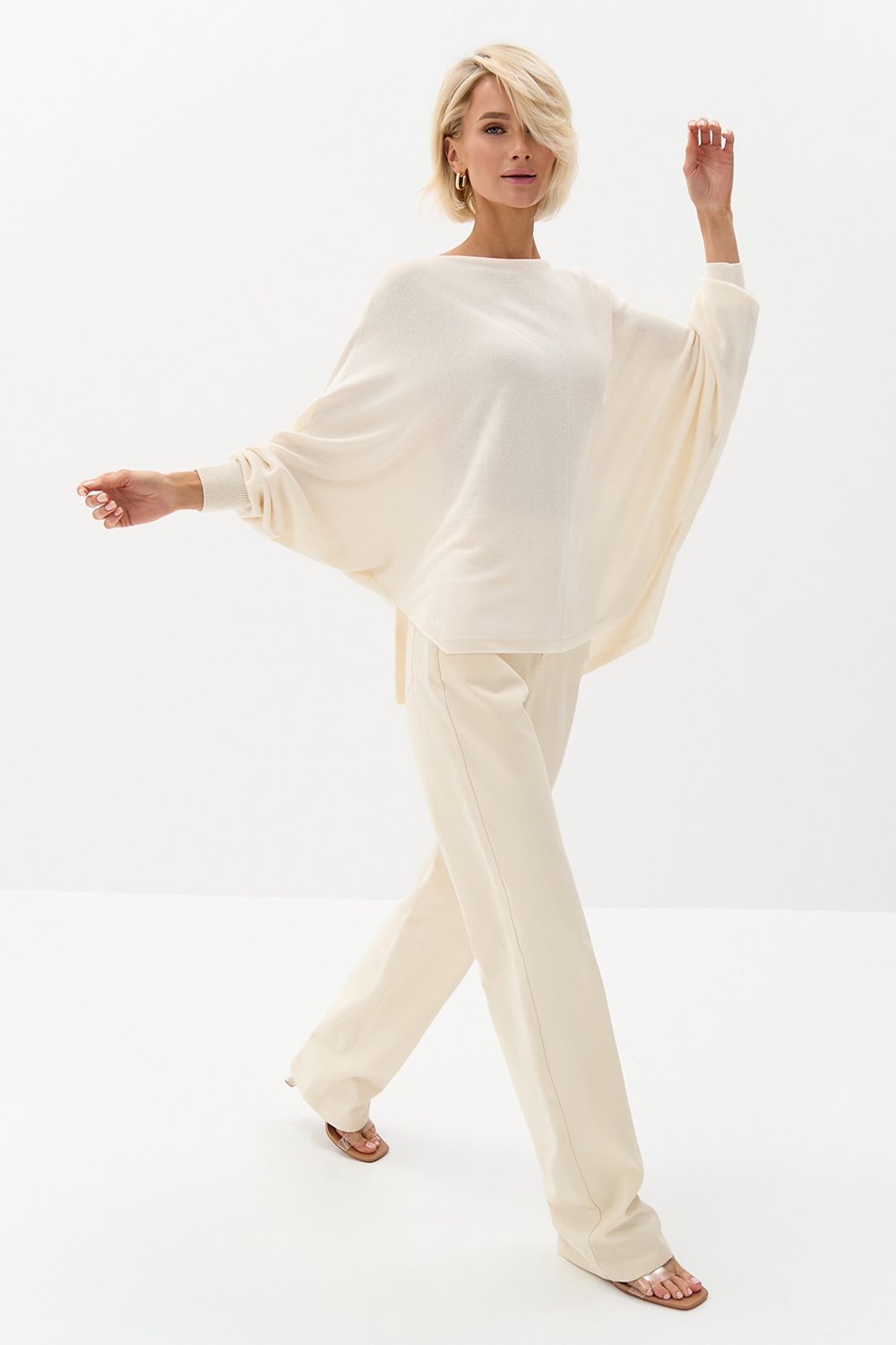 Елегантне пончо фасону «летюча миша» з горловиною-човником, виконане гладкою, напівпрозорою в’язкою з преміальної пряжі із включенням віскози, бавовни та бамбука.