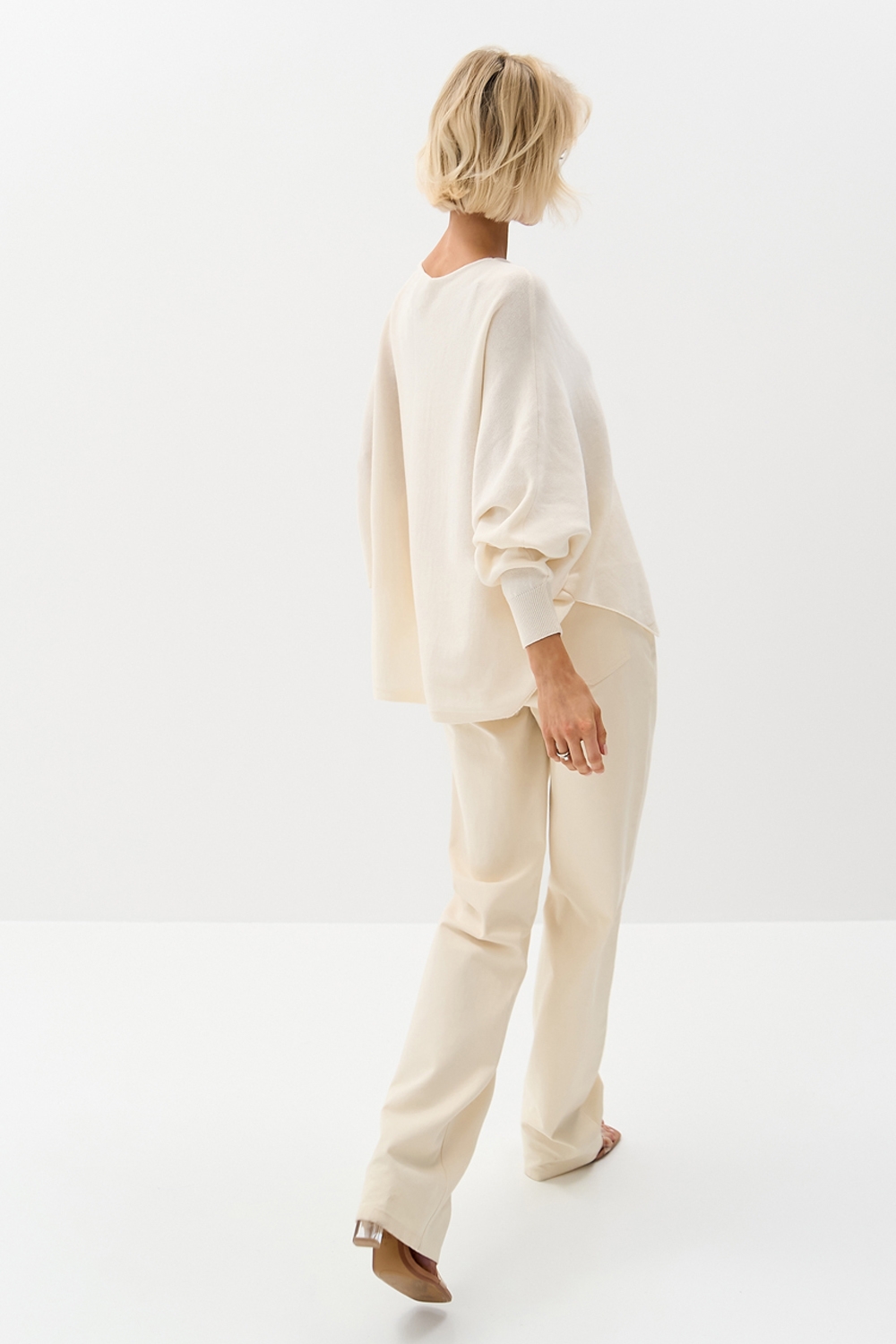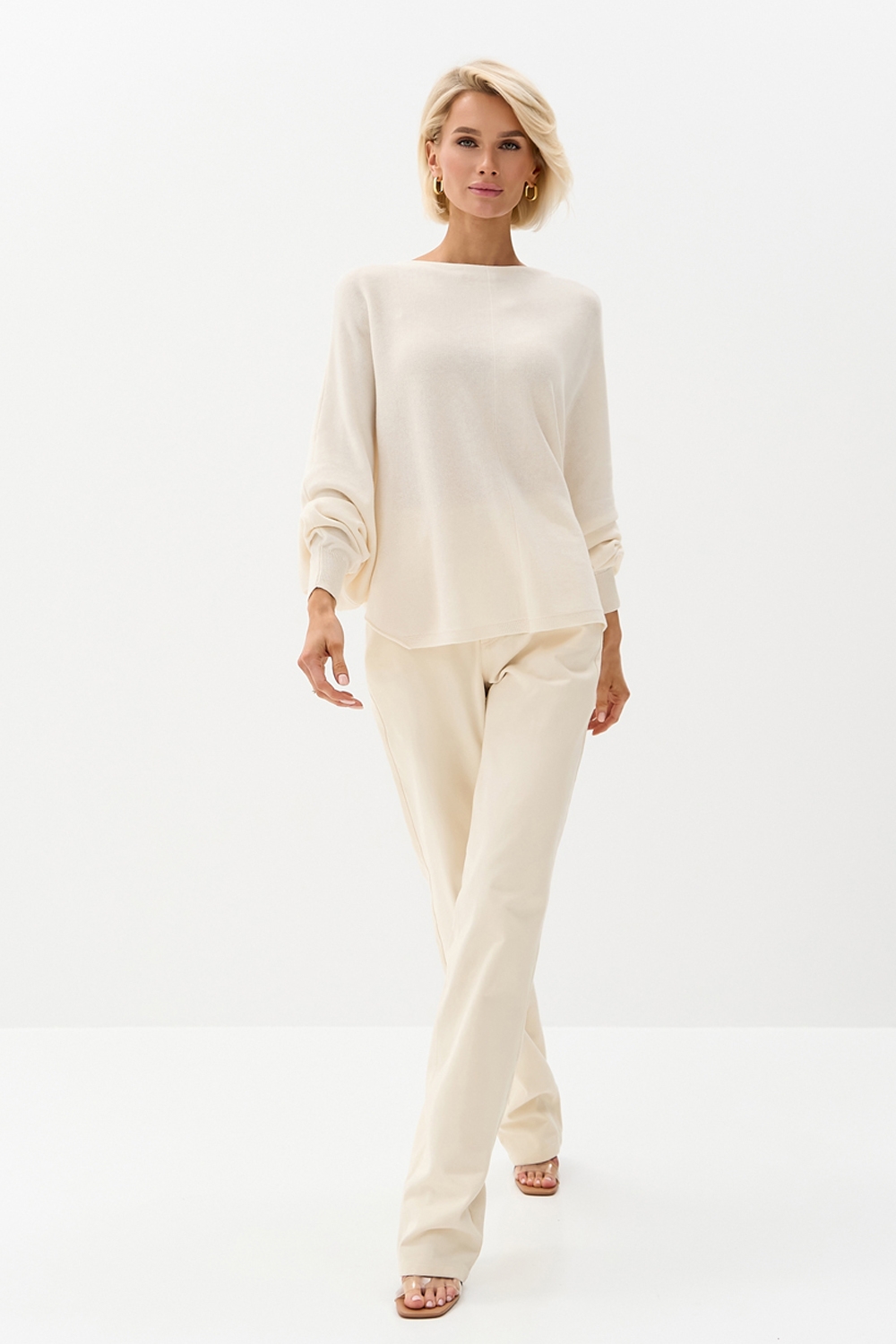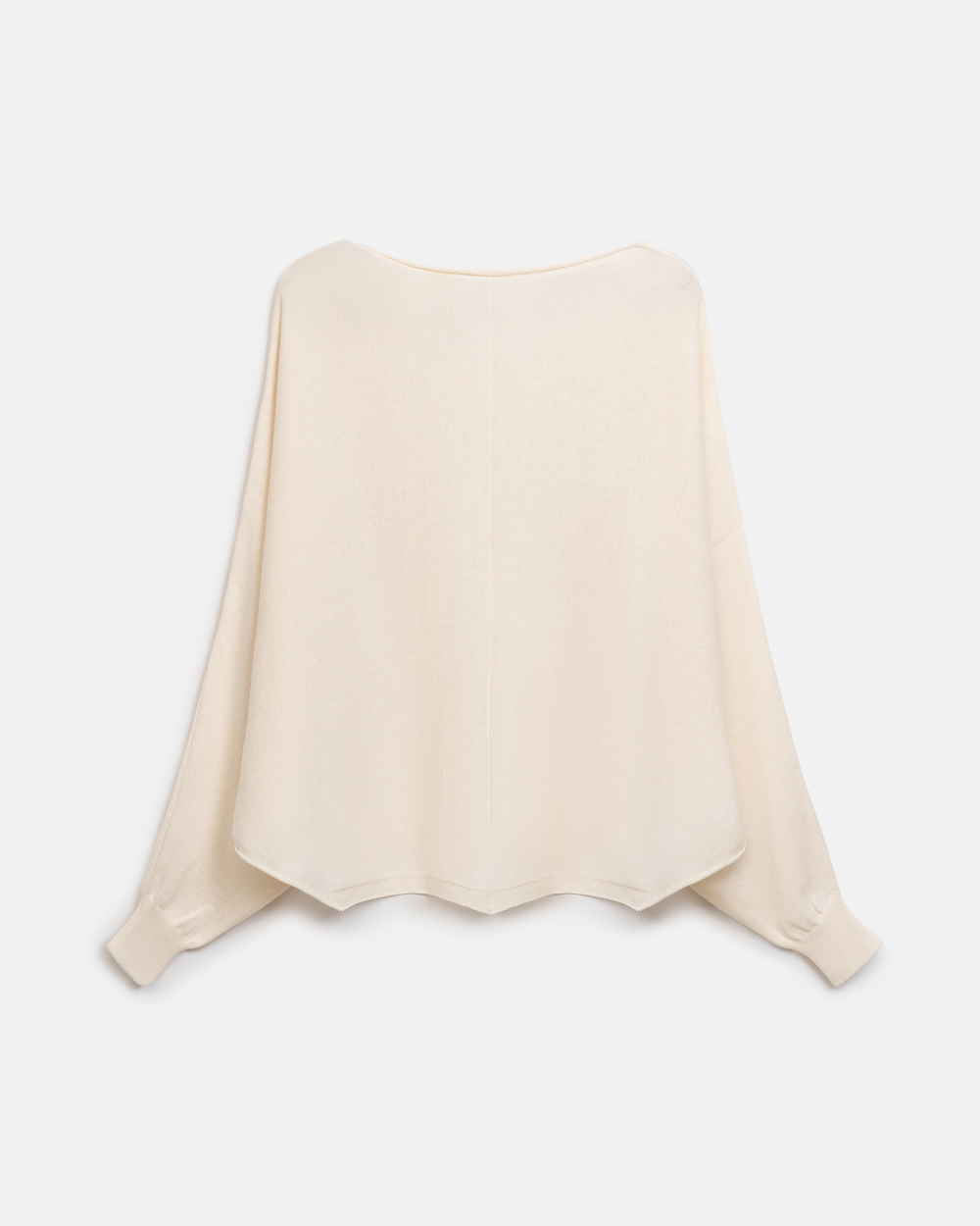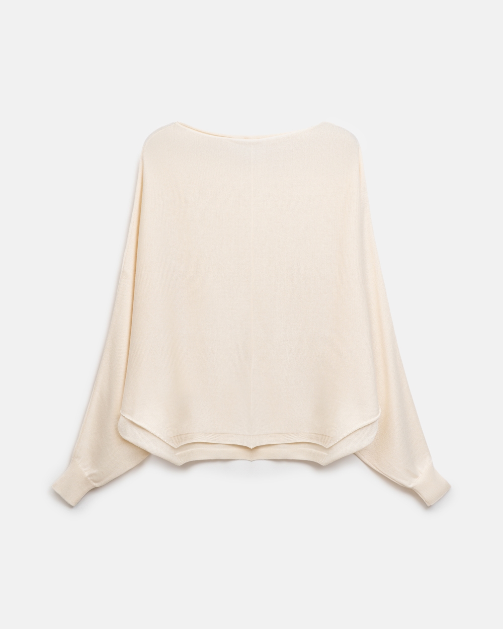 Елегантне пончо фасону «летюча миша» з горловиною-човником, виконане гладкою, напівпрозорою в’язкою з преміальної пряжі із включенням віскози, бавовни та бамбука.