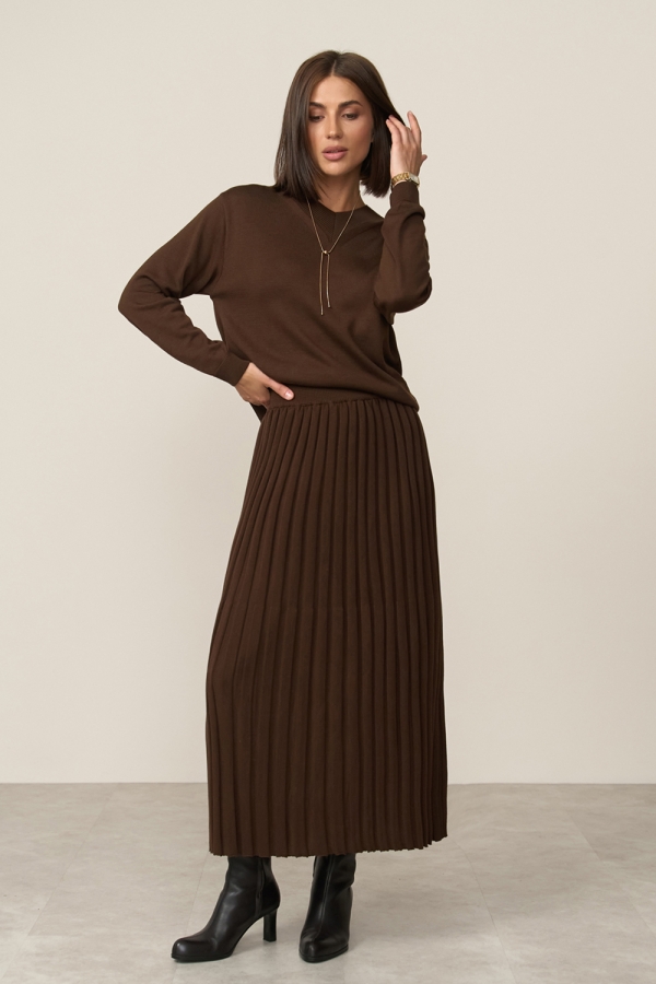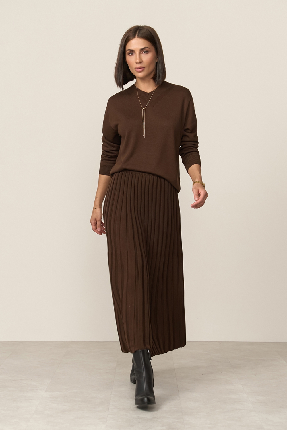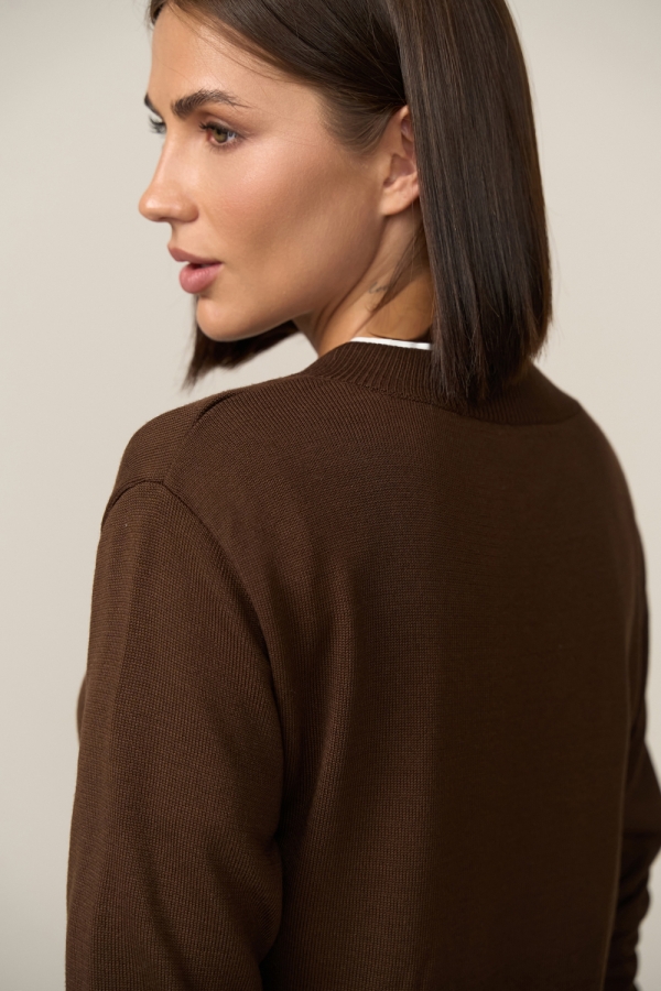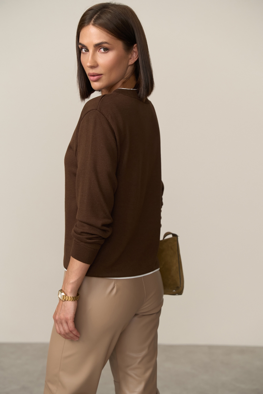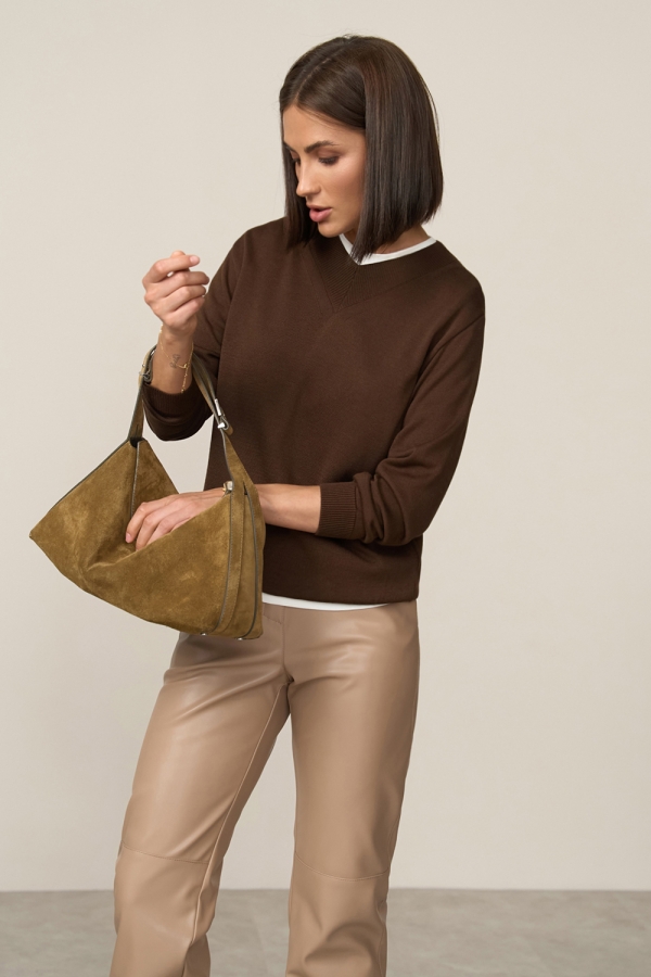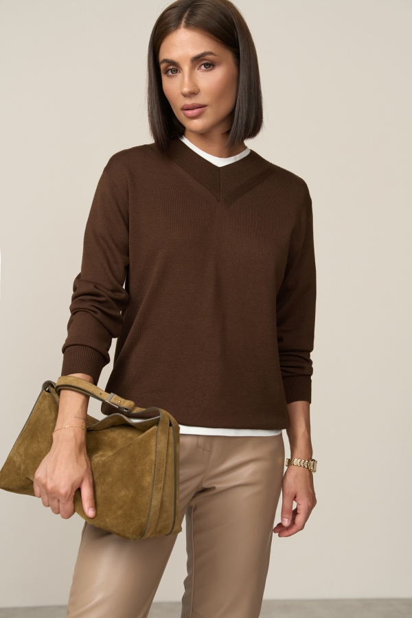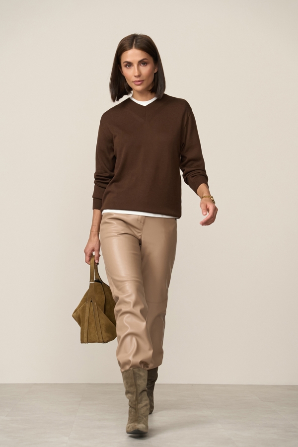 Універсальний пуловер з V-подібною горловиною, що оформлена в’язкою резинкою. Модель виконана у гладкому, стабільному плетінні із пряжі з високим вмістом віскози та бавовни. Спущена лінія плеча та вільний фасон додають комфорту.