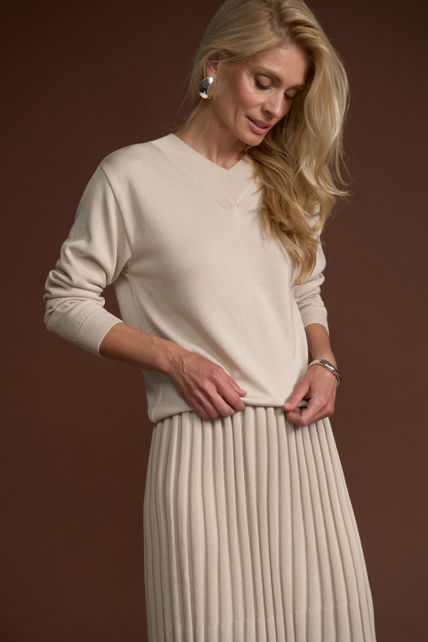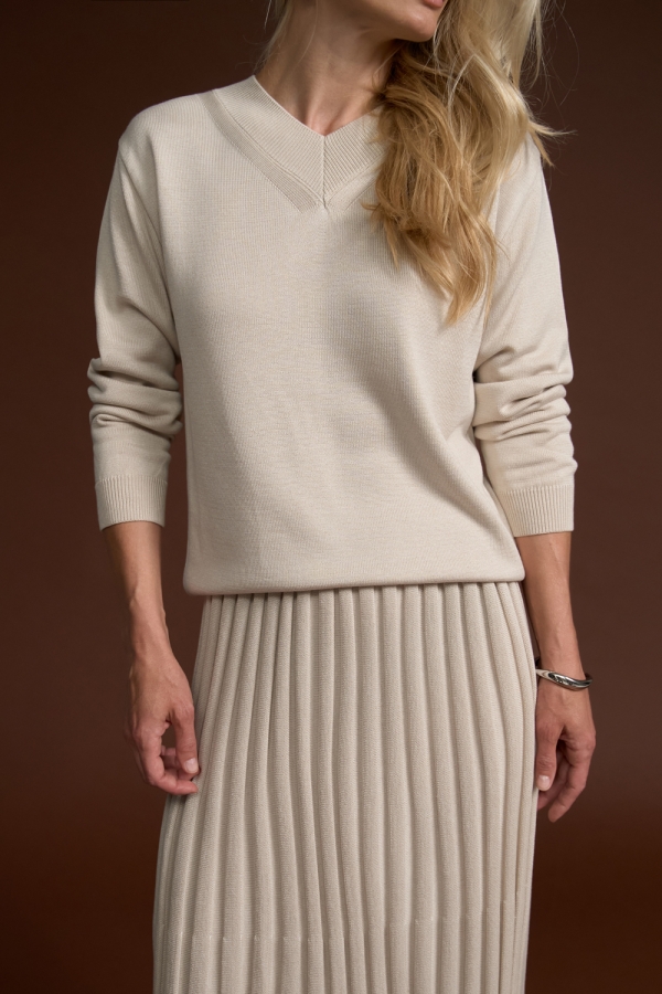 Універсальний пуловер з V-подібною горловиною, що оформлена в’язкою резинкою. Модель виконана у гладкому, стабільному плетінні із пряжі з високим вмістом віскози та бавовни. Спущена лінія плеча та вільний фасон додають комфорту.