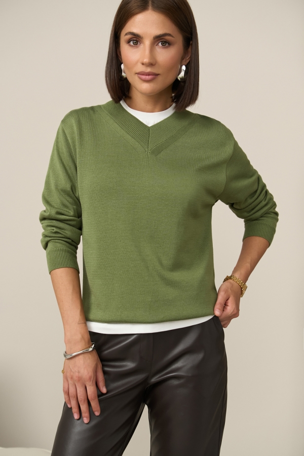 Універсальний пуловер з V-подібною горловиною, що оформлена в’язкою резинкою. Модель виконана у гладкому, стабільному плетінні із пряжі з високим вмістом віскози та бавовни. Спущена лінія плеча та вільний фасон додають комфорту.
