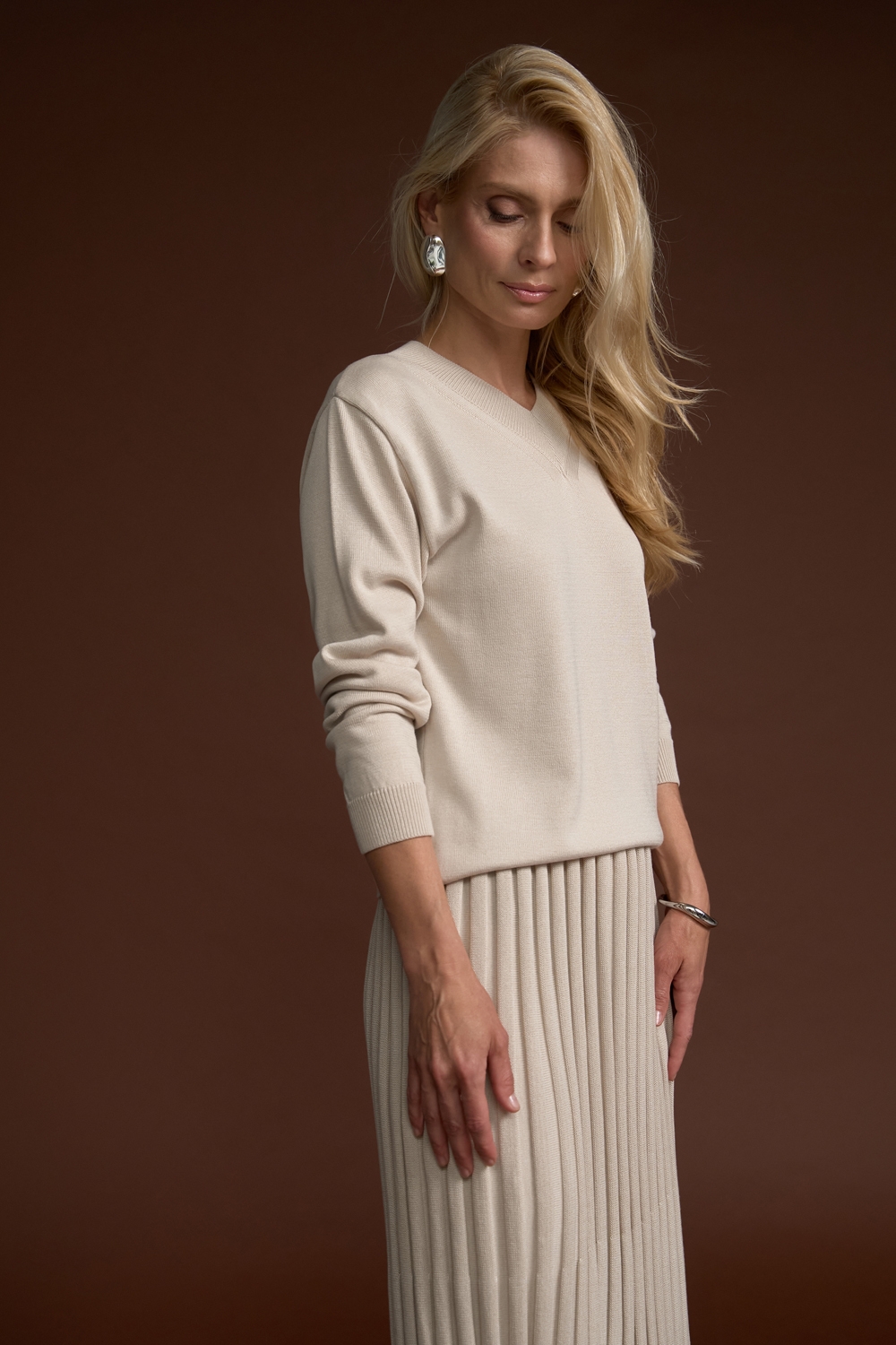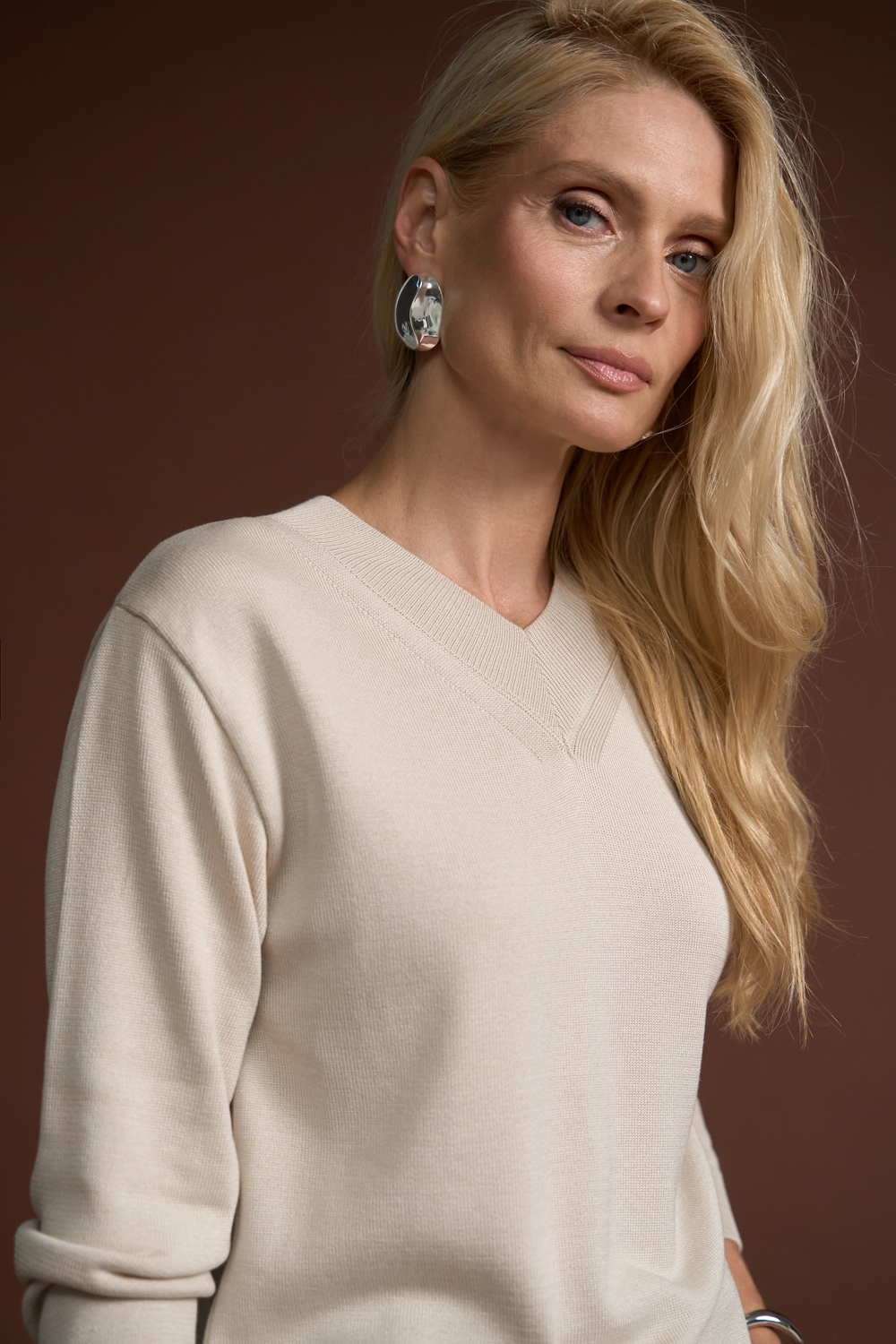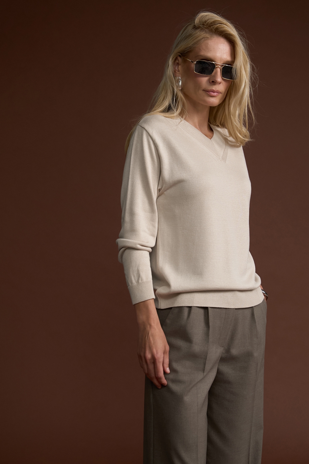 Універсальний пуловер з V-подібною горловиною, що оформлена в’язкою резинкою. Модель виконана у гладкому, стабільному плетінні із пряжі з високим вмістом віскози та бавовни. Спущена лінія плеча та вільний фасон додають комфорту.