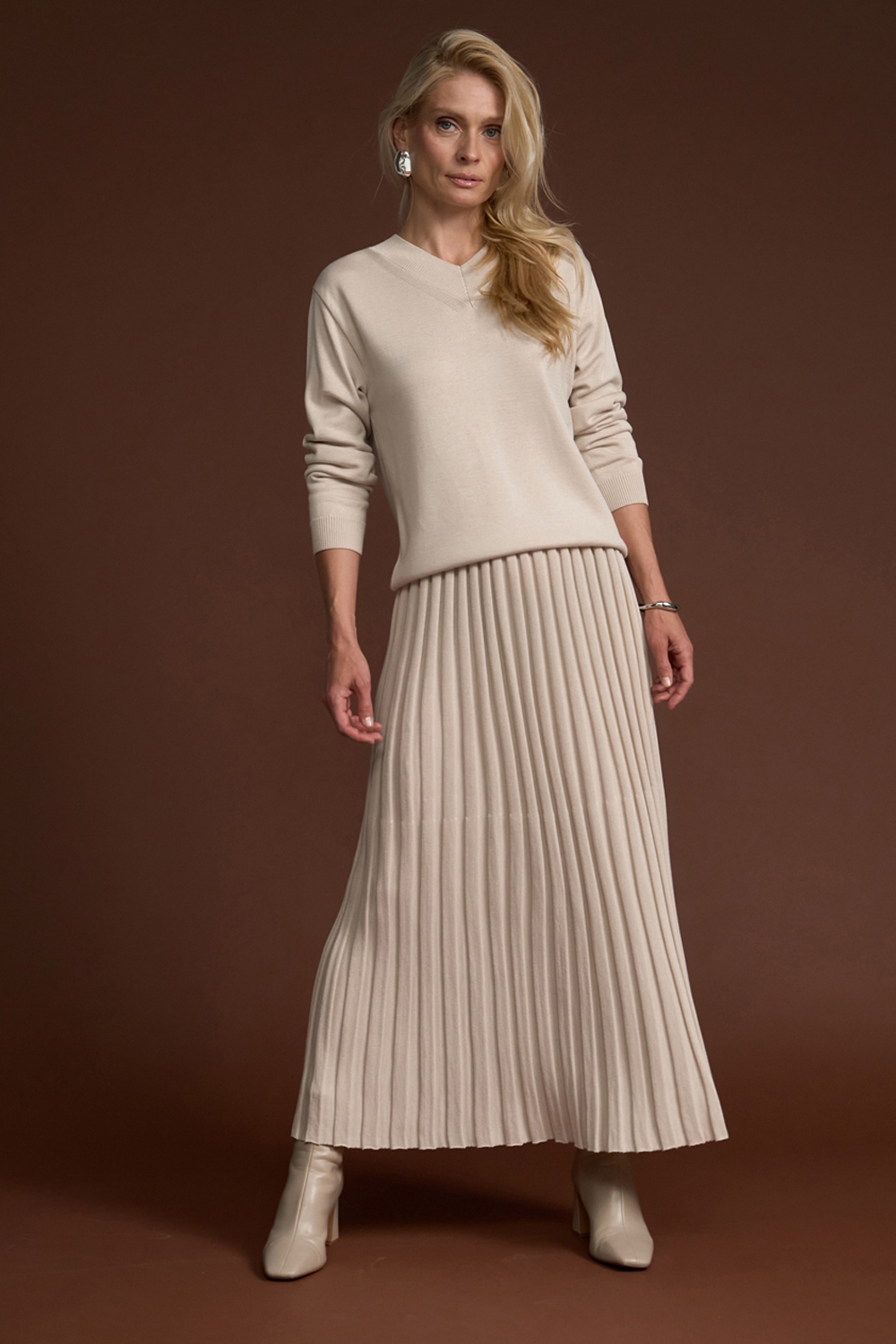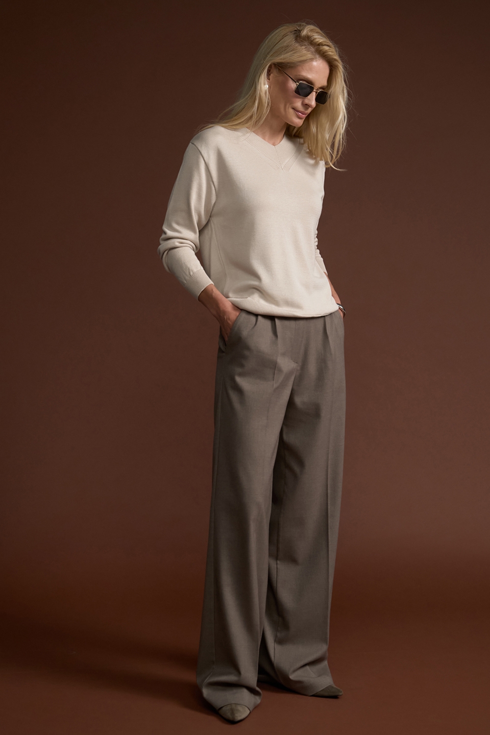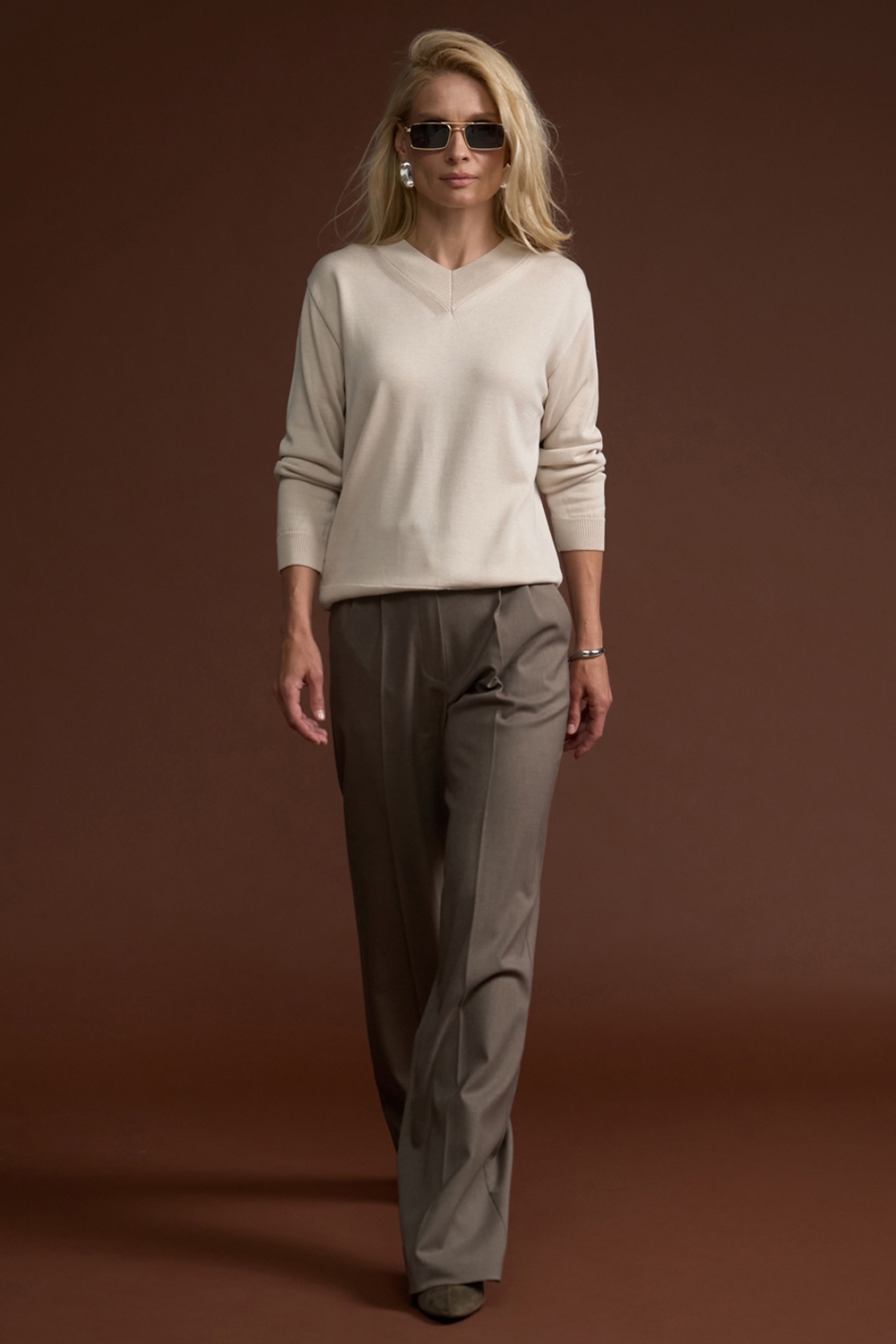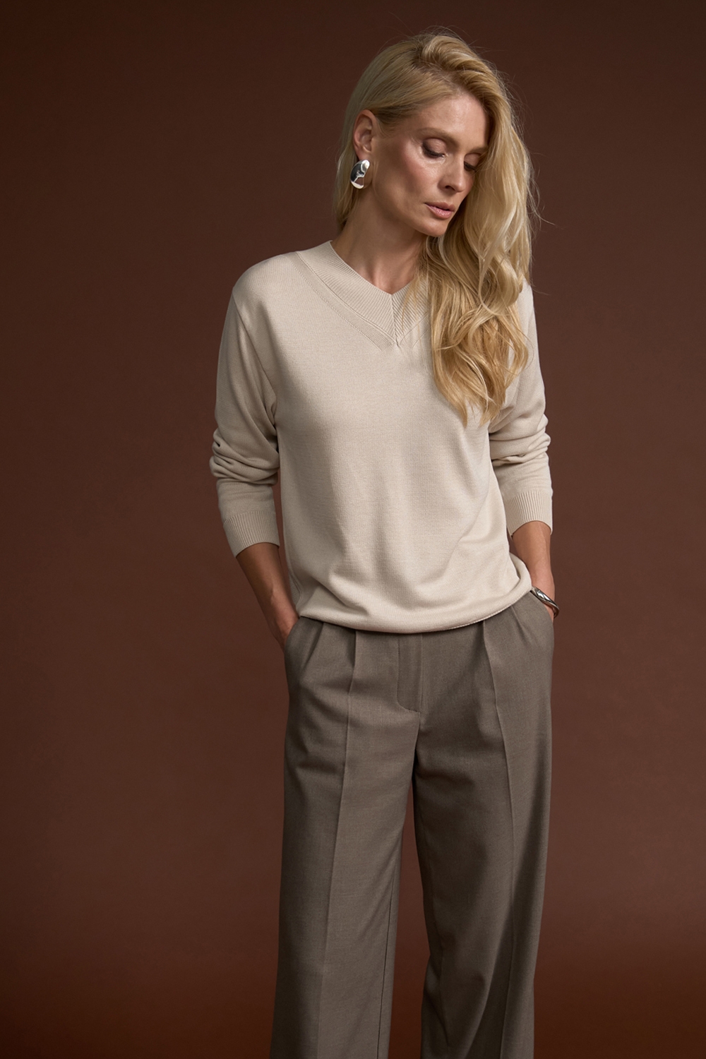 Універсальний пуловер з V-подібною горловиною, що оформлена в’язкою резинкою. Модель виконана у гладкому, стабільному плетінні із пряжі з високим вмістом віскози та бавовни. Спущена лінія плеча та вільний фасон додають комфорту.