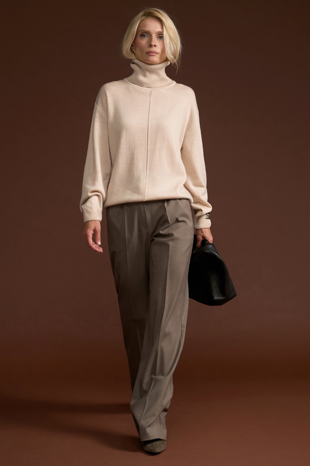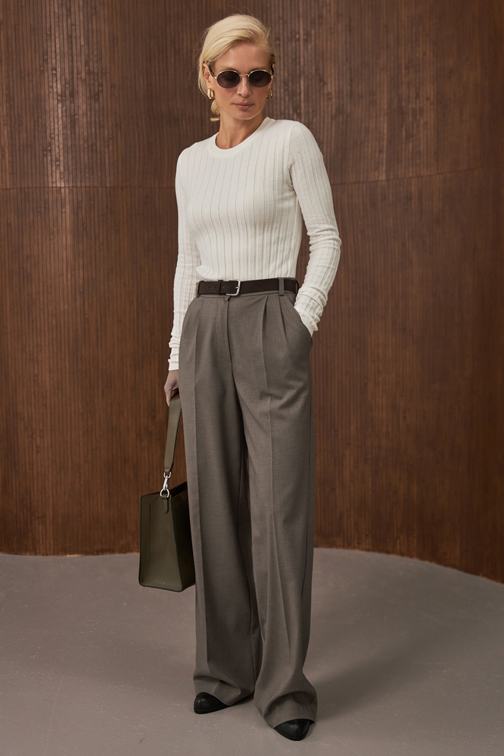 Класичні прямі штани з напіввовняної тканини середньої щільності. Завдяки елегантним защіпам спереду утворюються м’які складки, а бокові кишені додають зручності.