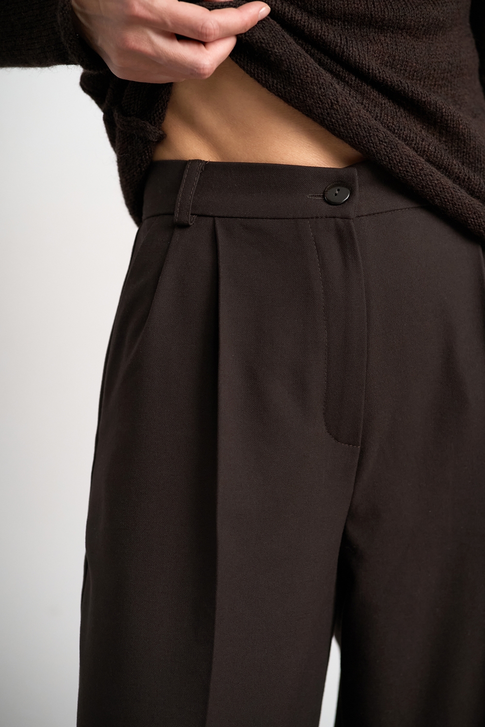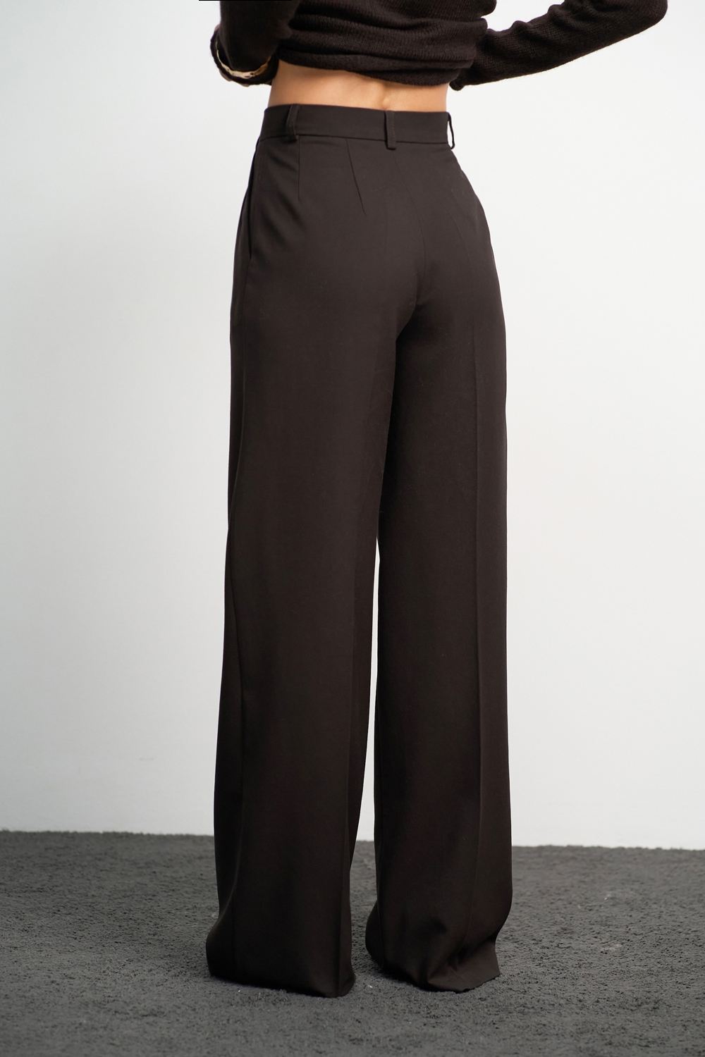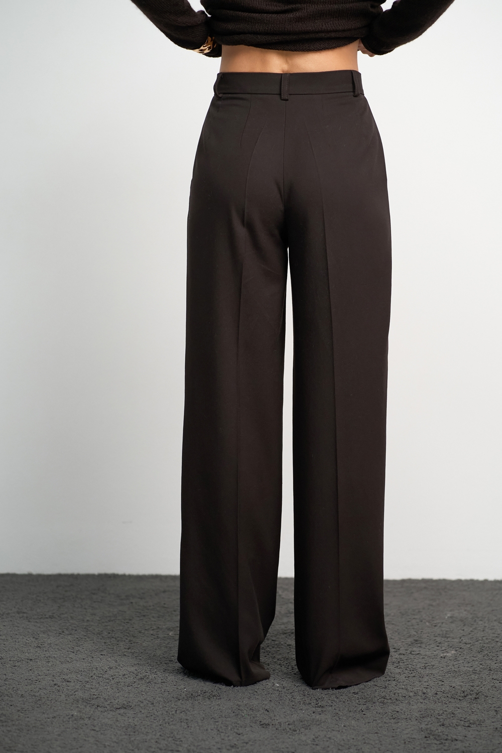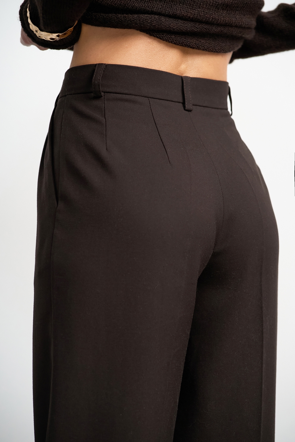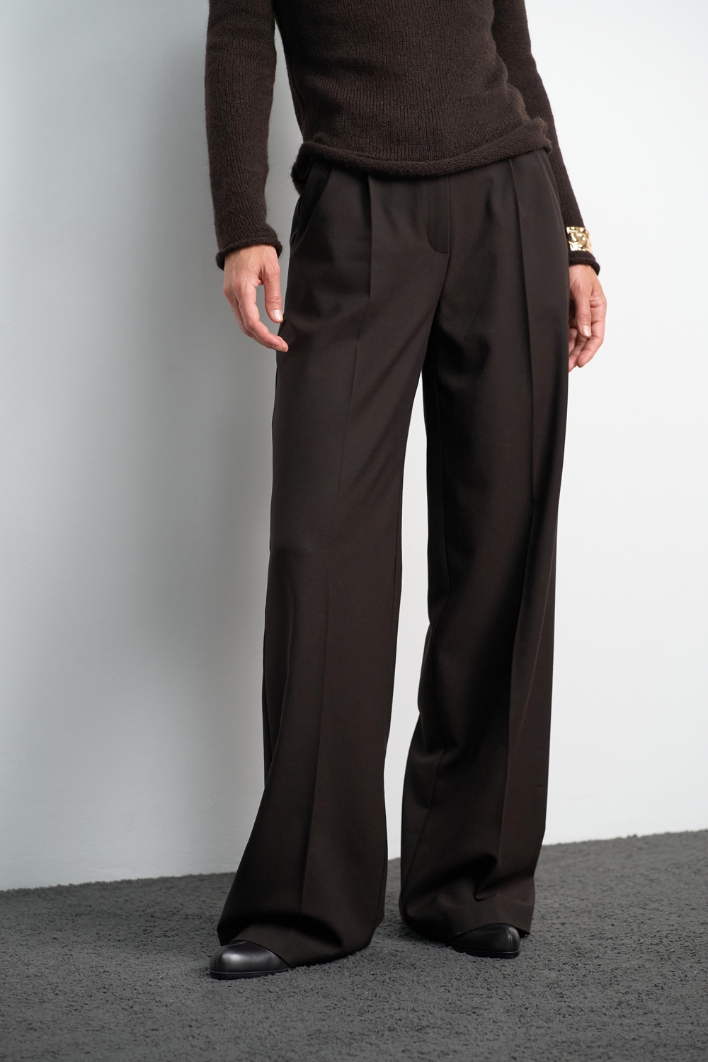 Класичні прямі штани з напіввовняної тканини середньої щільності. Завдяки елегантним защіпам спереду утворюються м’які складки, а бокові кишені додають зручності.