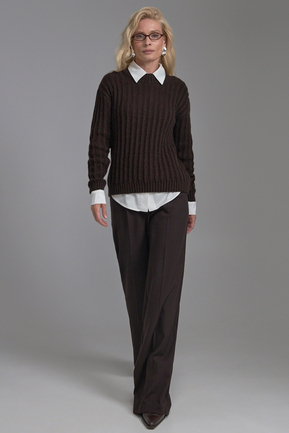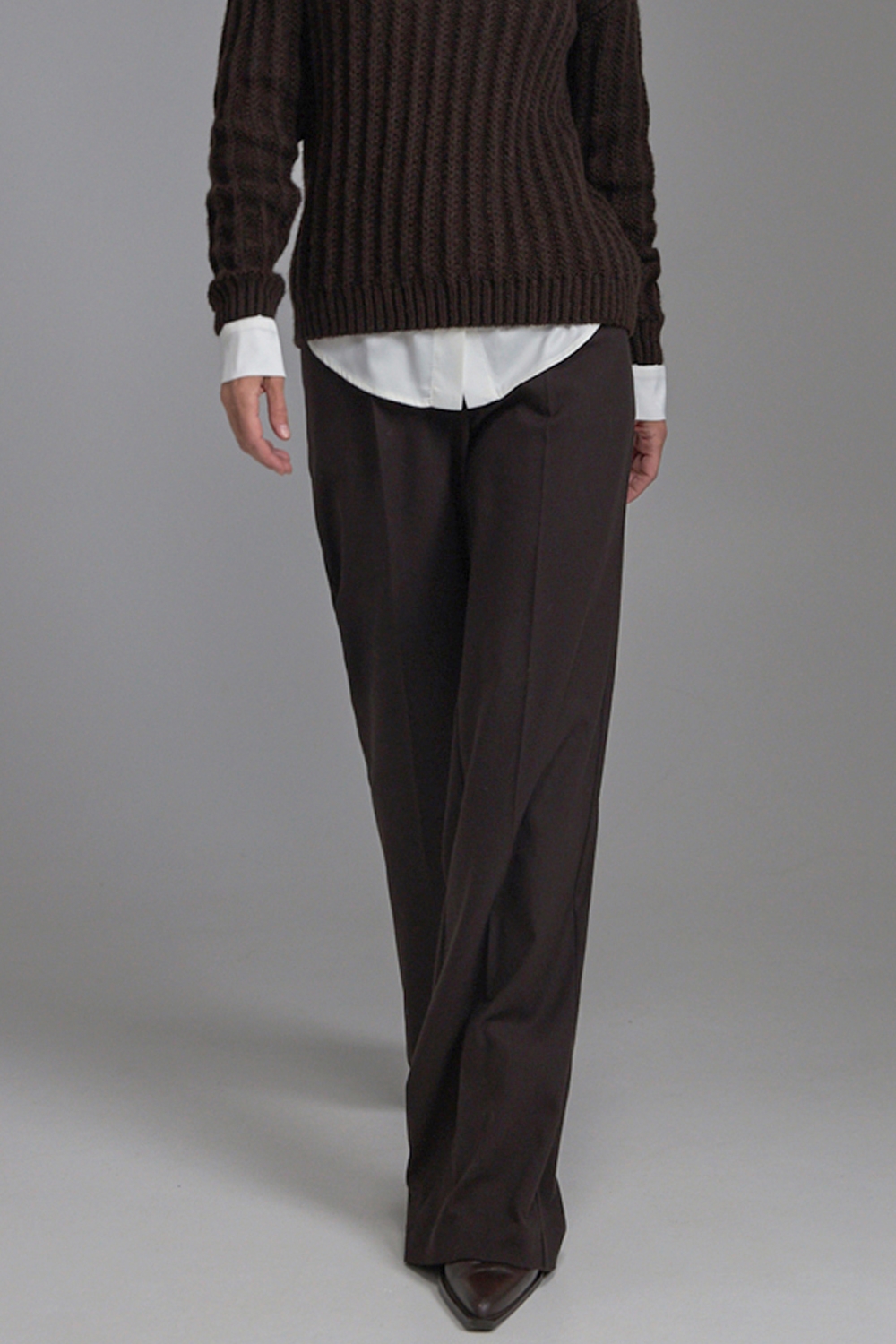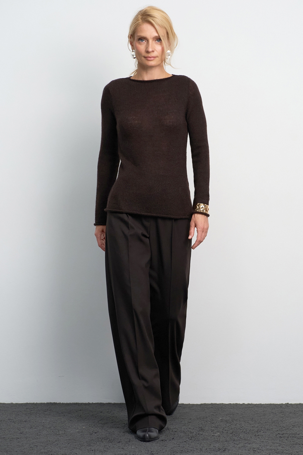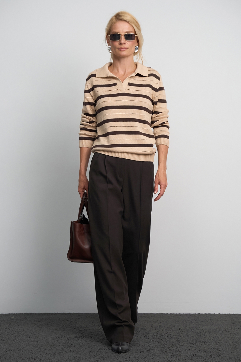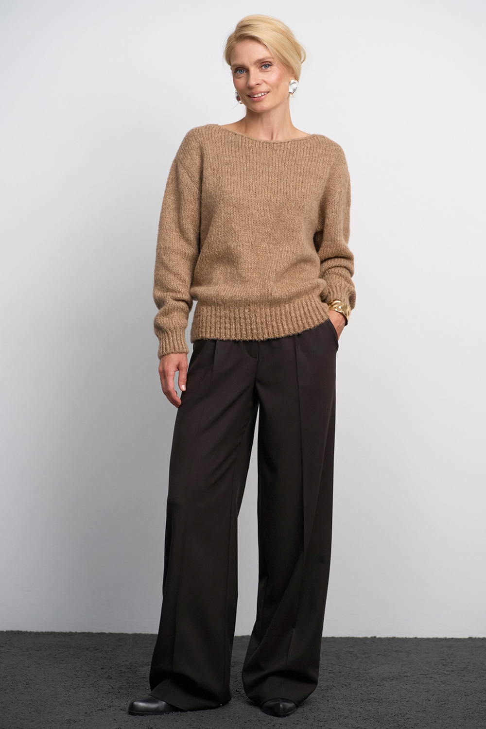 Класичні прямі штани з напіввовняної тканини середньої щільності. Завдяки елегантним защіпам спереду утворюються м’які складки, а бокові кишені додають зручності.