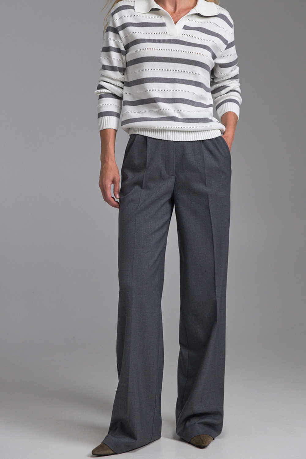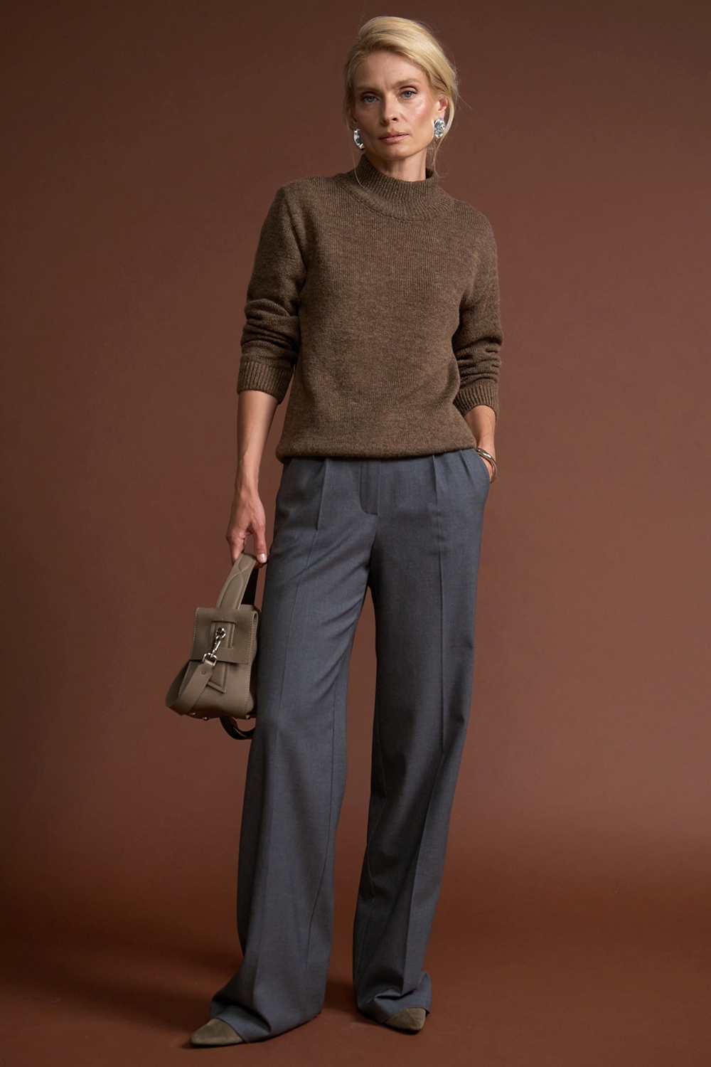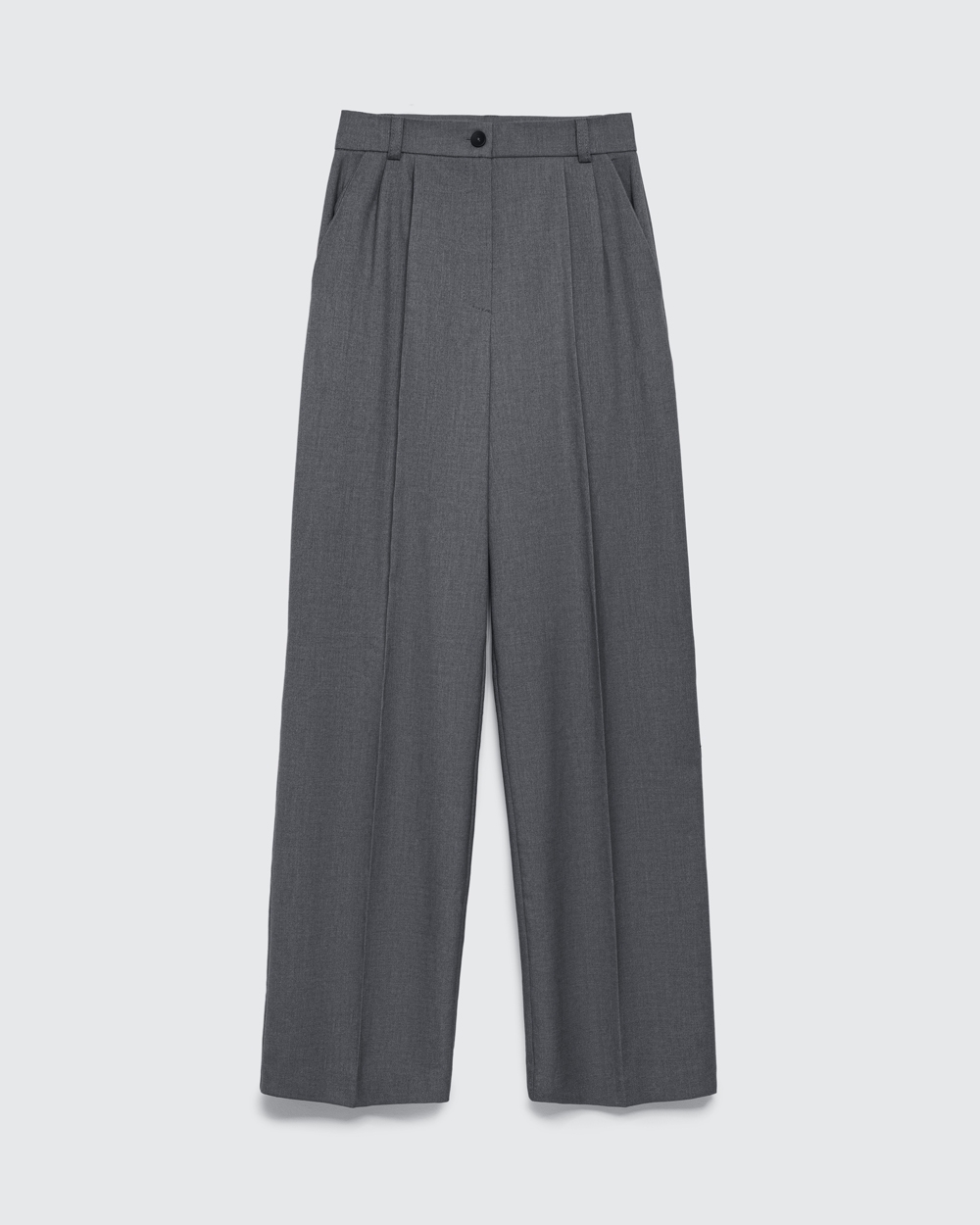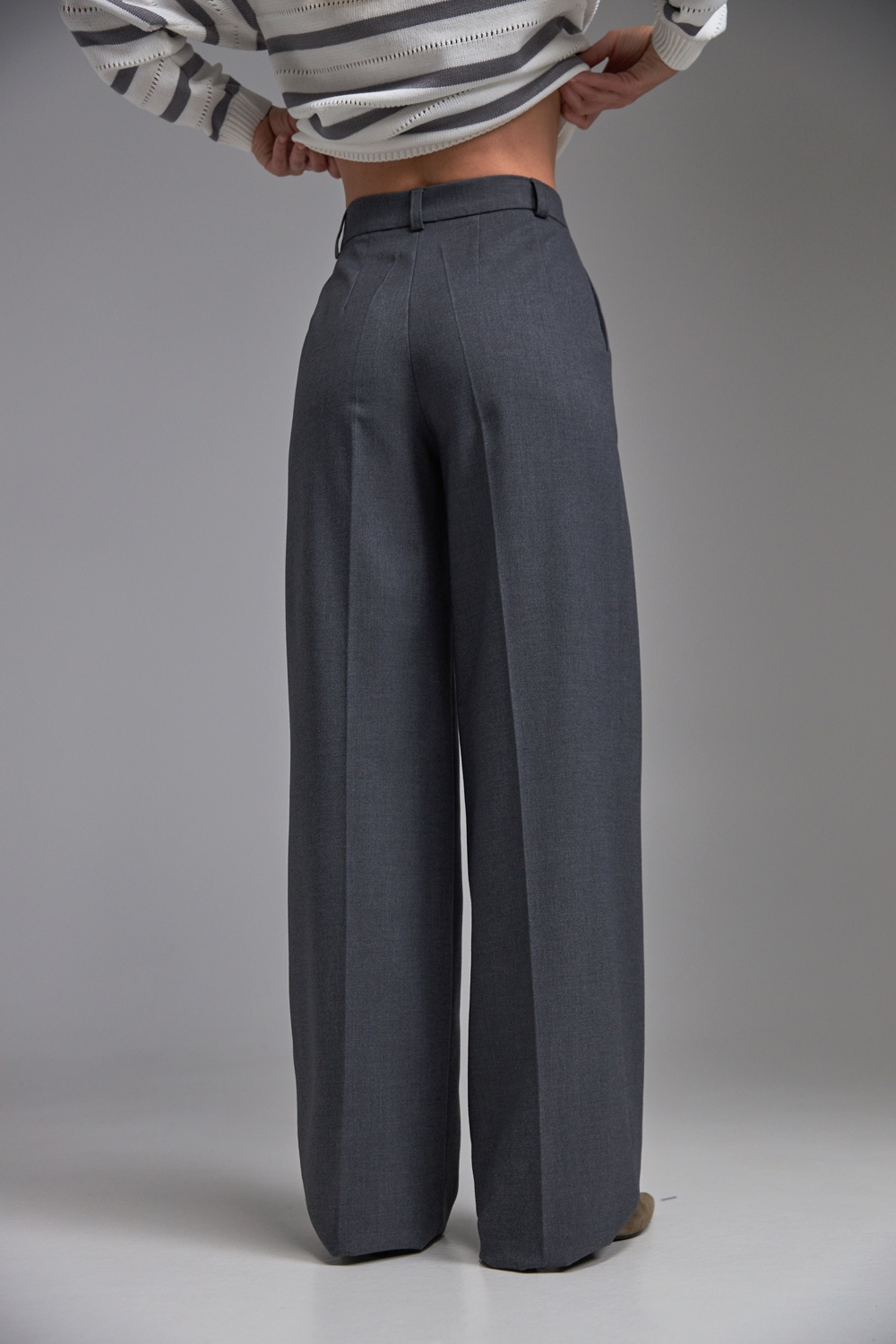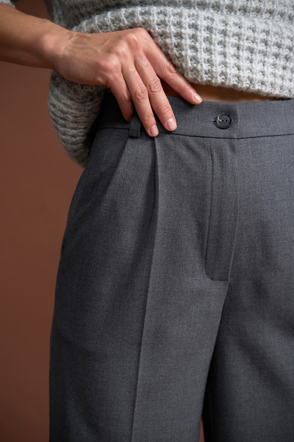 Класичні прямі штани з напіввовняної тканини середньої щільності. Завдяки елегантним защіпам спереду утворюються м’які складки, а бокові кишені додають зручності.