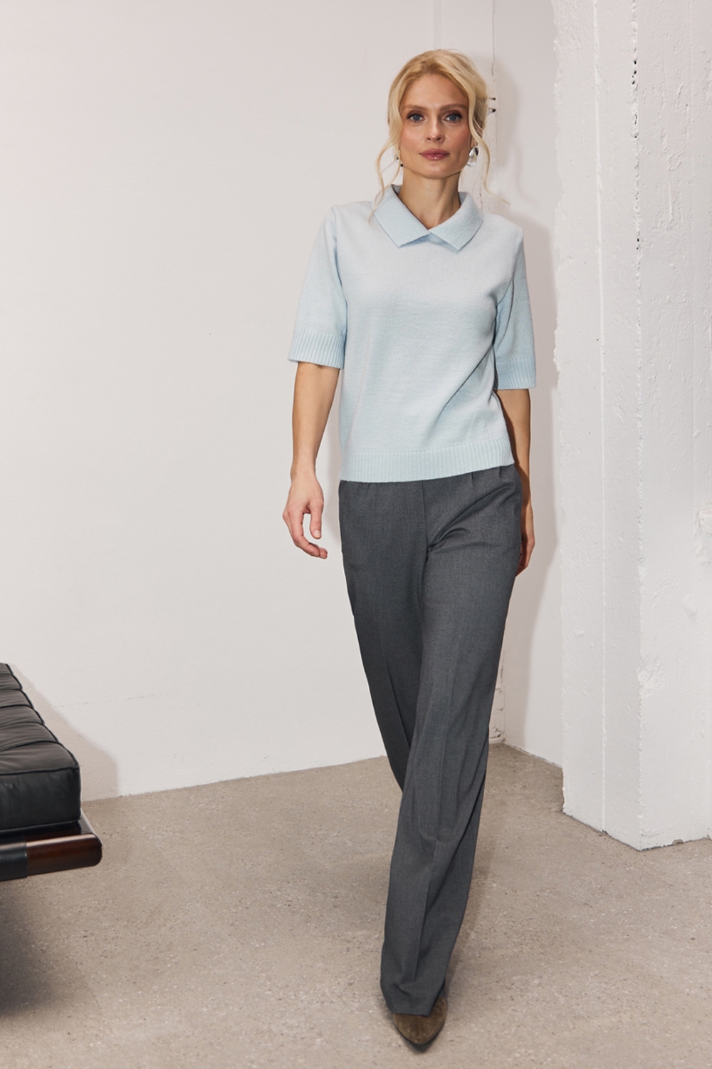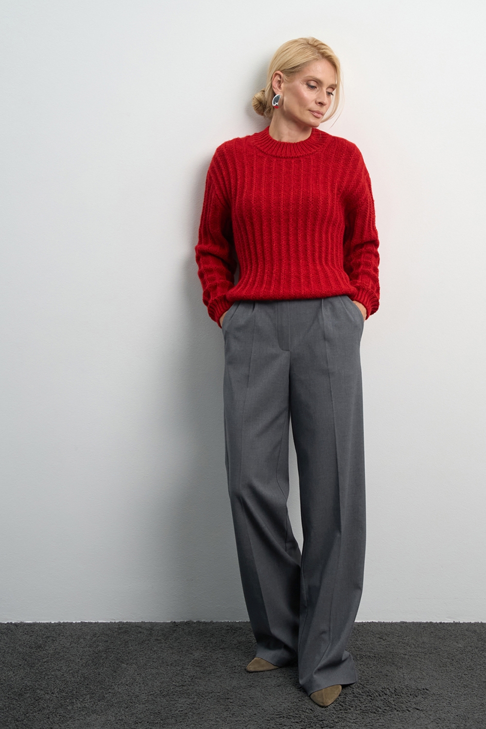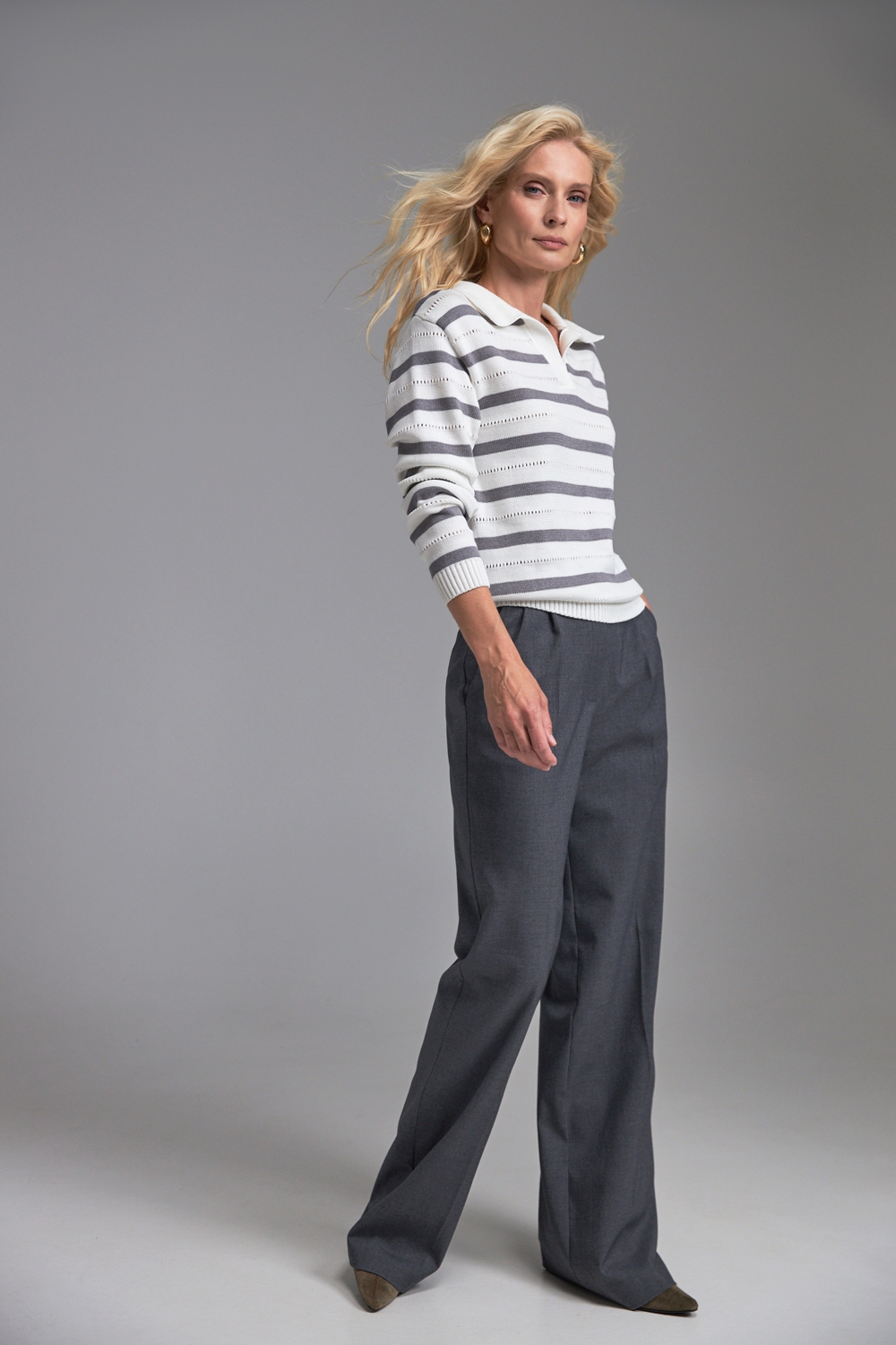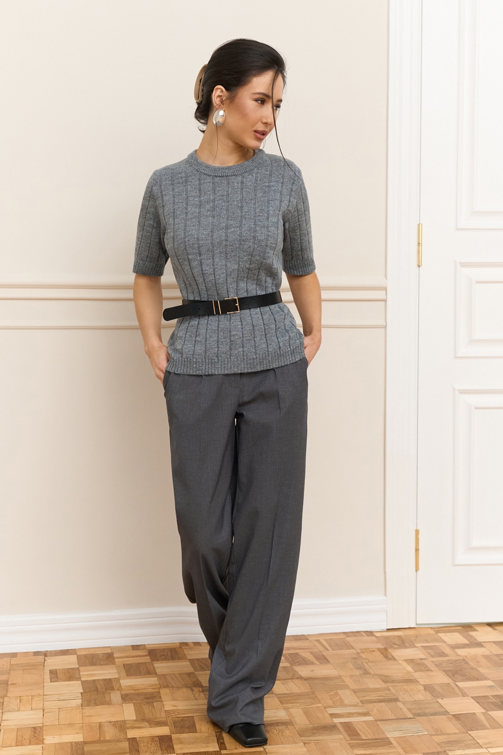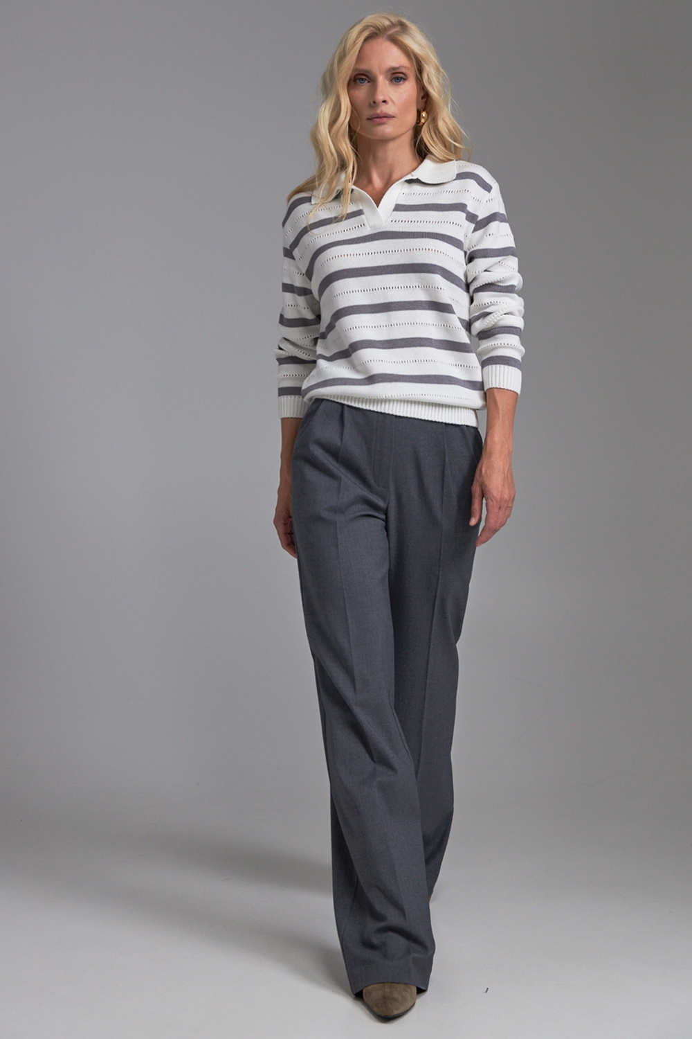 Класичні прямі штани з напіввовняної тканини середньої щільності. Завдяки елегантним защіпам спереду утворюються м’які складки, а бокові кишені додають зручності.