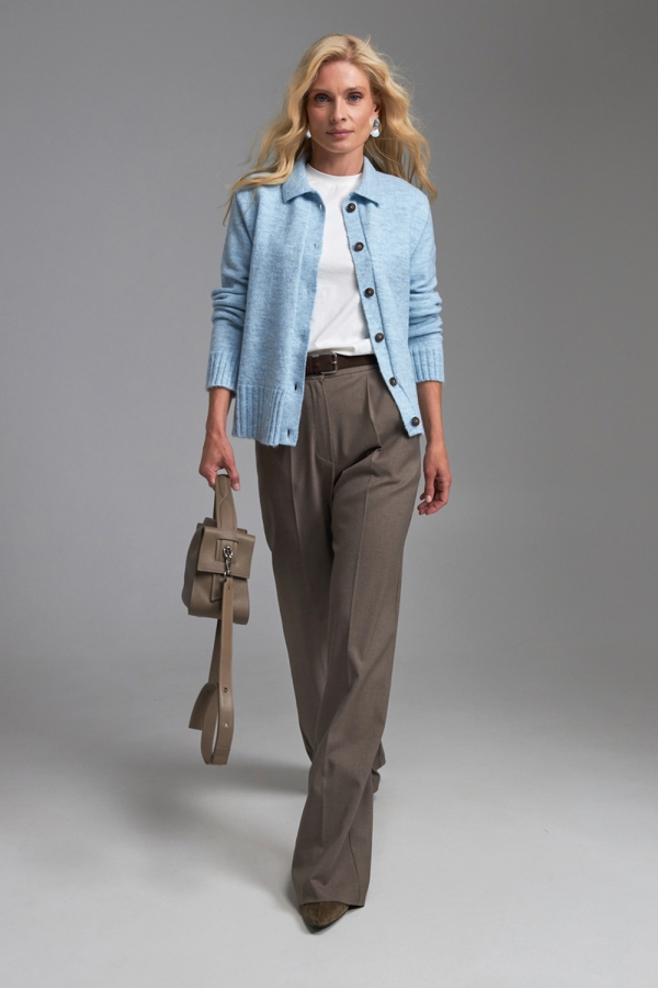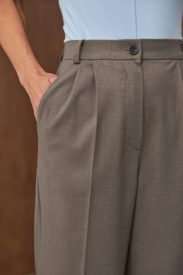 Класичні прямі штани з напіввовняної тканини середньої щільності. Завдяки елегантним защіпам спереду утворюються м’які складки, а бокові кишені додають зручності.