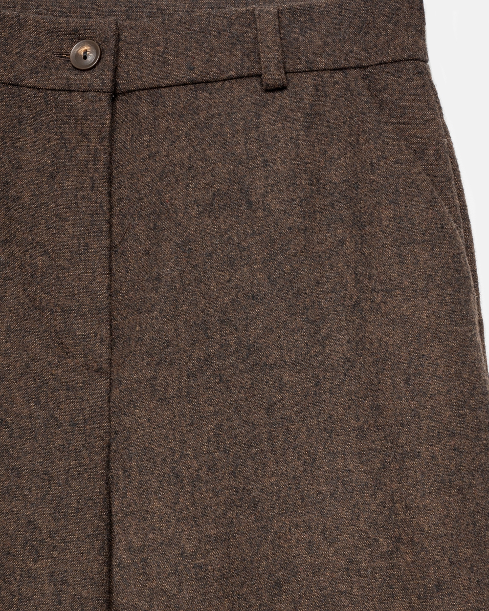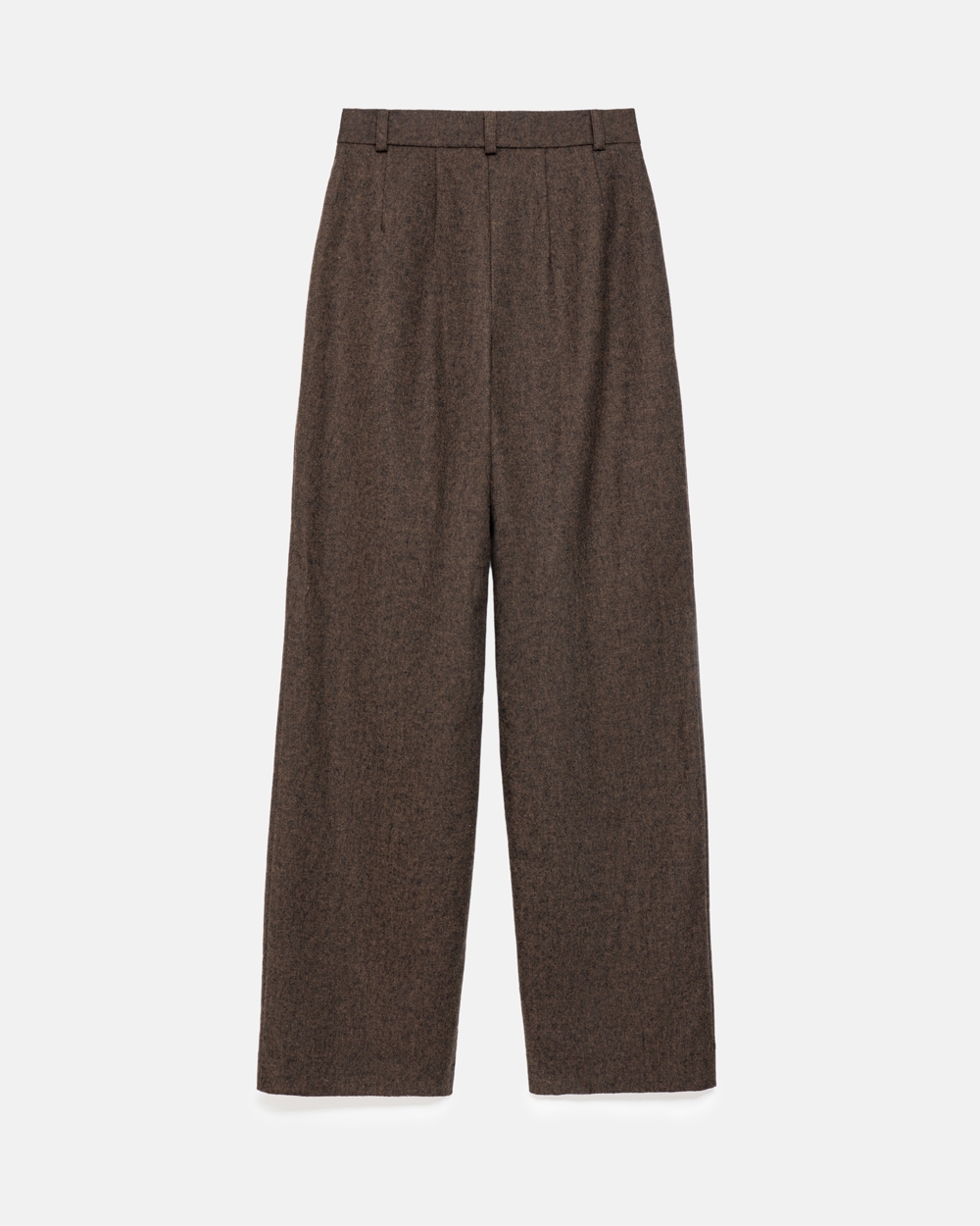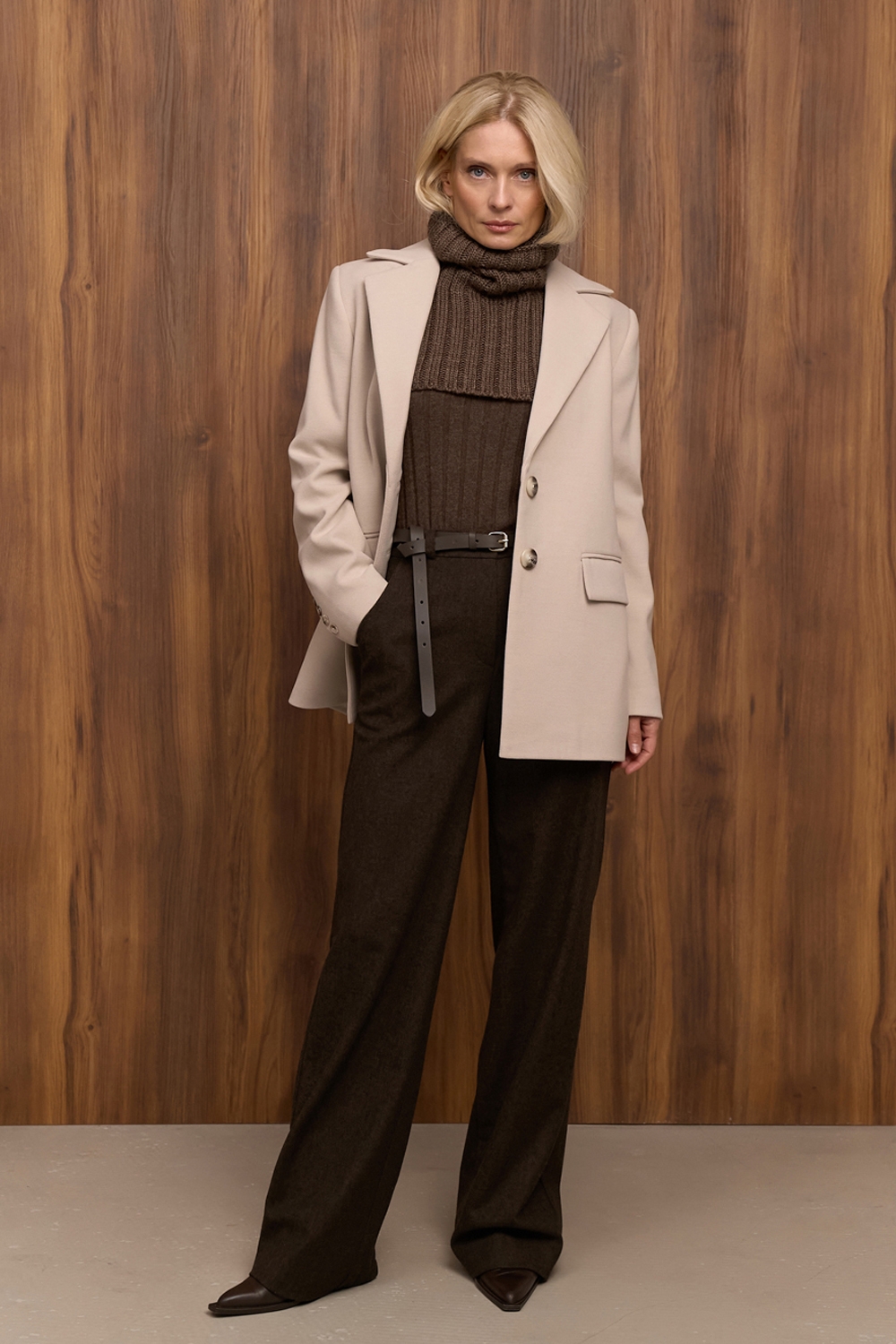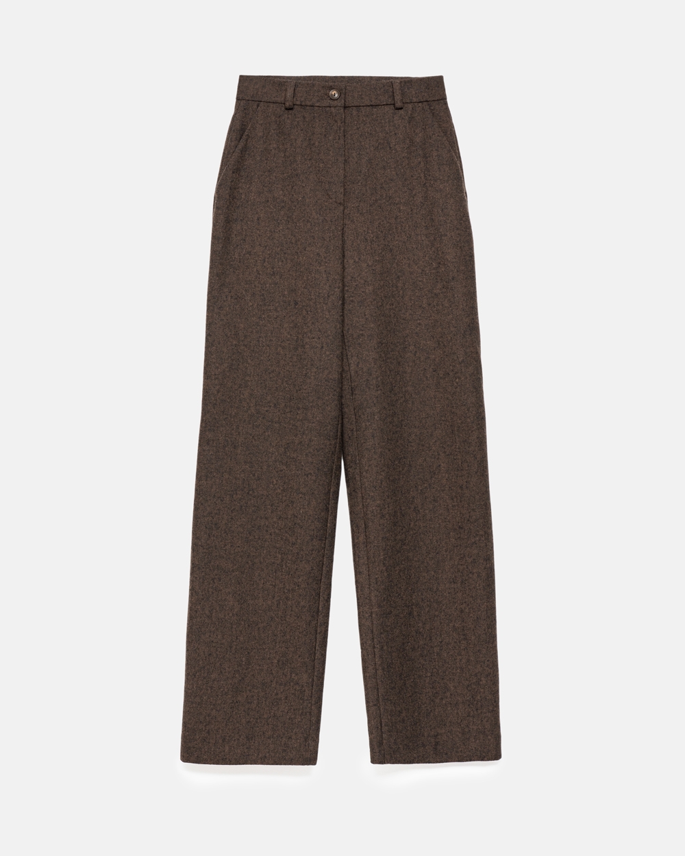 Теплі класичні штани прямого крою, виготовлені з напіввовняної тканини з додаванням віскози та еластану. Модель із високою посадкою та функціональними кишенями.