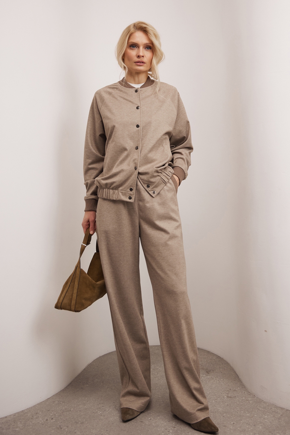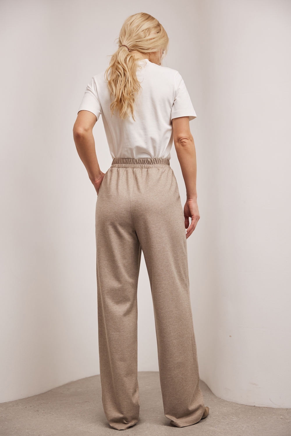 Штани із віскозної тканини з додаванням бавовни. Модель з високою посадкою та комфортним еластичним поясом. В бокових швах та позаду місткі кишені.