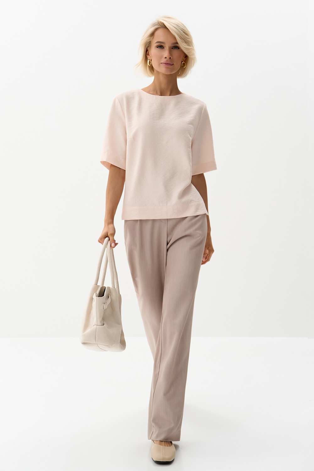 Класичні штани прямого крою з високою посадкою.  Функціональні кишені в бакових швах та еластична резинка позаду виробу додають комфорту.