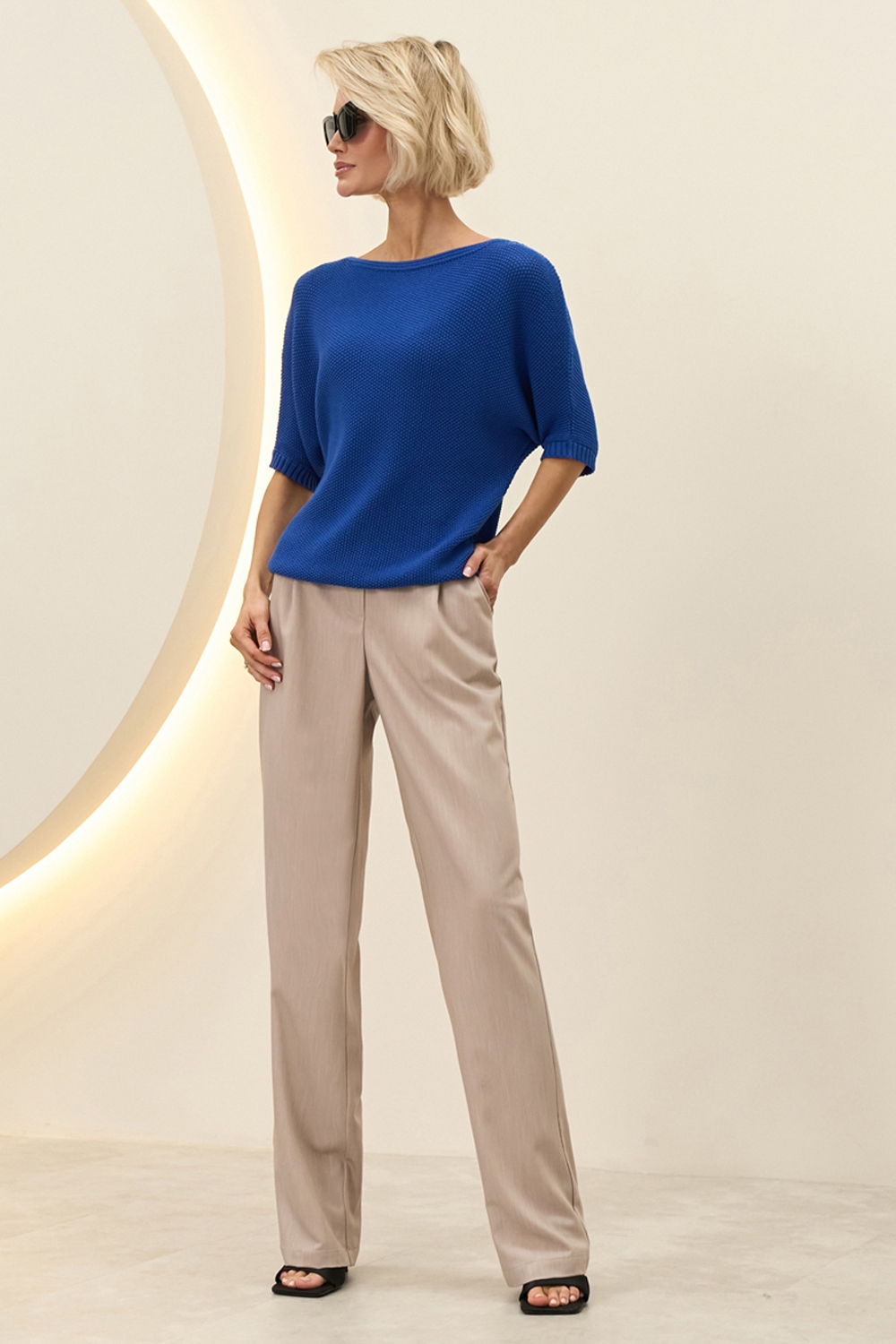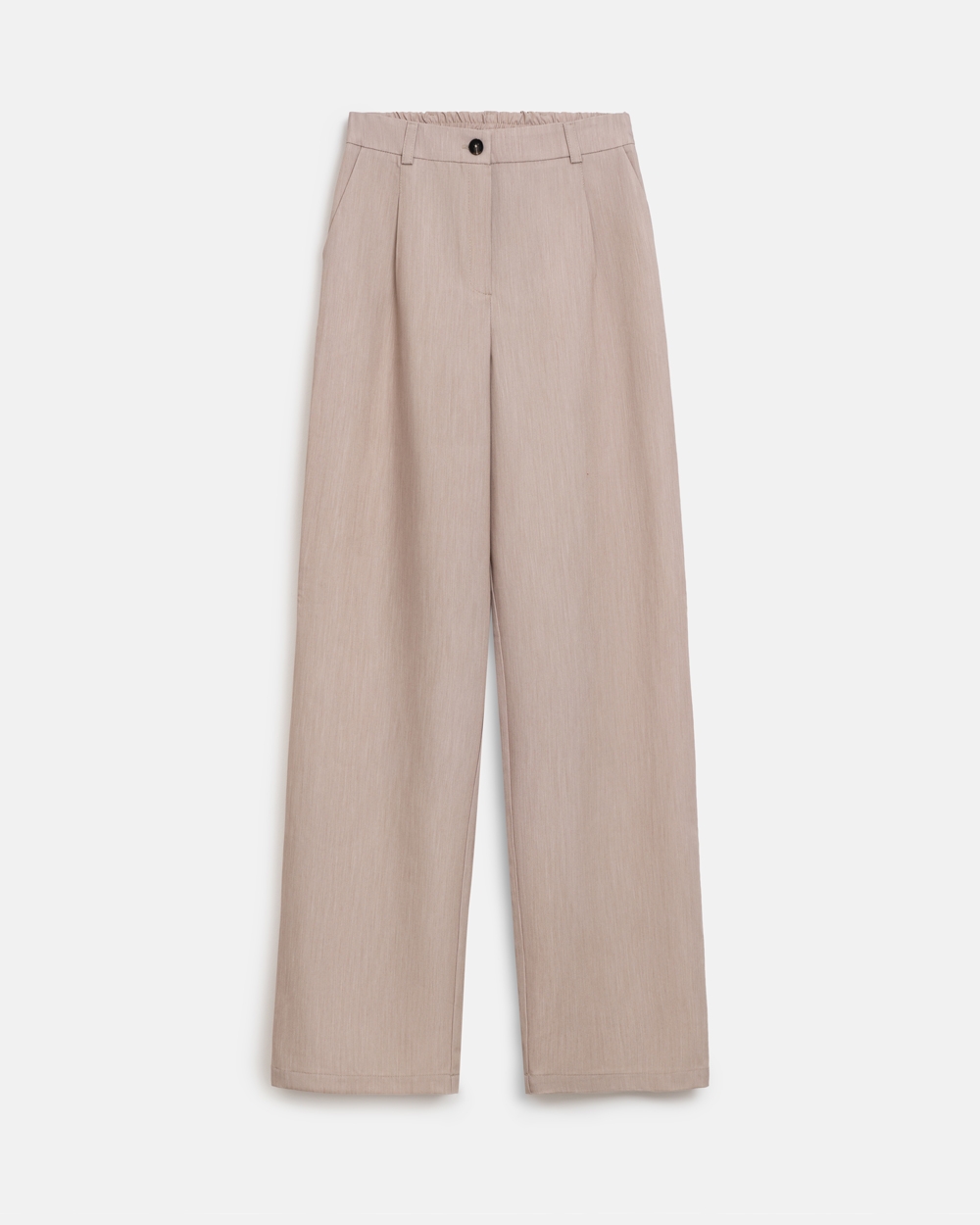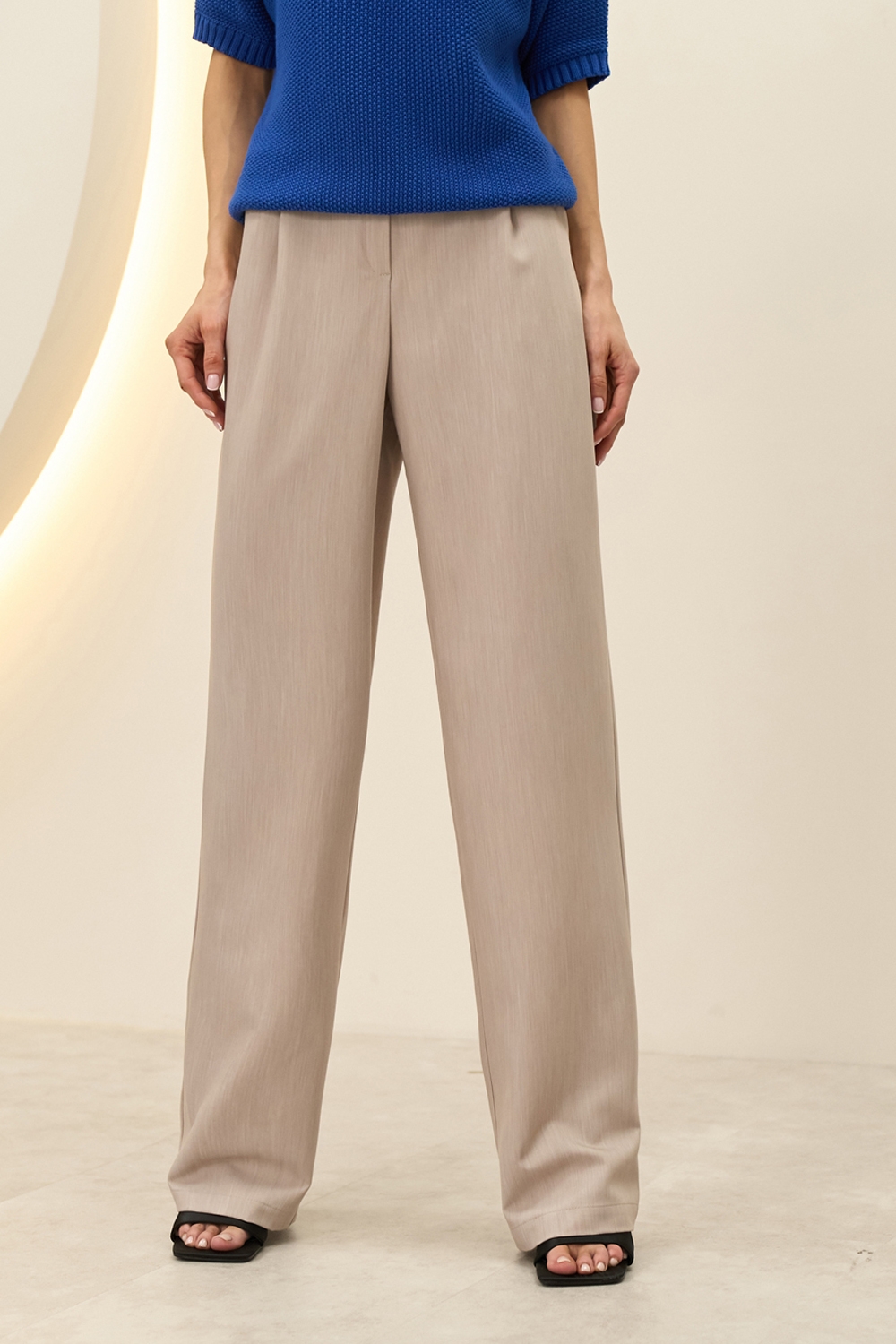 Класичні штани прямого крою з високою посадкою. Функціональні кишені в бакових швах та еластична резинка позаду виробу додають комфорту.