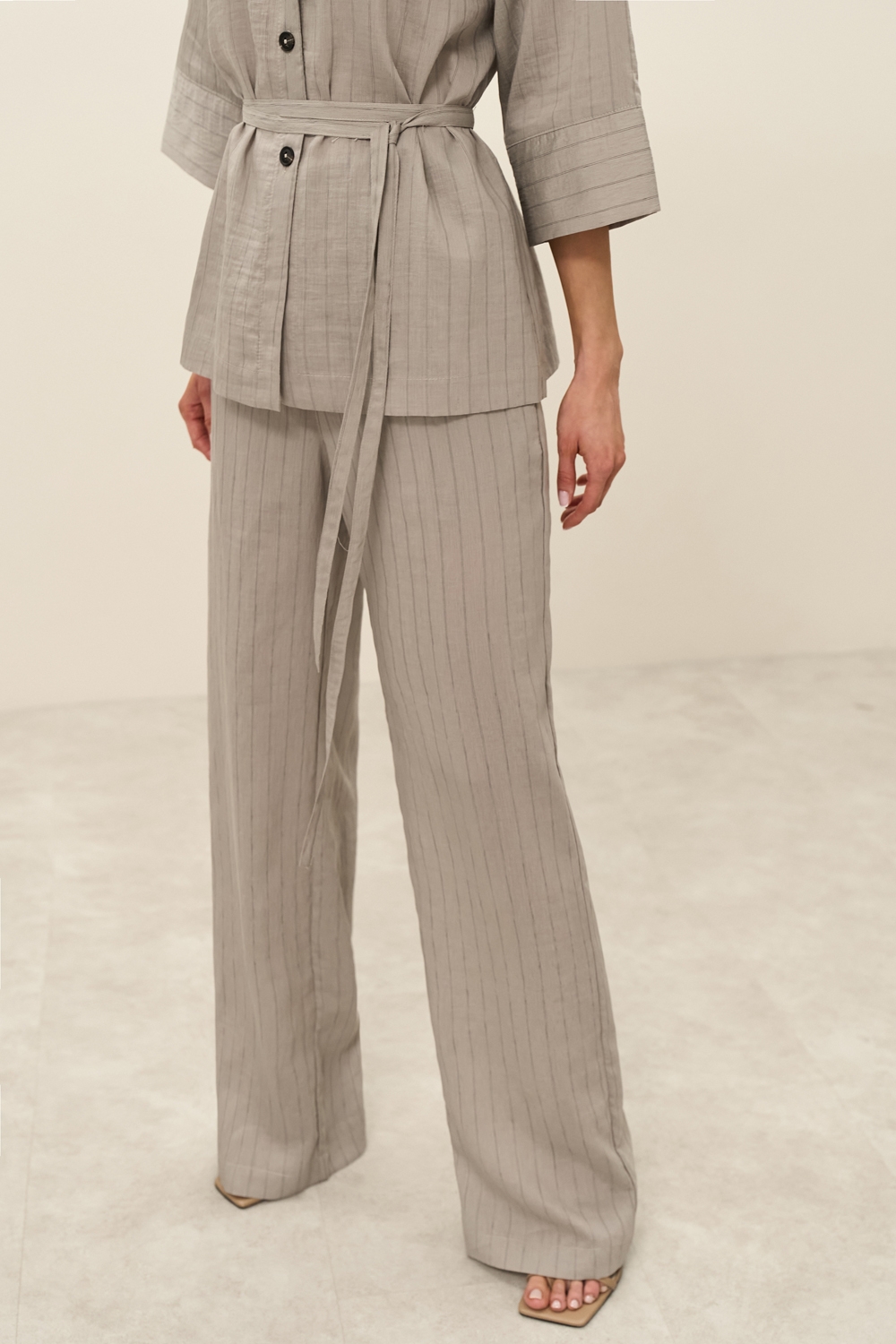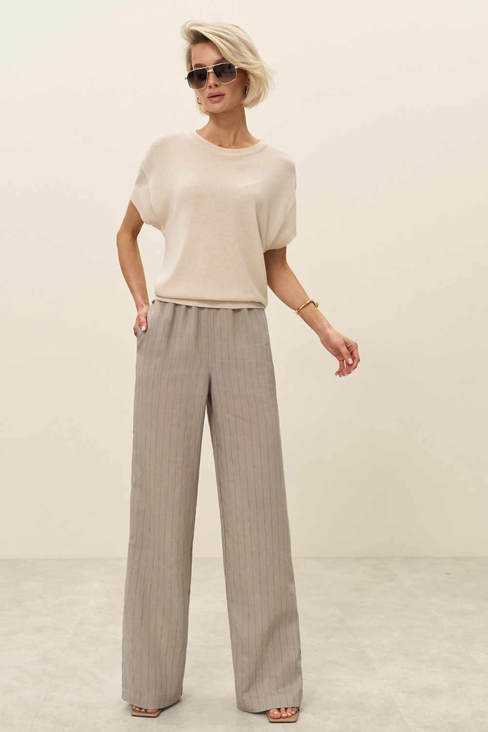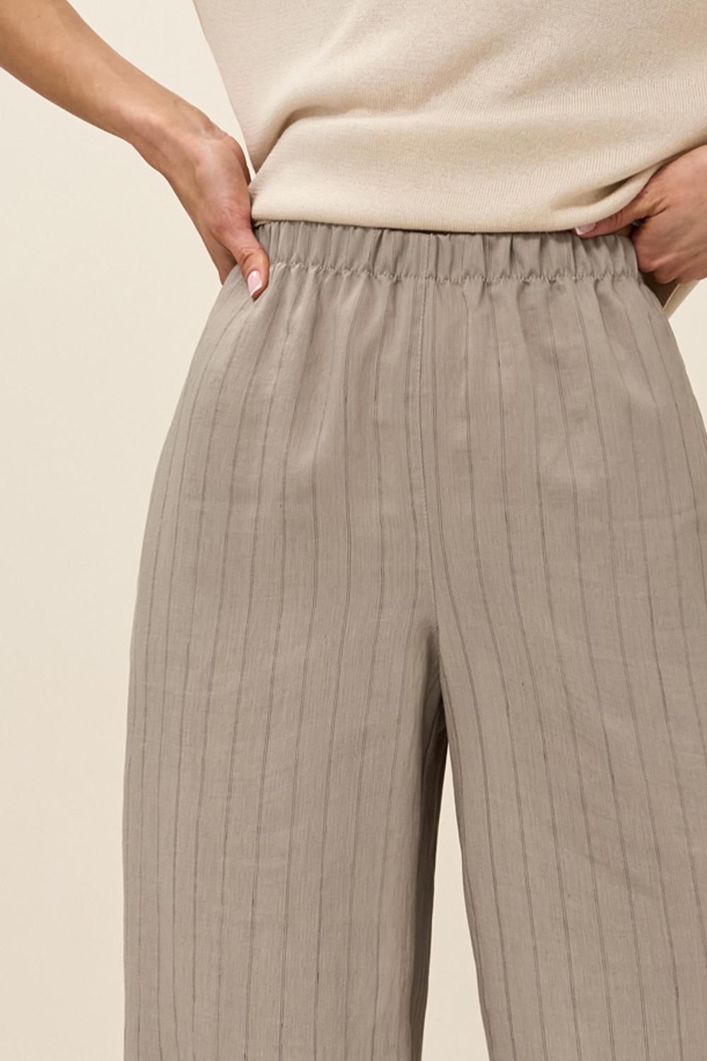 Штани із легкої струмуючої тканини з вмістом віскоза та льону. Модель середньої посадки, прямого силуету. На талії зручна еластична резинка. В бокових швах місткі кишені.