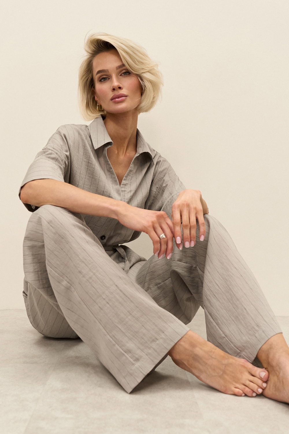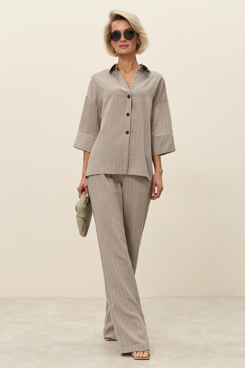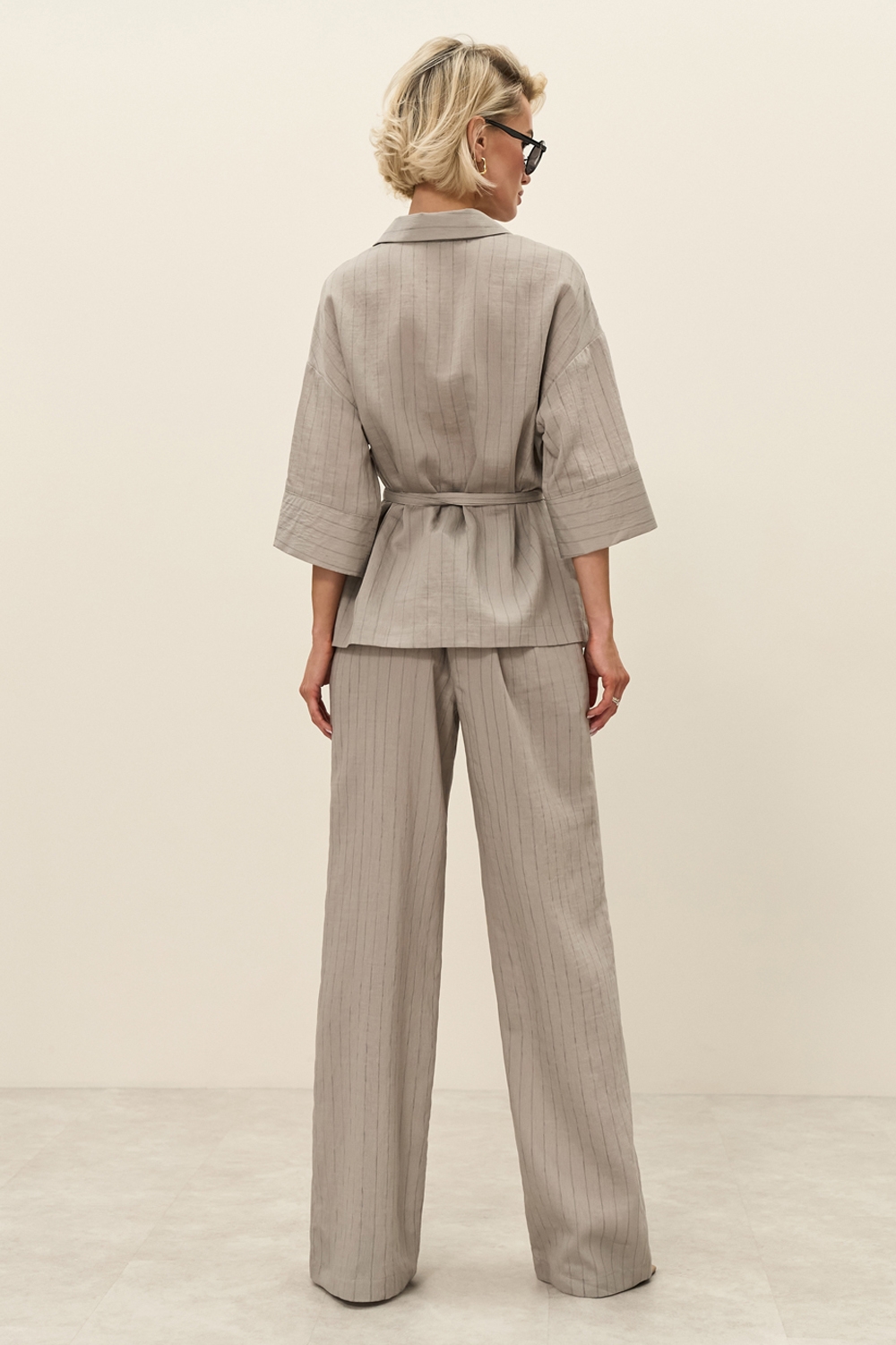 Штани із легкої струмуючої тканини з вмістом віскоза та льону. Модель середньої посадки, прямого силуету. На талії зручна еластична резинка. В бокових швах місткі кишені.