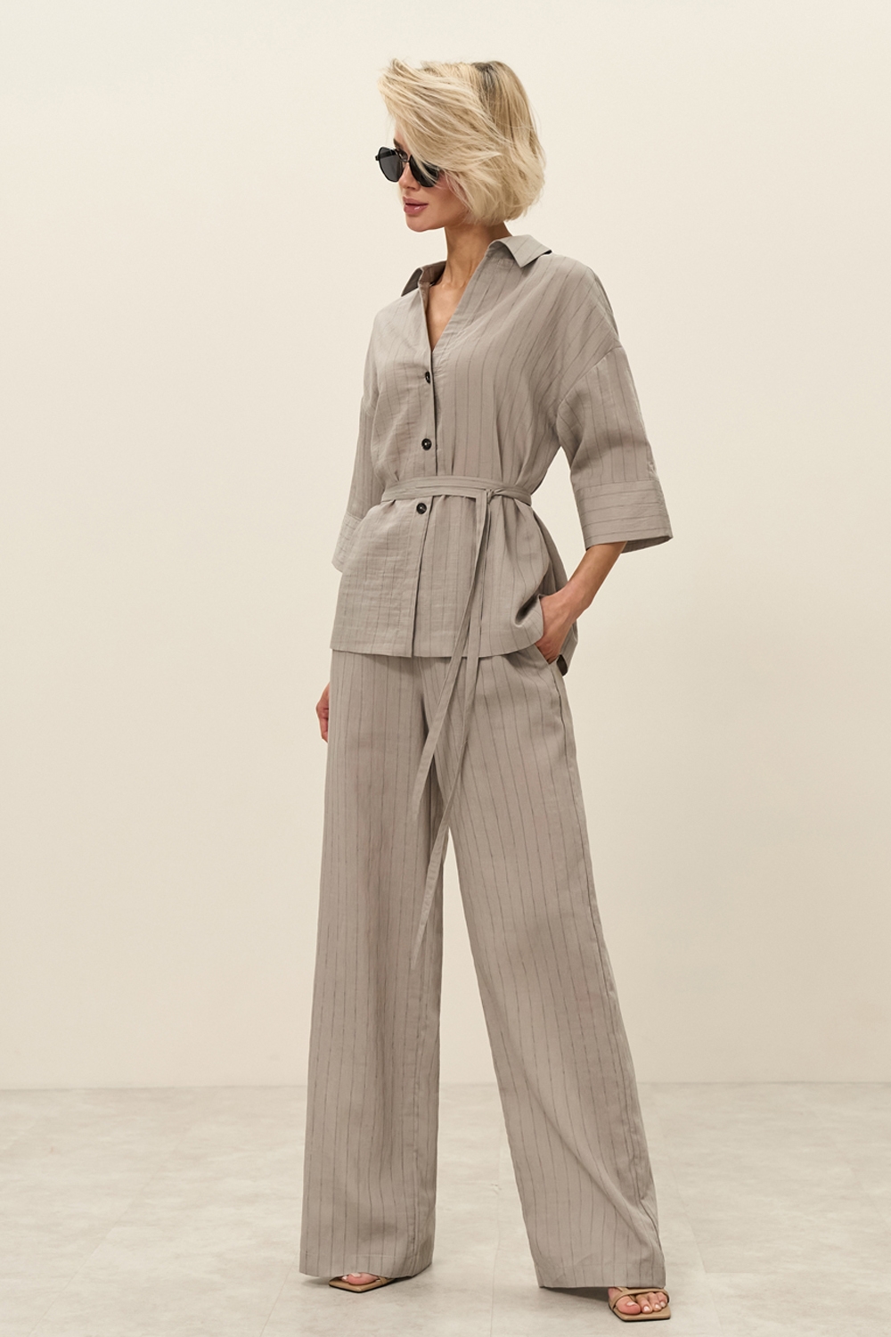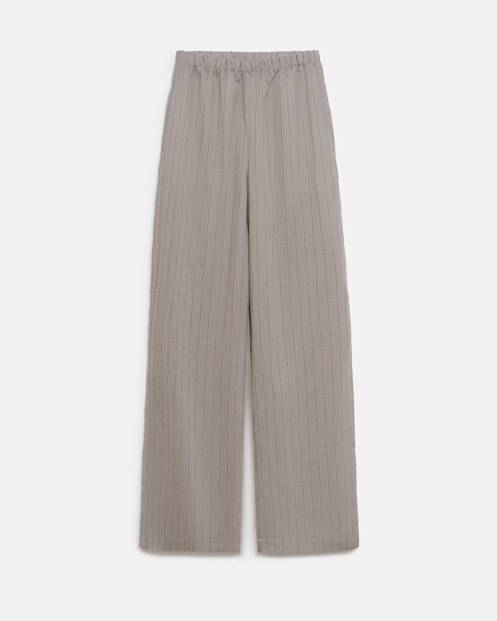Штани із легкої струмуючої тканини з вмістом віскоза та льону. Модель середньої посадки, прямого силуету. На талії зручна еластична резинка. В бокових швах місткі кишені.