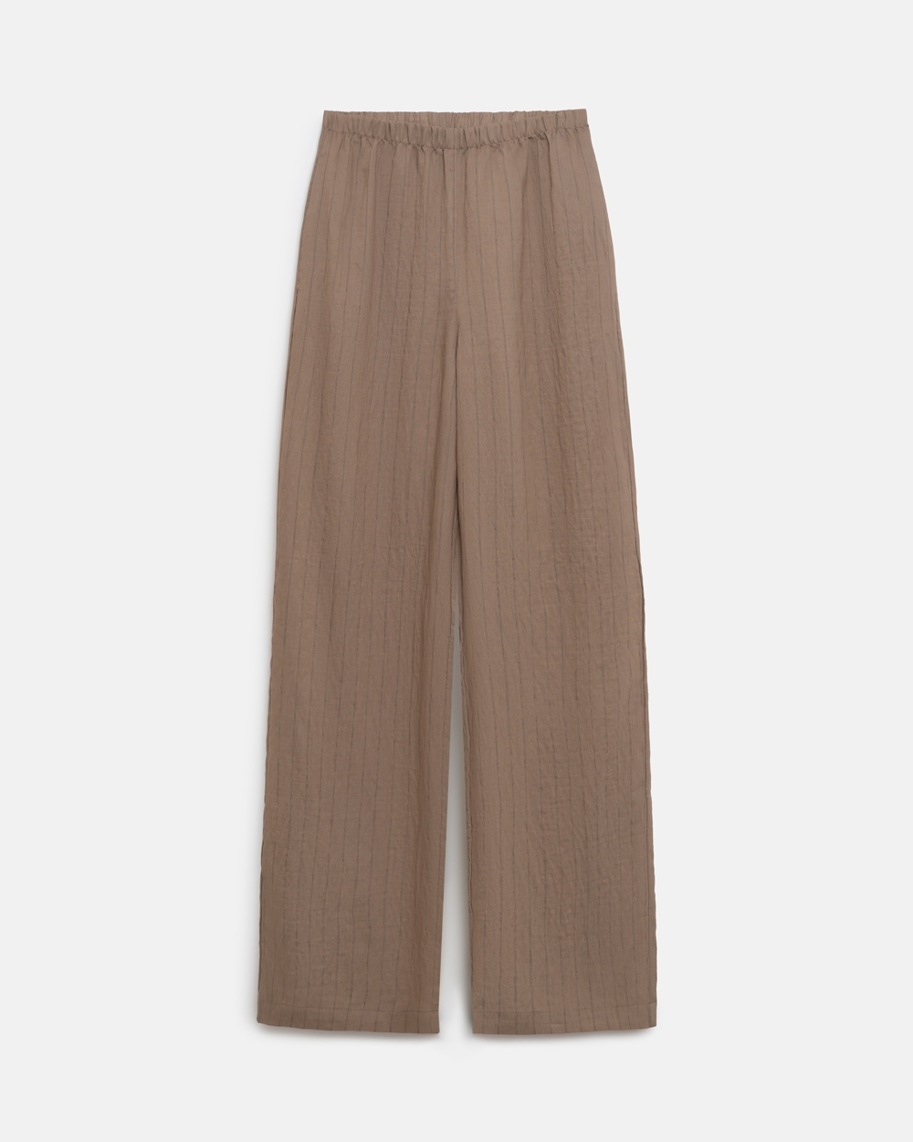 Штани із легкої струмуючої тканини з вмістом віскоза та льону. Модель середньої посадки, прямого силуету. На талії зручна еластична резинка. В бокових швах місткі кишені.