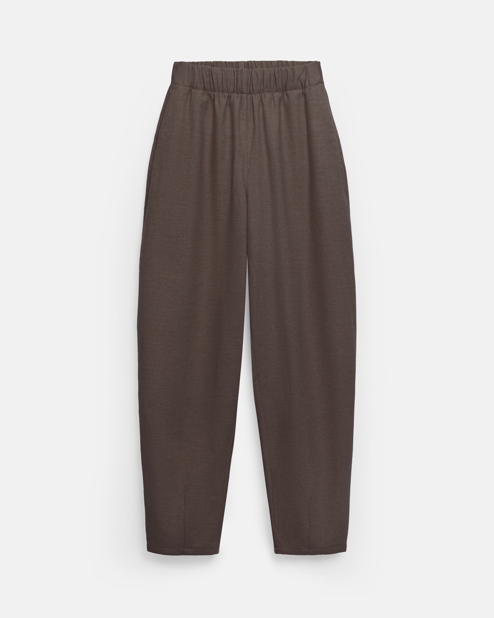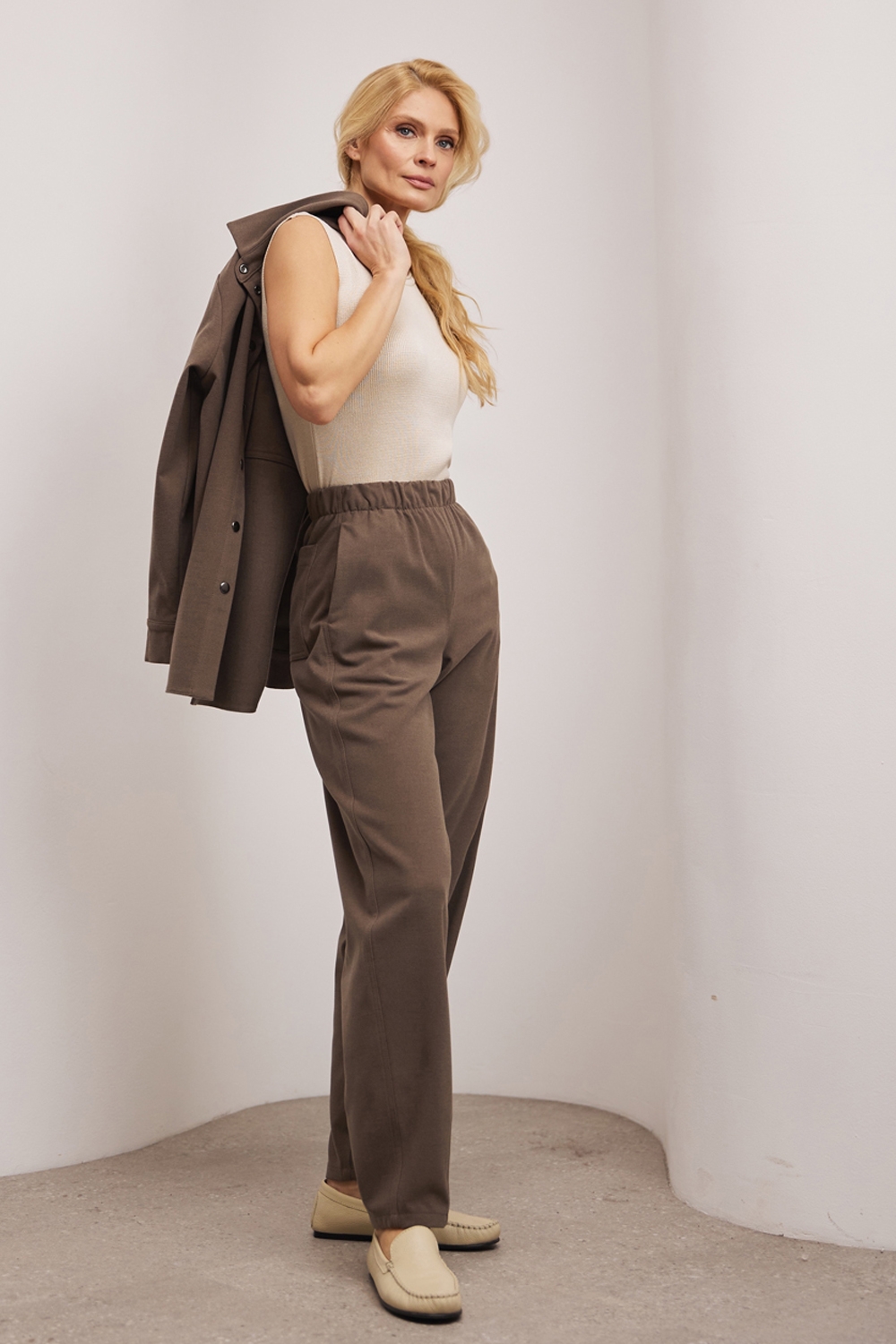 Штани зі щільної віскозної тканини з додаванням вовни. Матеріал м’який і приємний на дотик. Модель з високою посадкою та комфортним еластичним поясом. В бокових швах та позаду місткі кишені