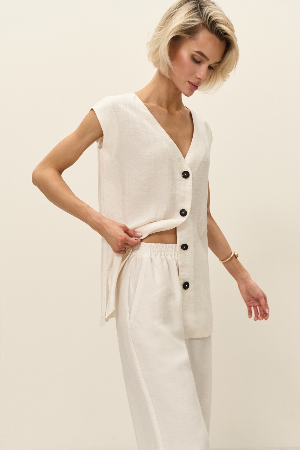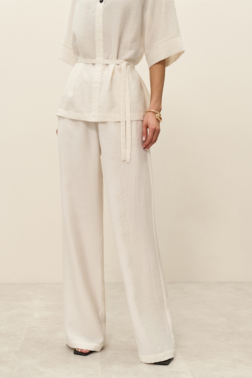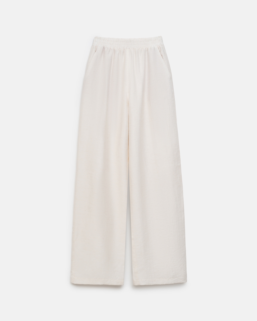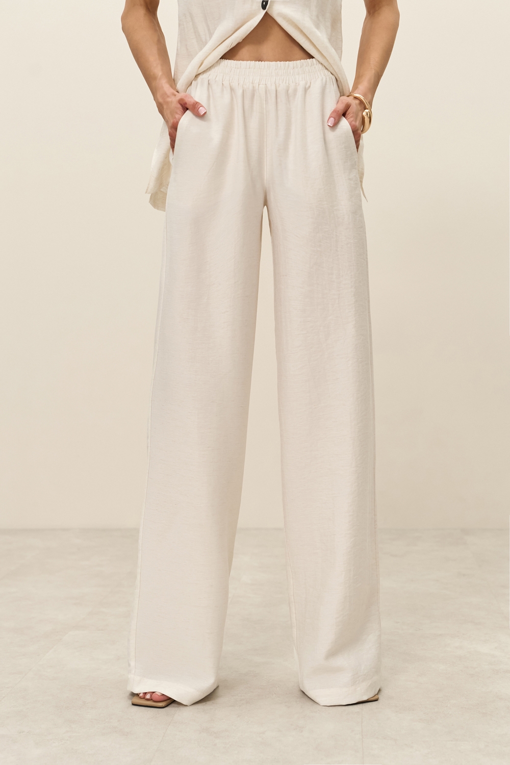 Легкі штани виконані з натуральної тканини з включенням віскози та льону. Еластична резинка забезпечує комфортну посадку по талії. В бокових швах місткі кишені.