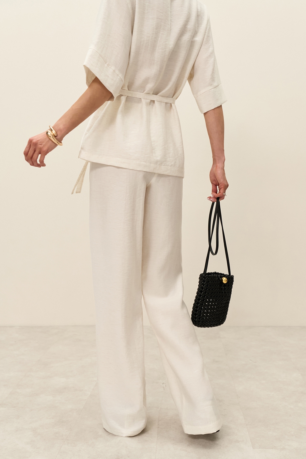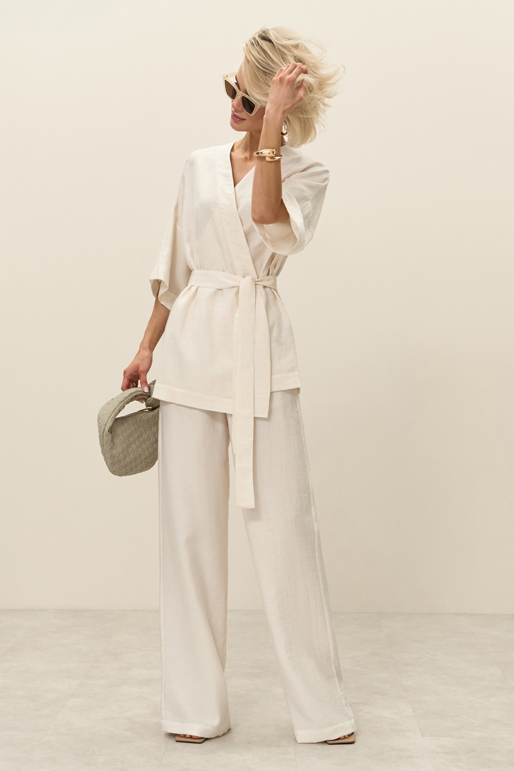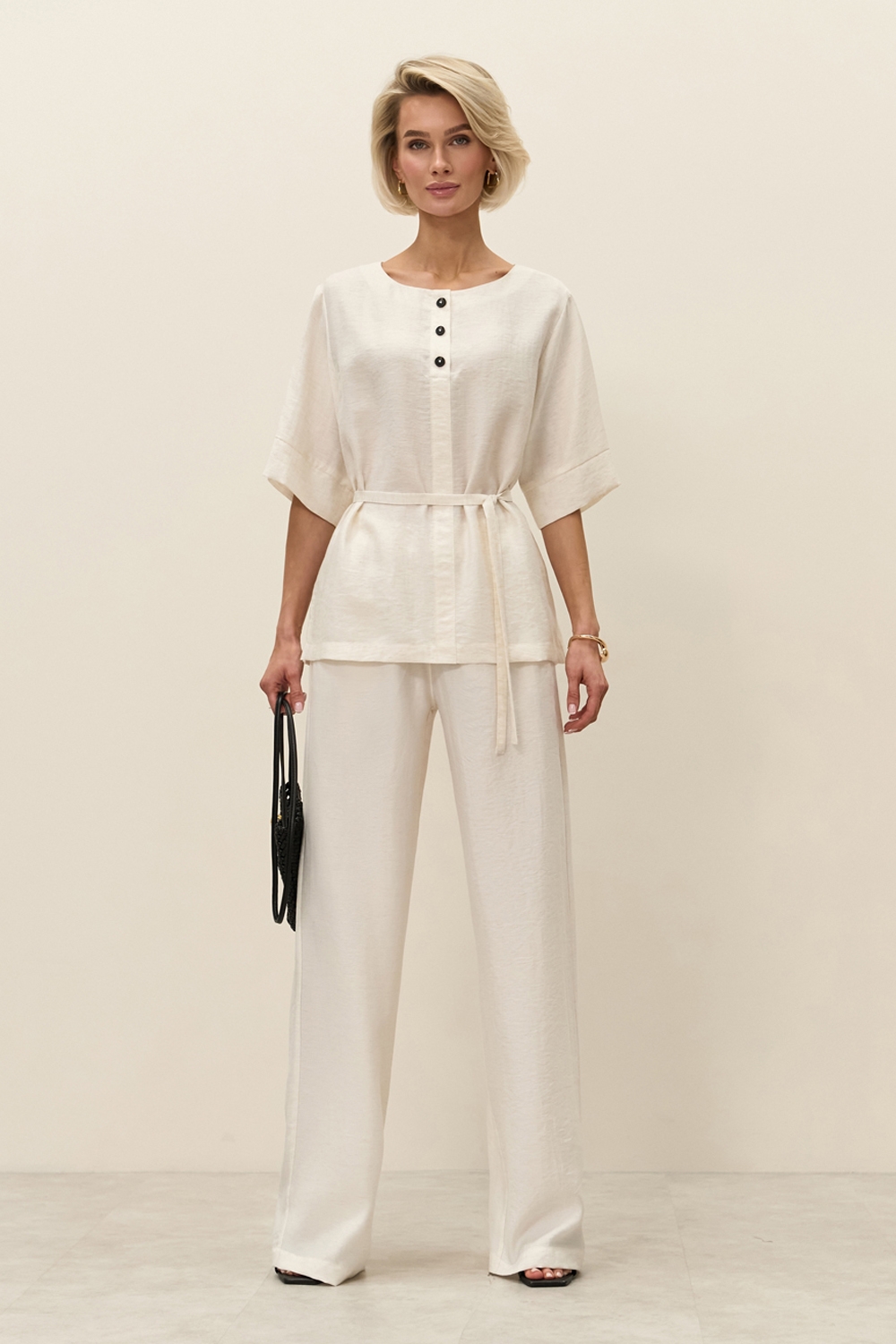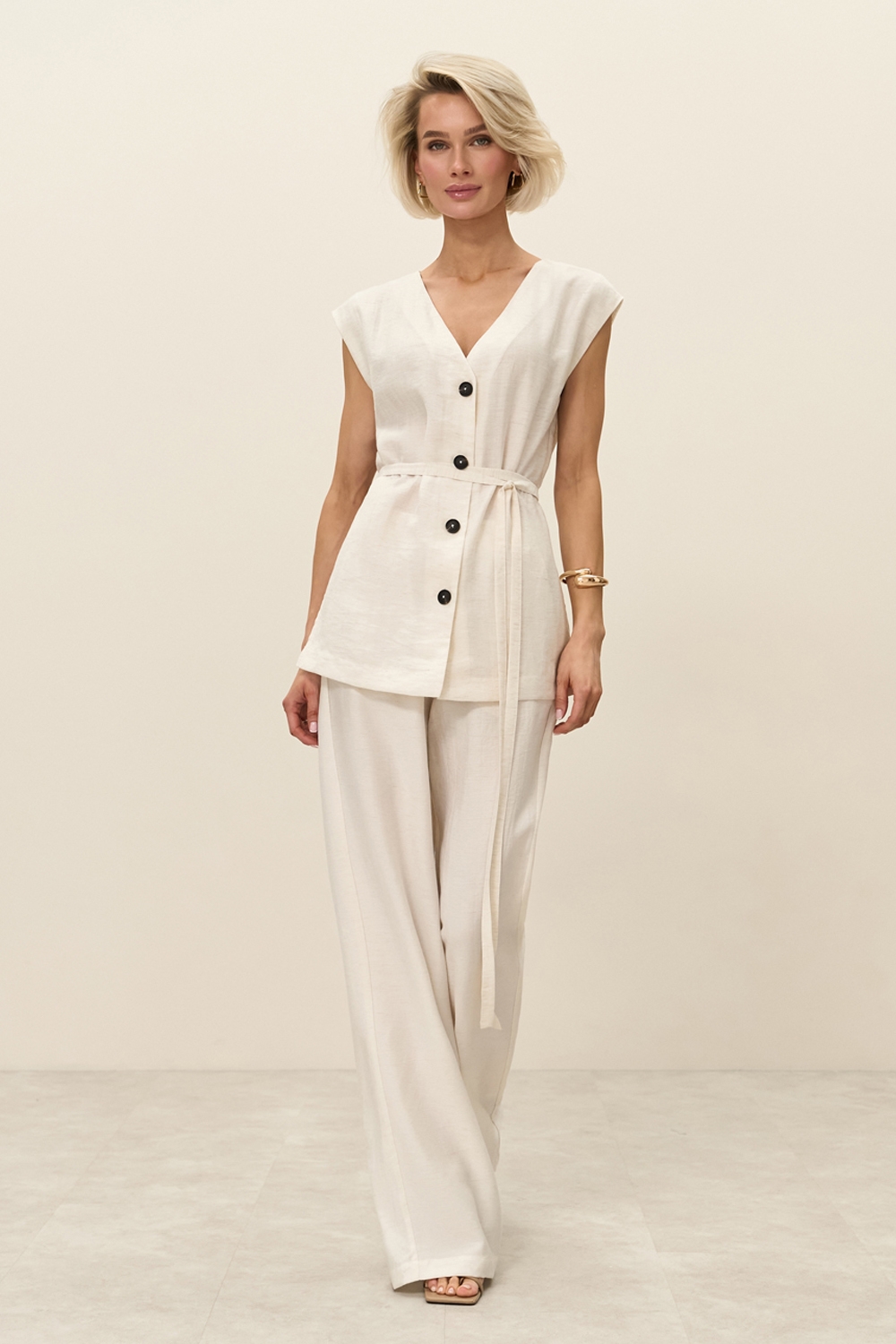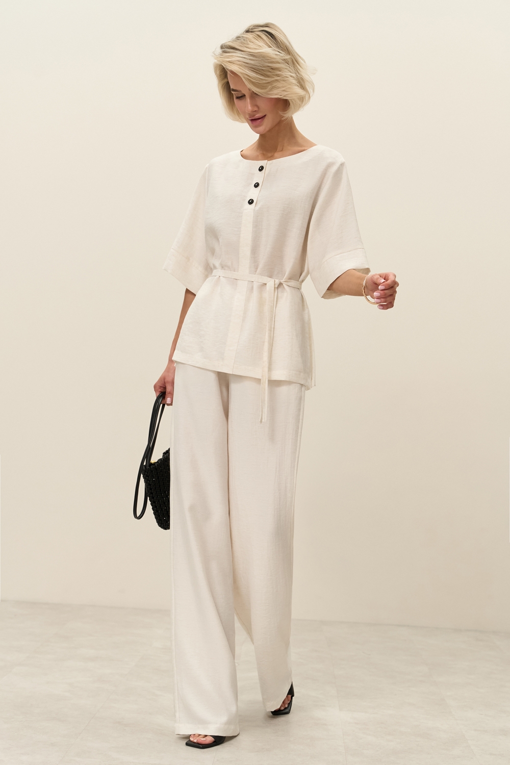 Легкі штани виконані з натуральної тканини з включенням віскози та льону. Еластична резинка забезпечує комфортну посадку по талії. В бокових швах місткі кишені.