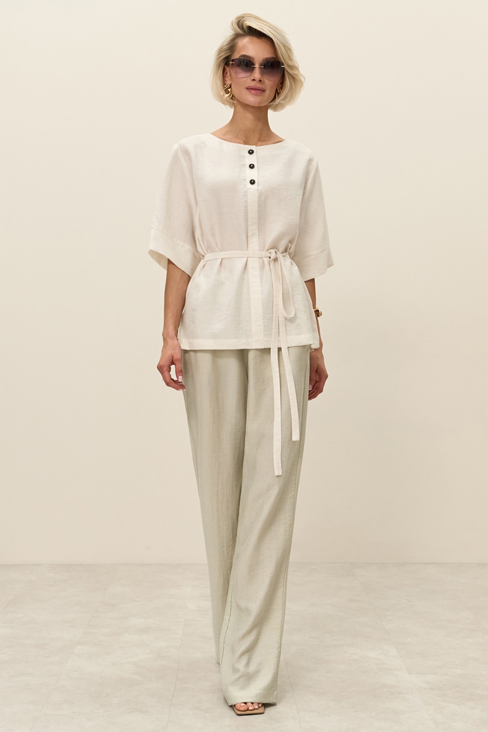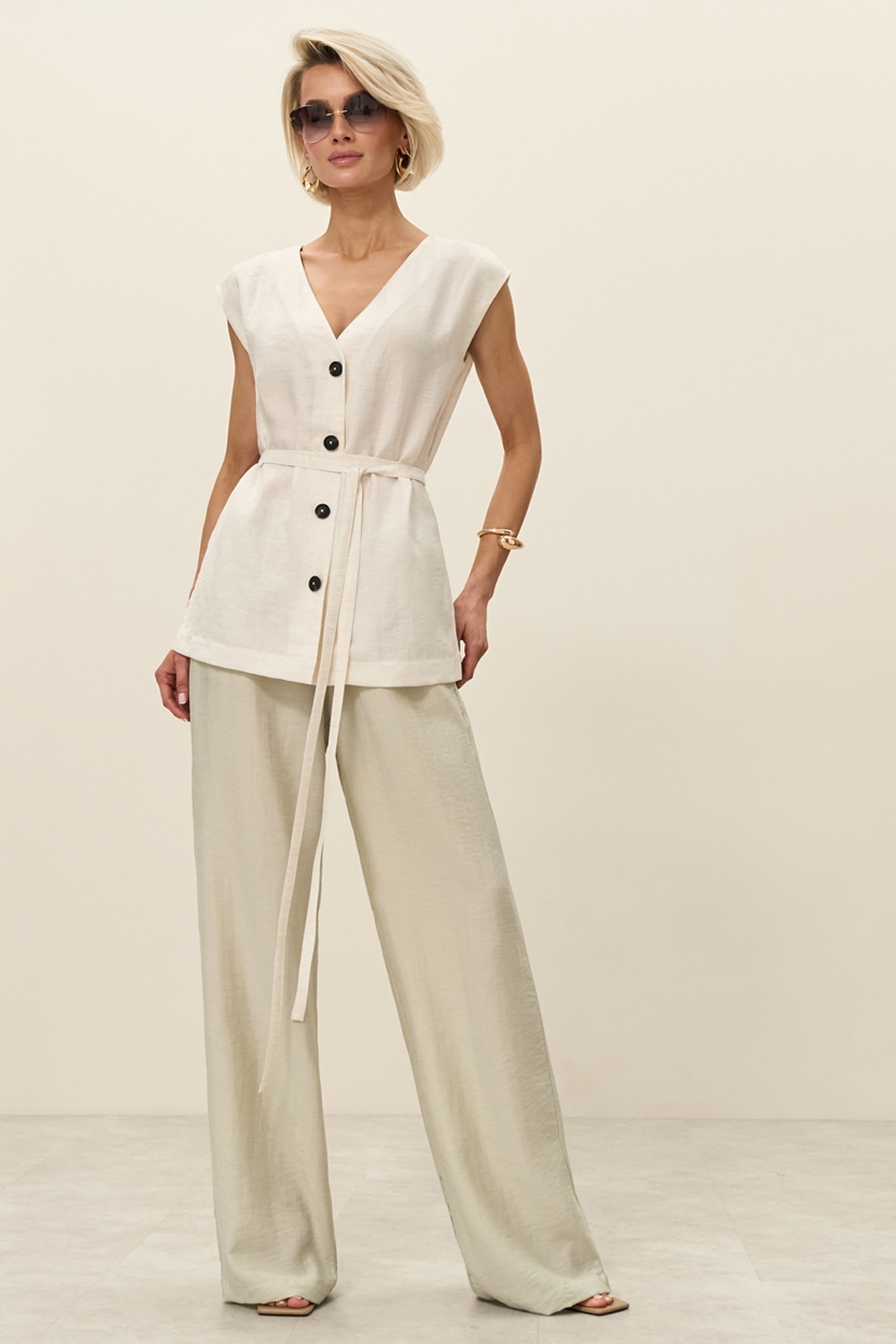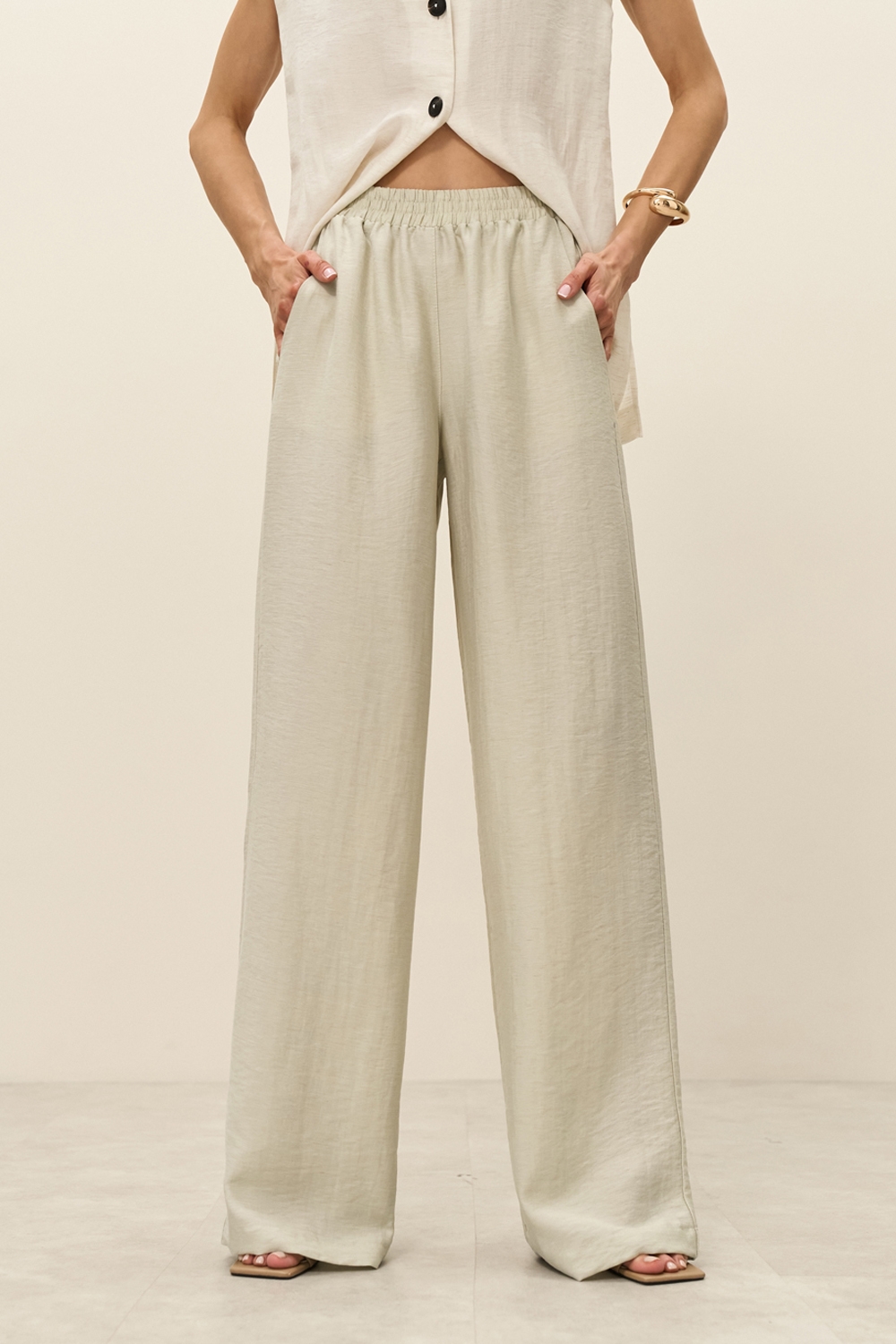 Легкі штани виконані з натуральної тканини з включенням віскози та льону. Еластична резинка забезпечує комфортну посадку по талії. В бокових швах місткі кишені.