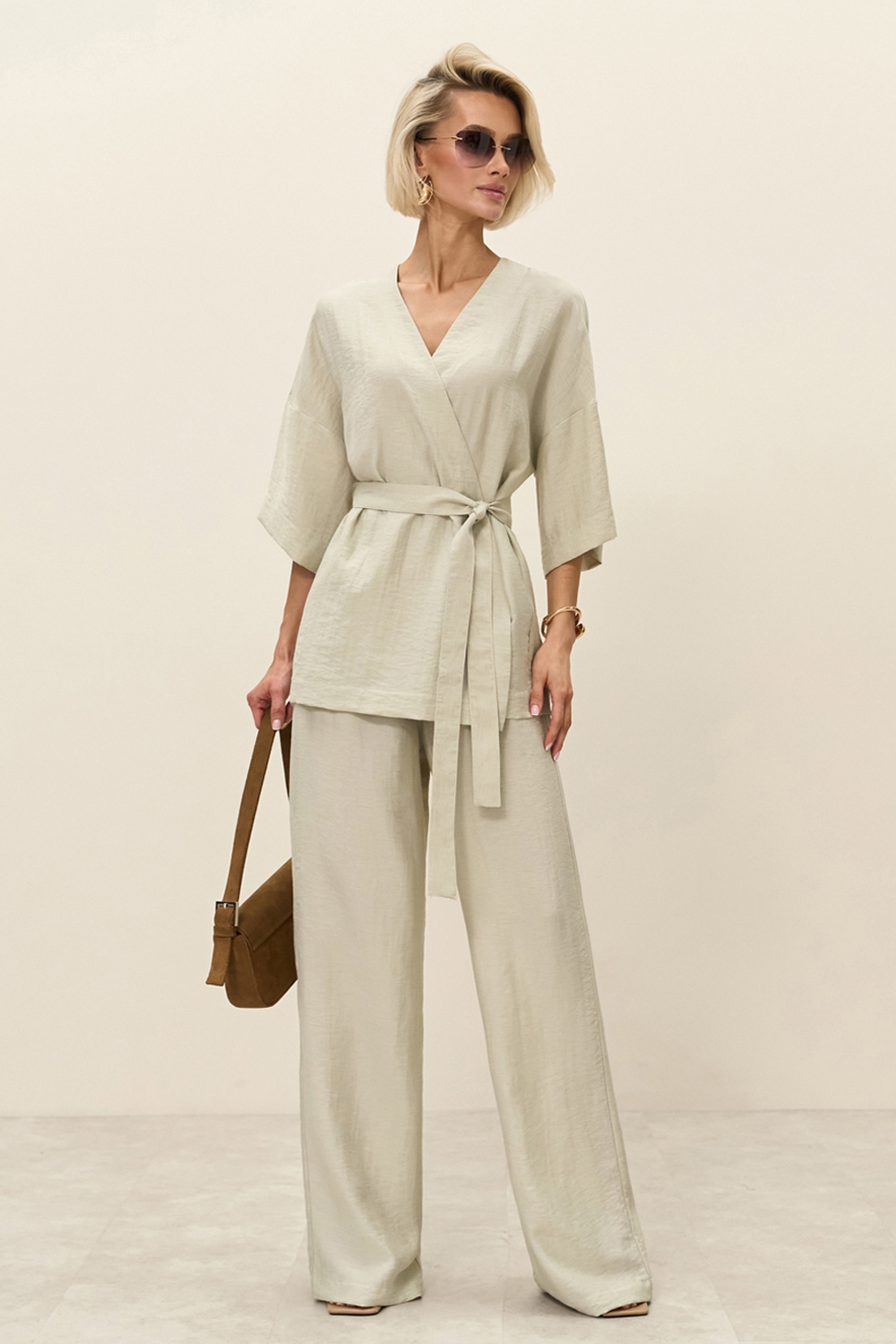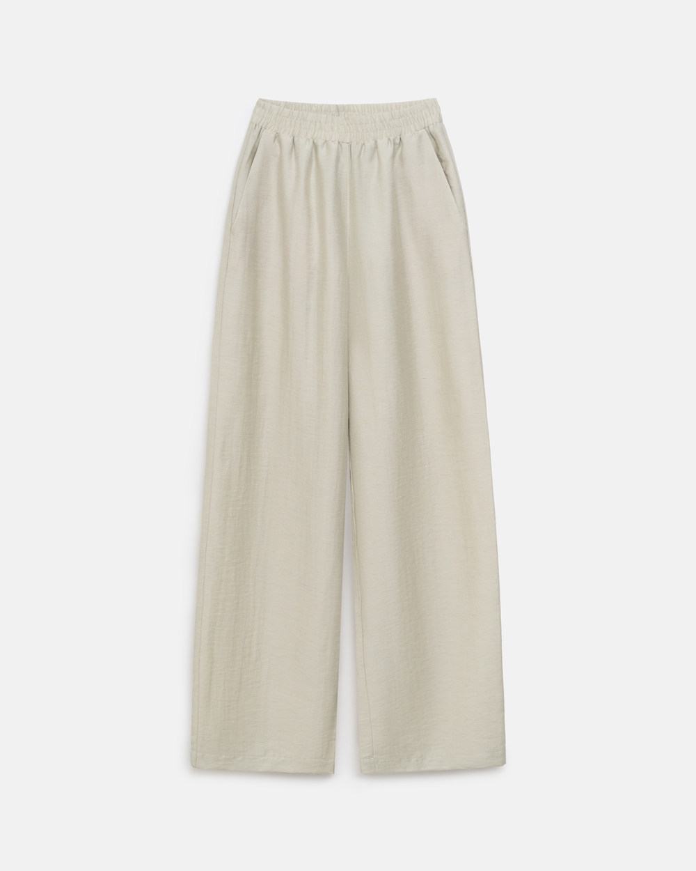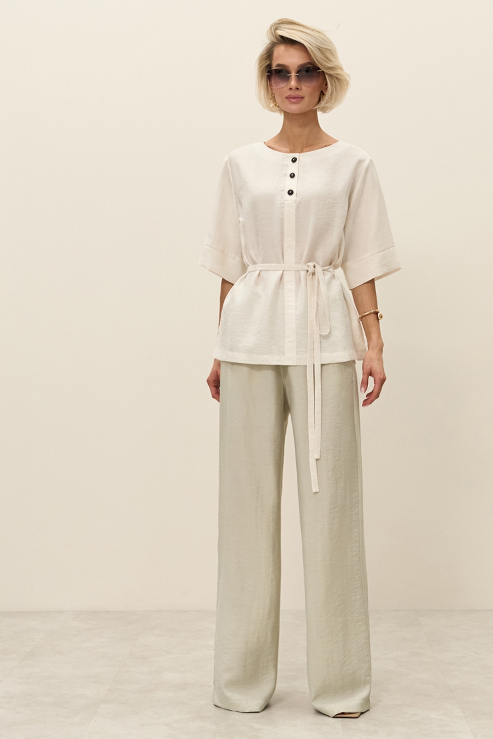 Легкі штани виконані з натуральної тканини з включенням віскози та льону. Еластична резинка забезпечує комфортну посадку по талії. В бокових швах місткі кишені.