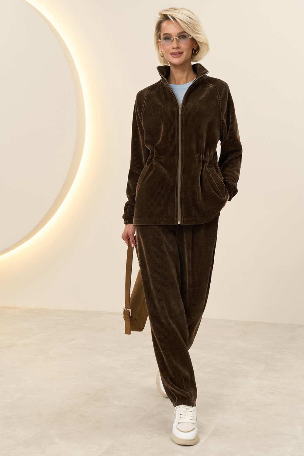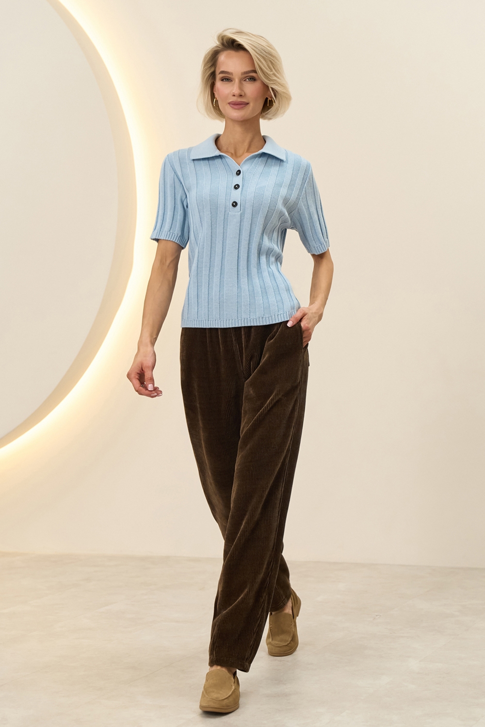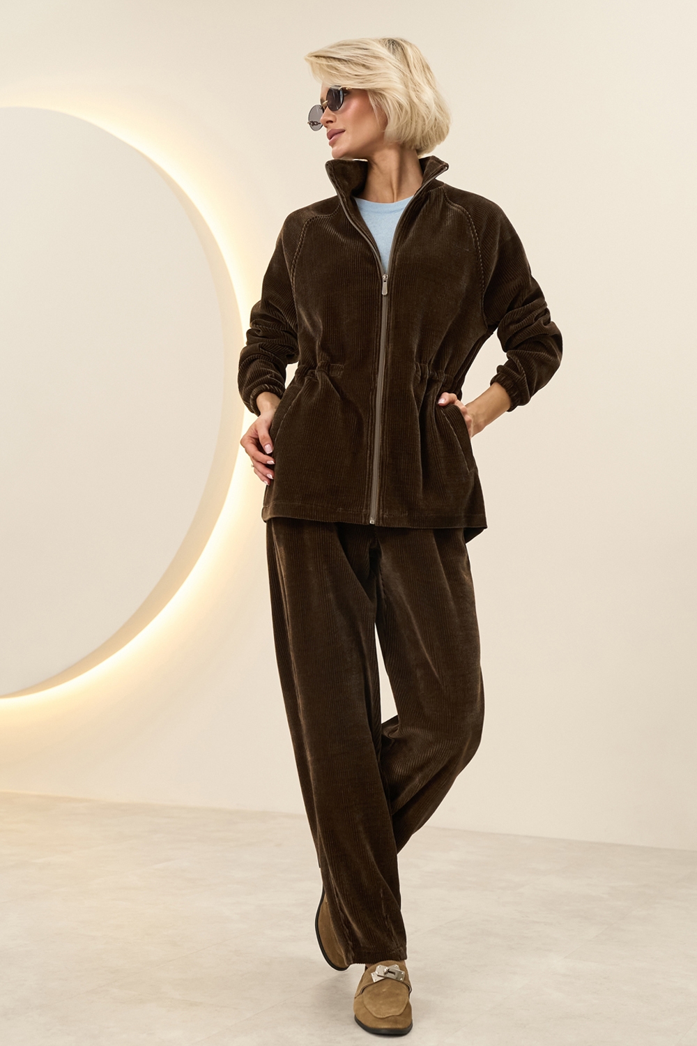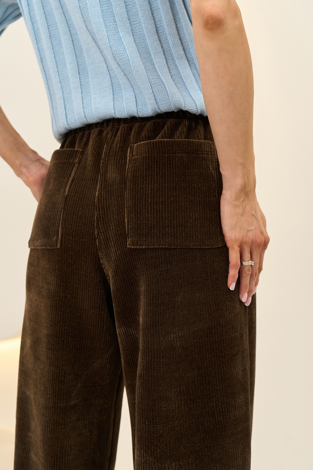 Комфортні штани виготовлені з м'якої вельветової тканини на трикотажні основі. Модель вільного фасону з невеликим завуженням до низу. На талії комфортна резинка. Місткі кишені в бокових швах.