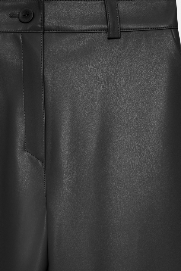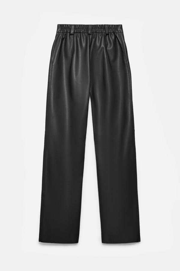 Стильні штани виготовлені із пластичної, приємної на дотик екошкіри із замшевою текстурою з вивороту. Завдяки прямому крою та високій посадці вони ідеально сідають по фігурі, а декоративні шви додають образу актуальності.