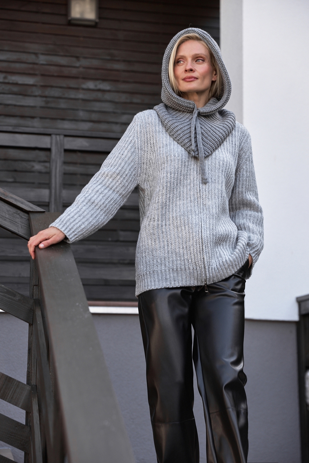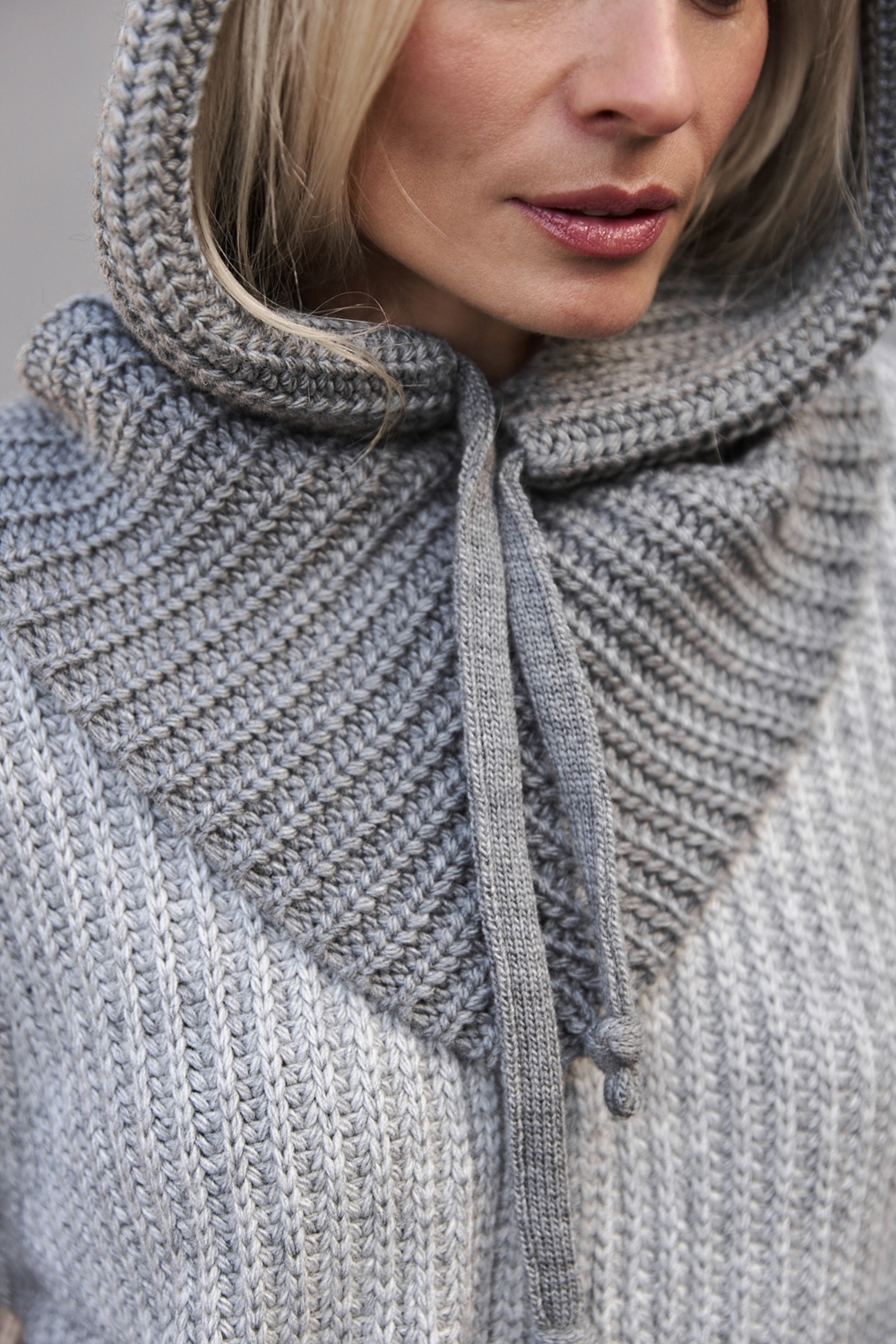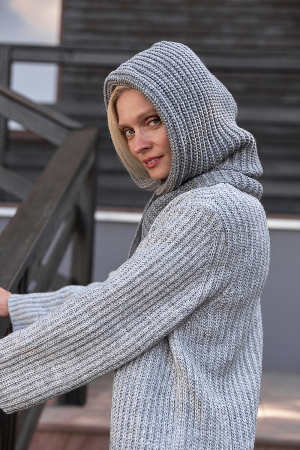 Теплий снуд із напіввовняної пряжі, виконаний щільною рельєфною в’язкою. Широкий комір надійно захищає шию. Функціональні зав’язки дозволяють регулювати ширину каптура.