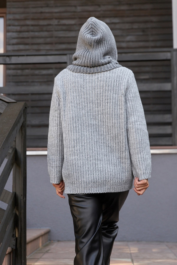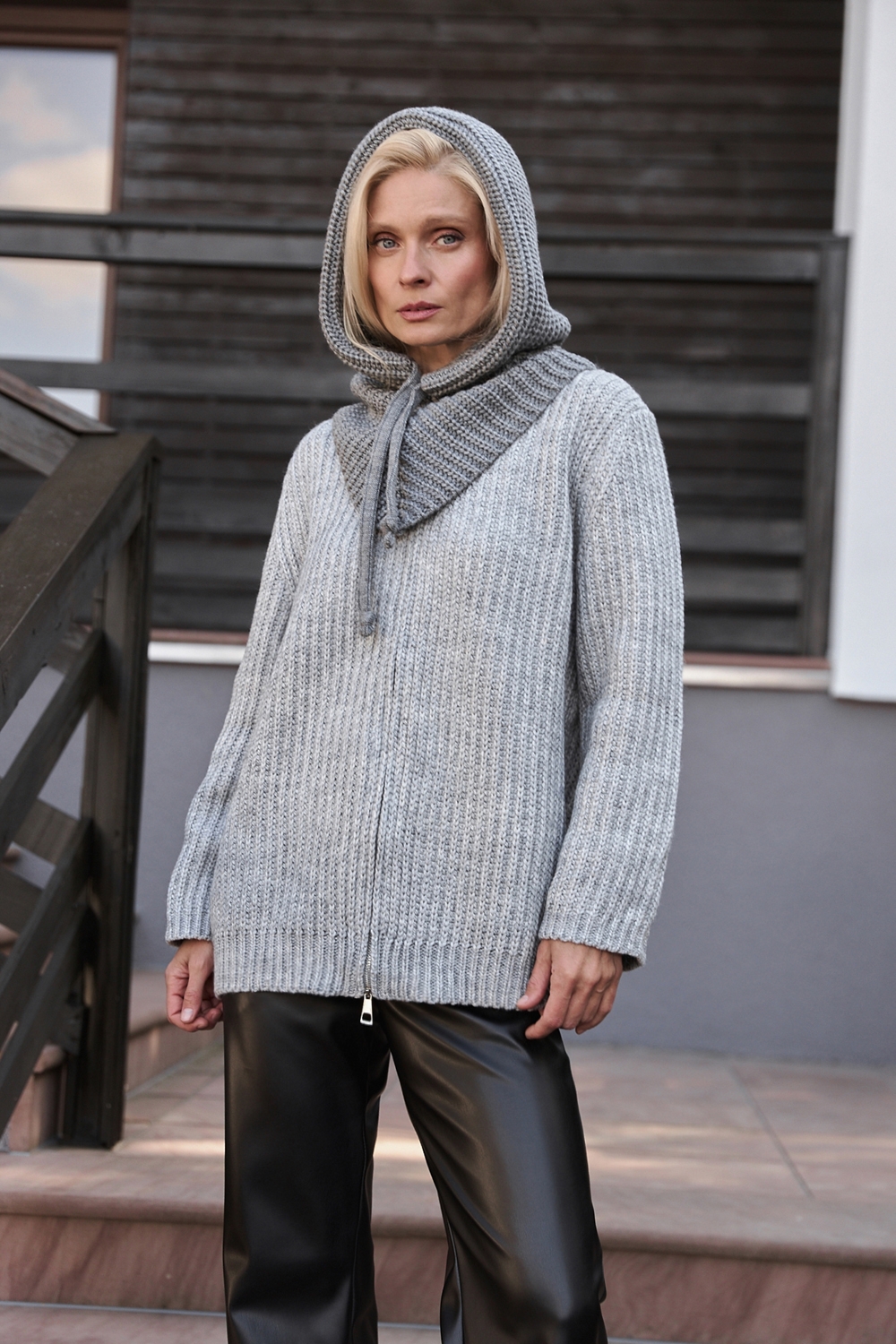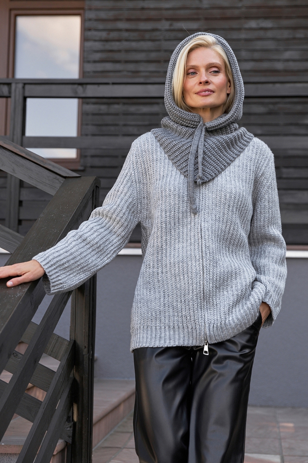 Теплий снуд із напіввовняної пряжі, виконаний щільною рельєфною в’язкою. Широкий комір надійно захищає шию. Функціональні зав’язки дозволяють регулювати ширину каптура.