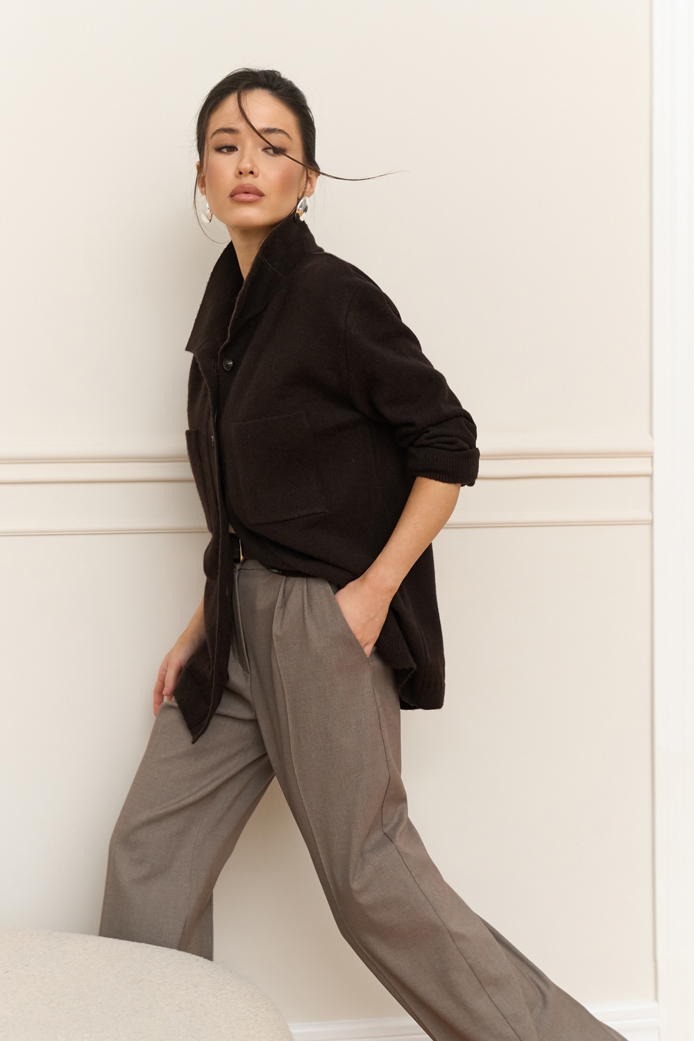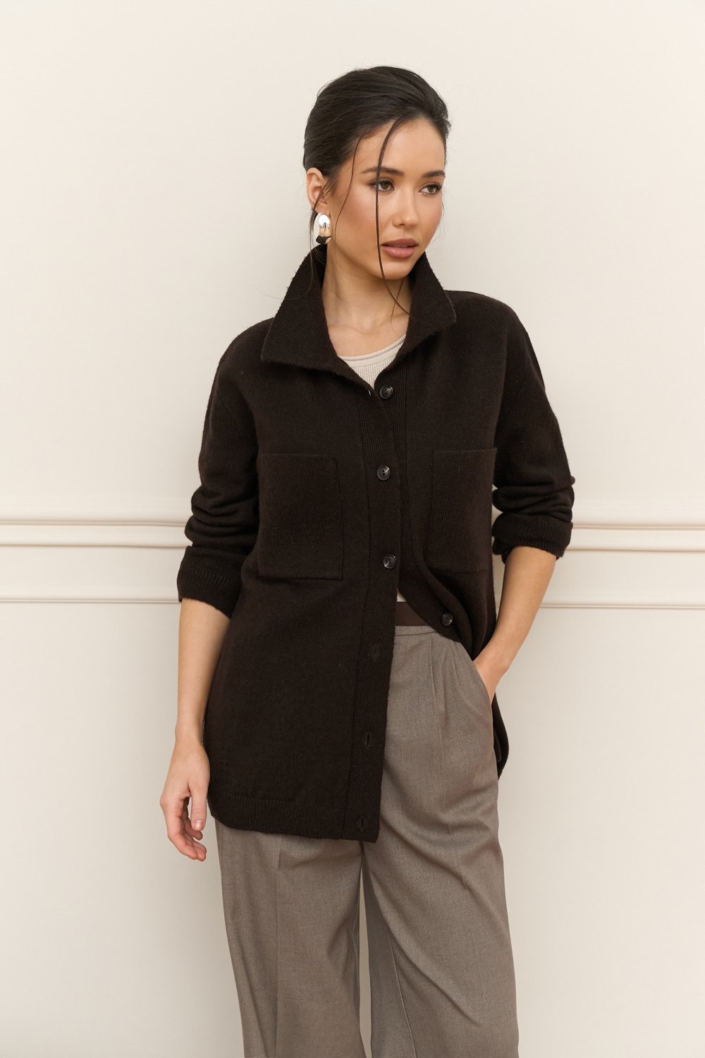 Трендова сорочка виконана щільним плетінням із преміальної пряжі з додаванням мериносової вовни та мохеру. Вільний, зручний силует. На грудях — дві функціональні кишені.