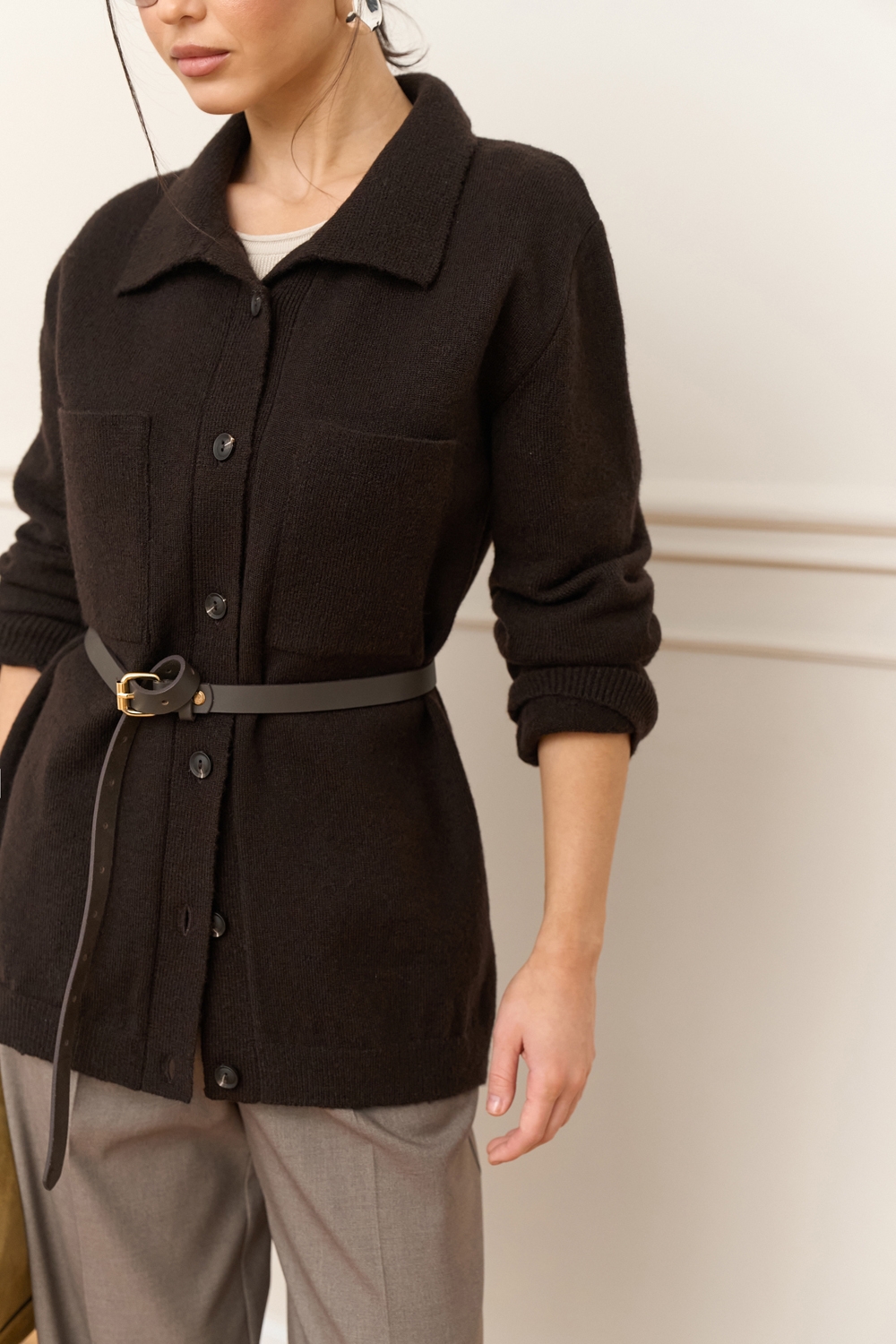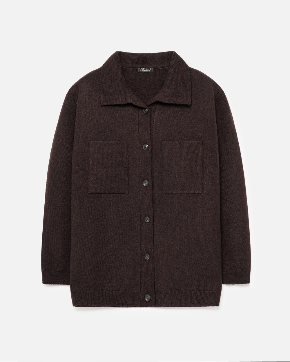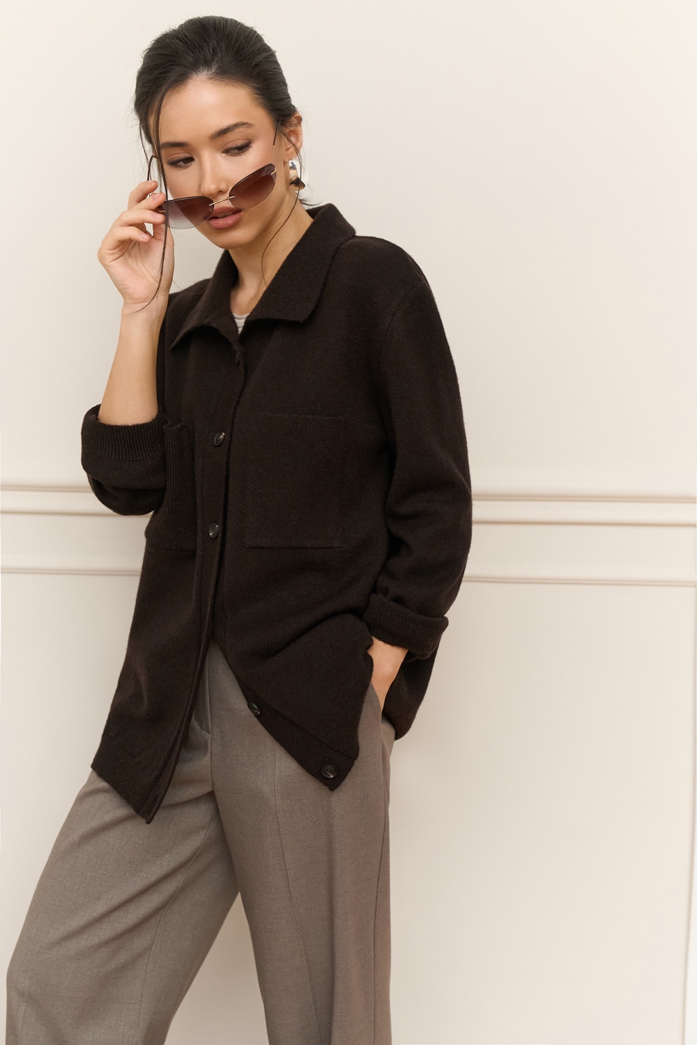 Трендова сорочка виконана щільним плетінням із преміальної пряжі з додаванням мериносової вовни та мохеру. Вільний, зручний силует. На грудях — дві функціональні кишені.