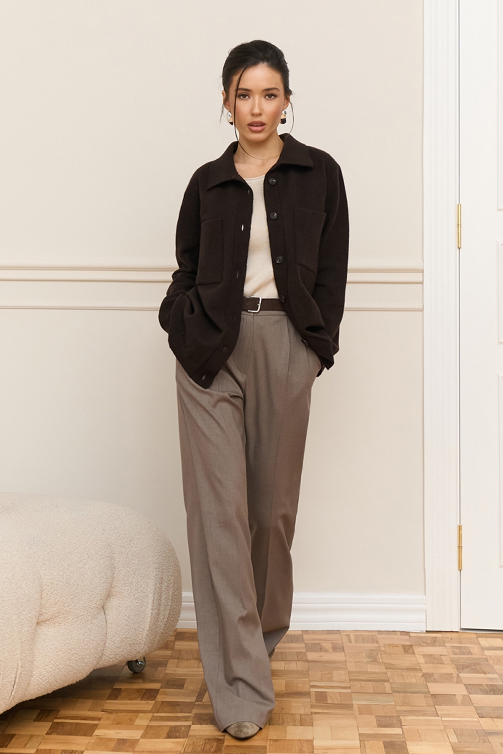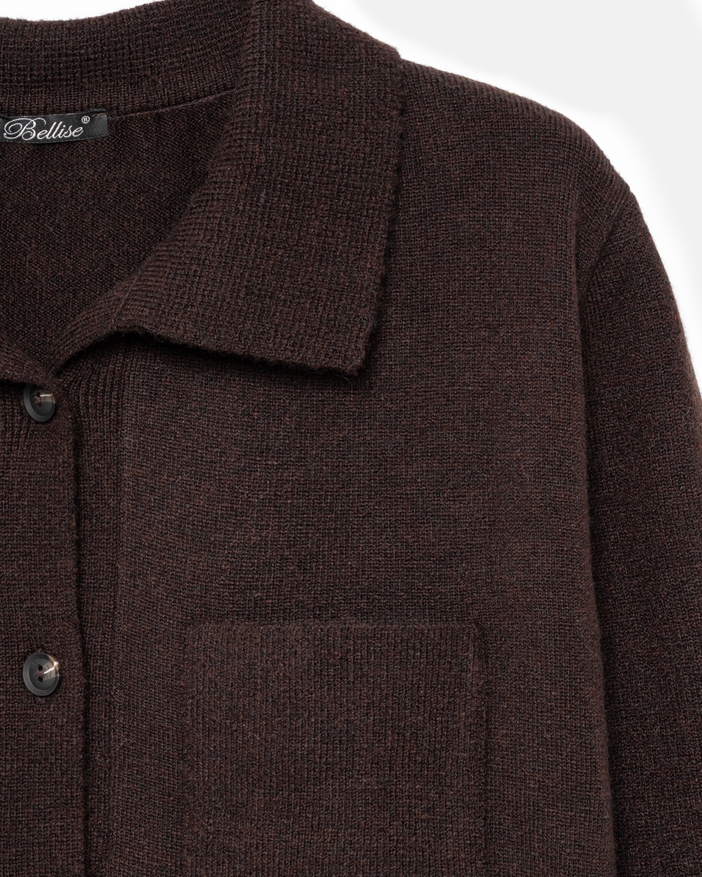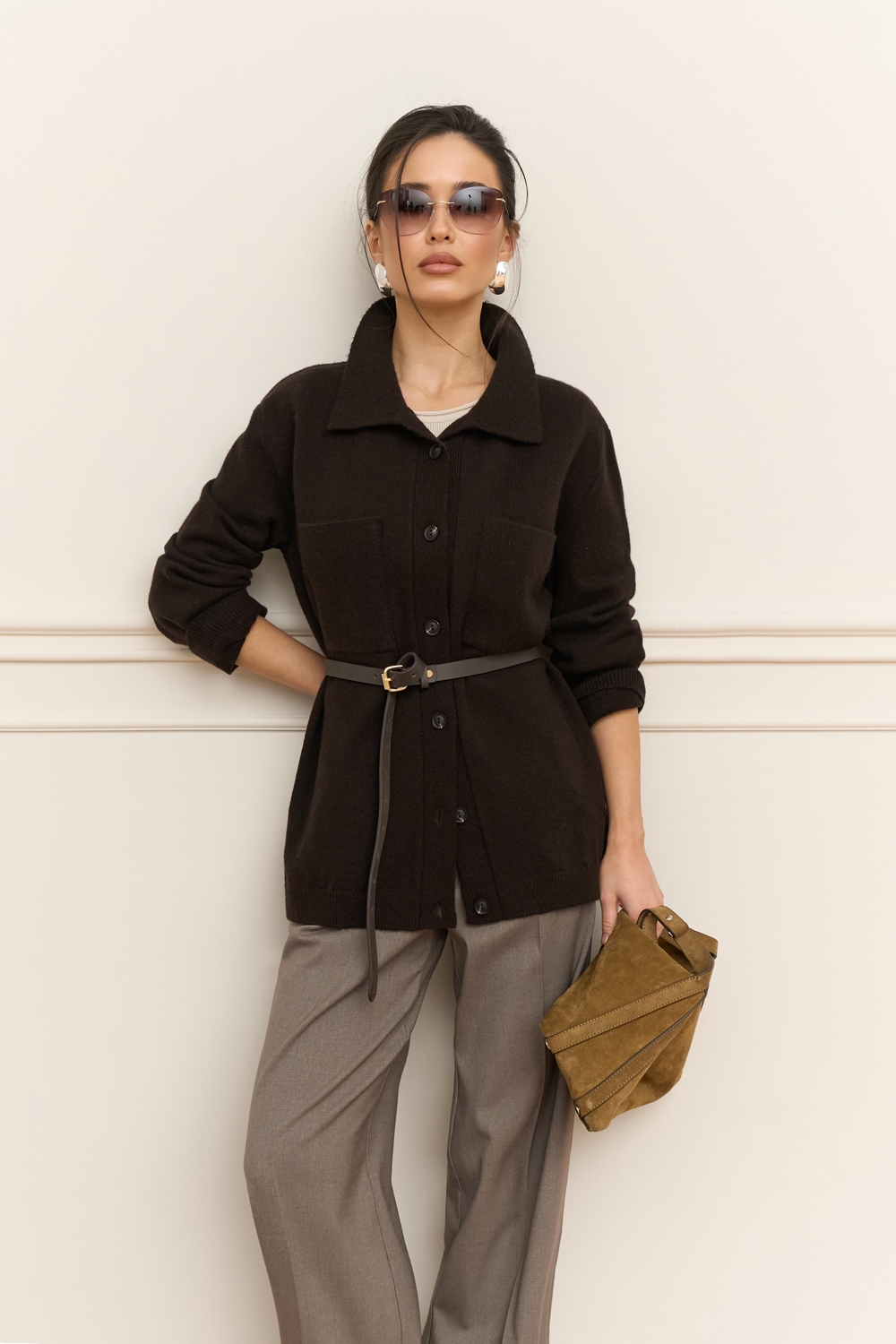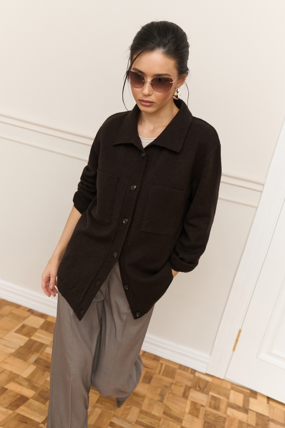 Трендова сорочка виконана щільним плетінням із преміальної пряжі з додаванням мериносової вовни та мохеру. Вільний, зручний силует. На грудях — дві функціональні кишені.