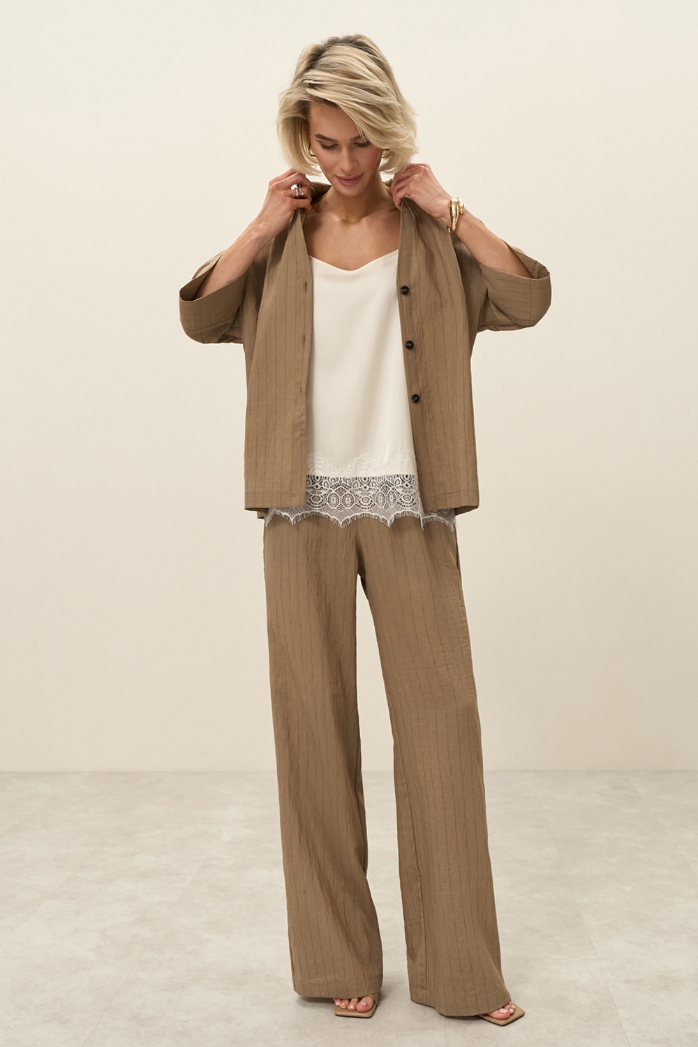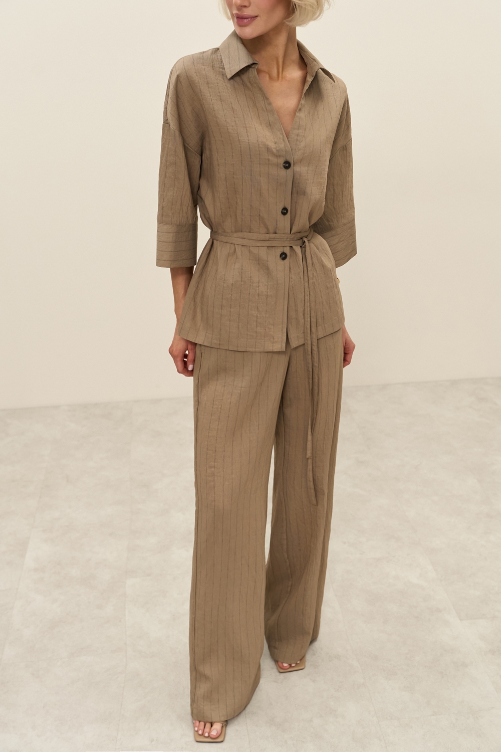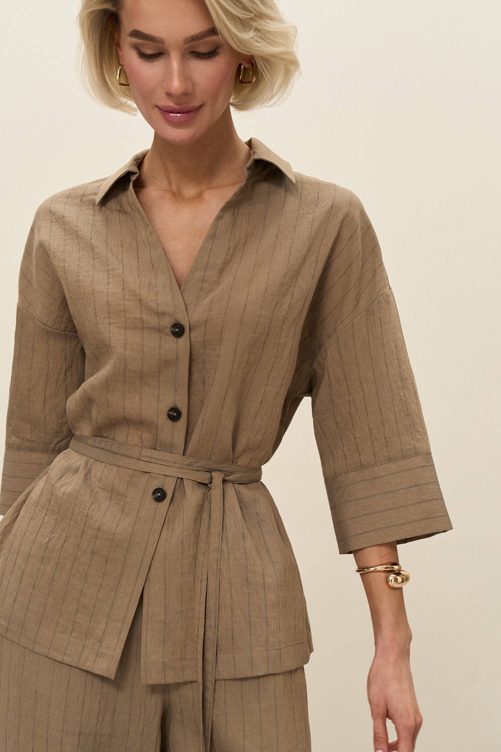 Сорочка виготовлена із легкої струмуючої тканини з вмістом віскоза та льону. Модель вільного, прямого силуету. Широкі манжети на рукавах додають актуальності. Пояс у комплекті.