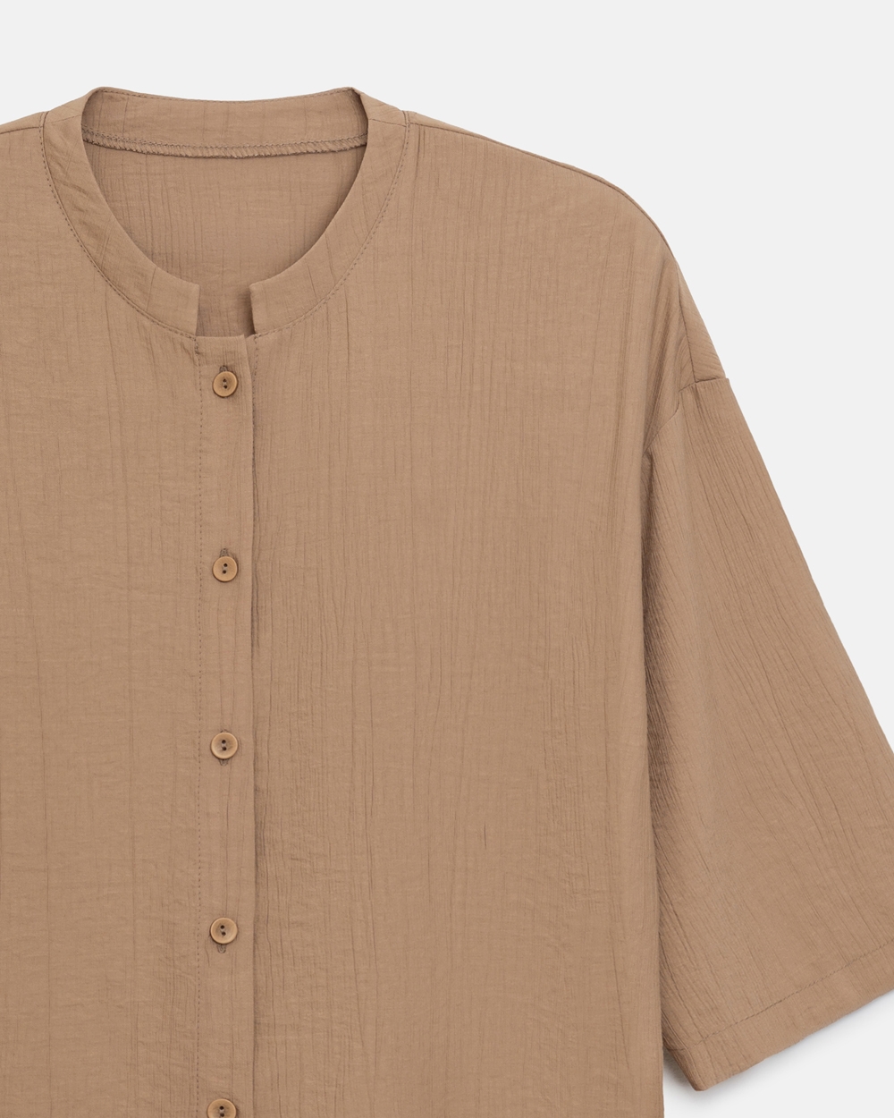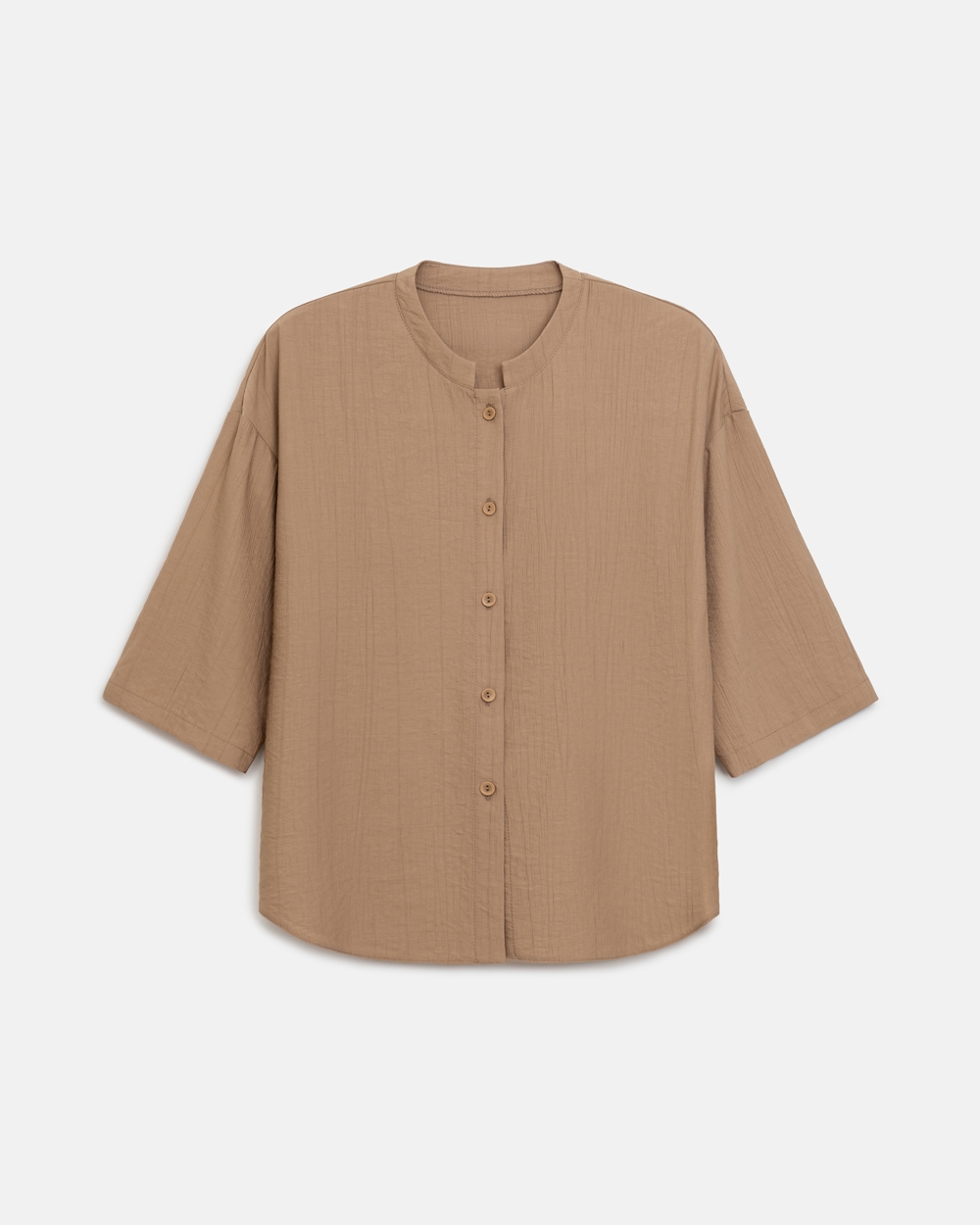 Сорочка із легкої віскозної тканини. Модель прямого вільного силуету. Горловина оформлена лаконічною планкою.
